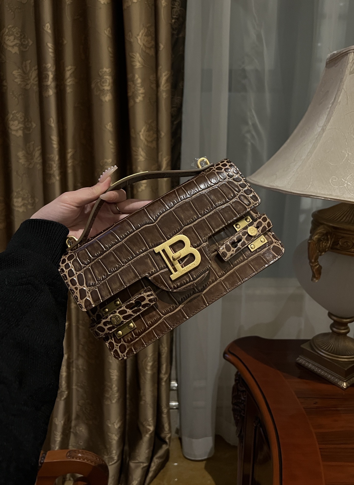 Indulge in the ultimate accessory with our Balmain B-Buzz Croc-Embossed Leather Top Handle Bag. This masterpiece combines the raw power of exotic textures with the refined elegance of Parisian design. The rich chocolate brown hue, highlighted by natural-looking scale variations, makes this bag a versatile staple for the modern woman who demands both style and substance.
