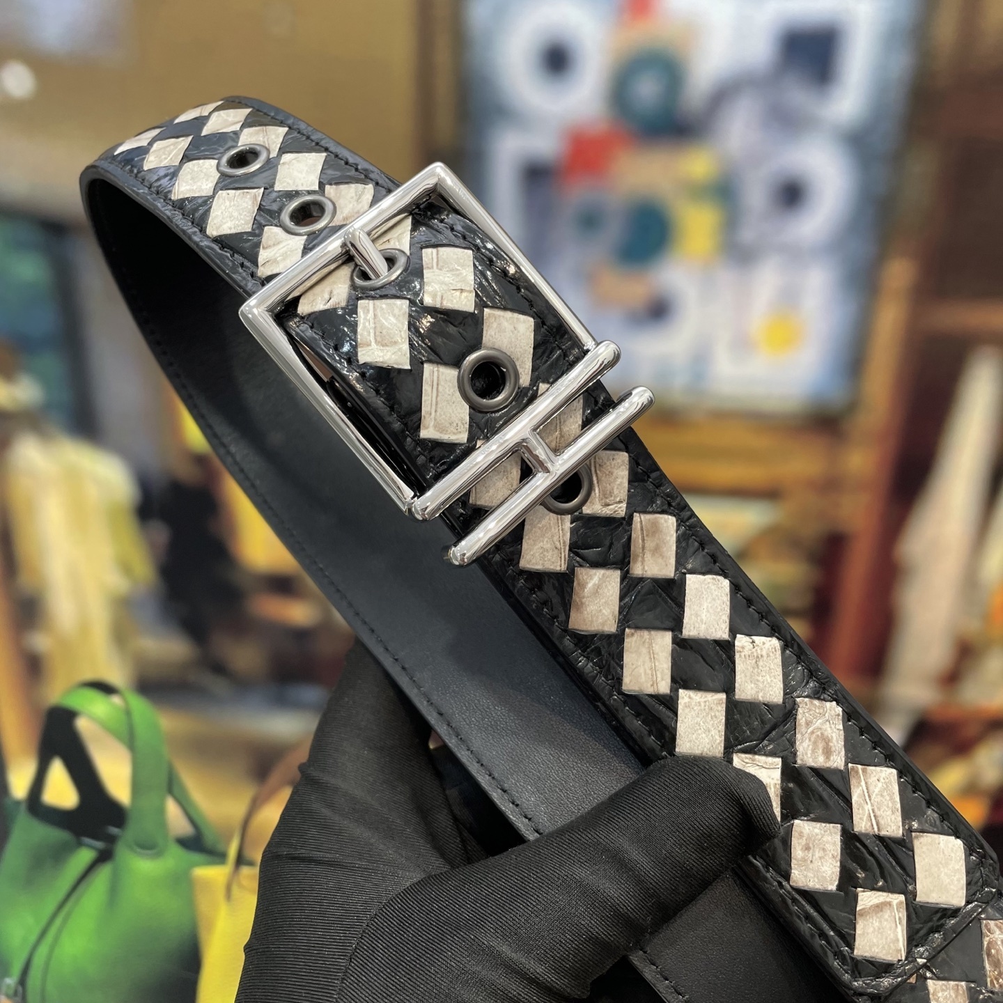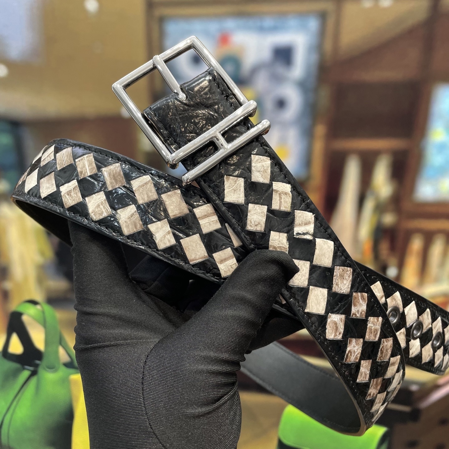 • Iconic Woven Design: Features the signature Intrecciato weave in a striking black and off-white diamond pattern, creating a bold visual statement.