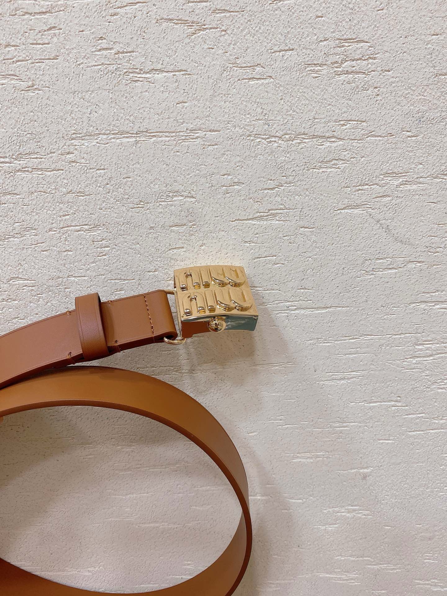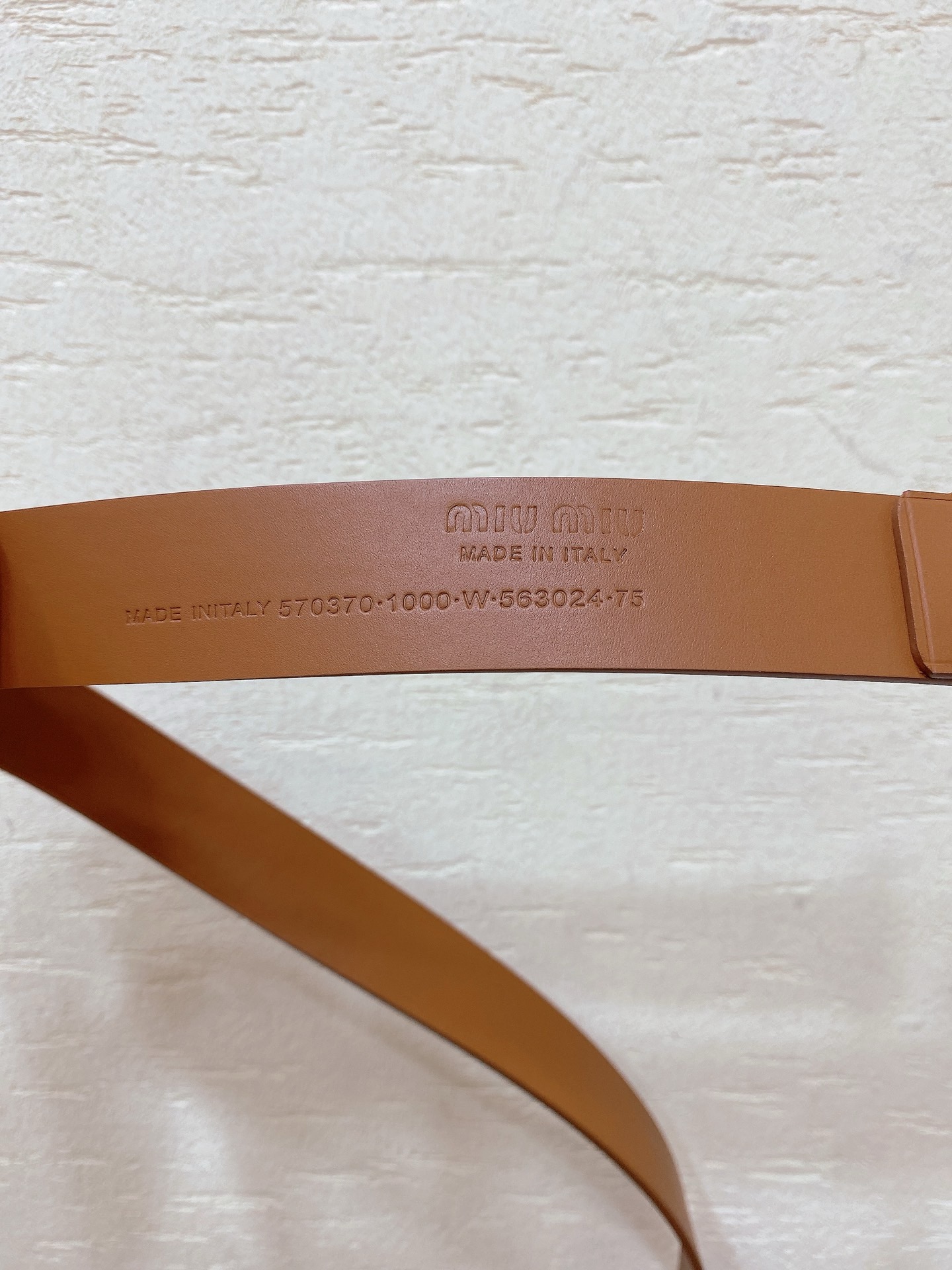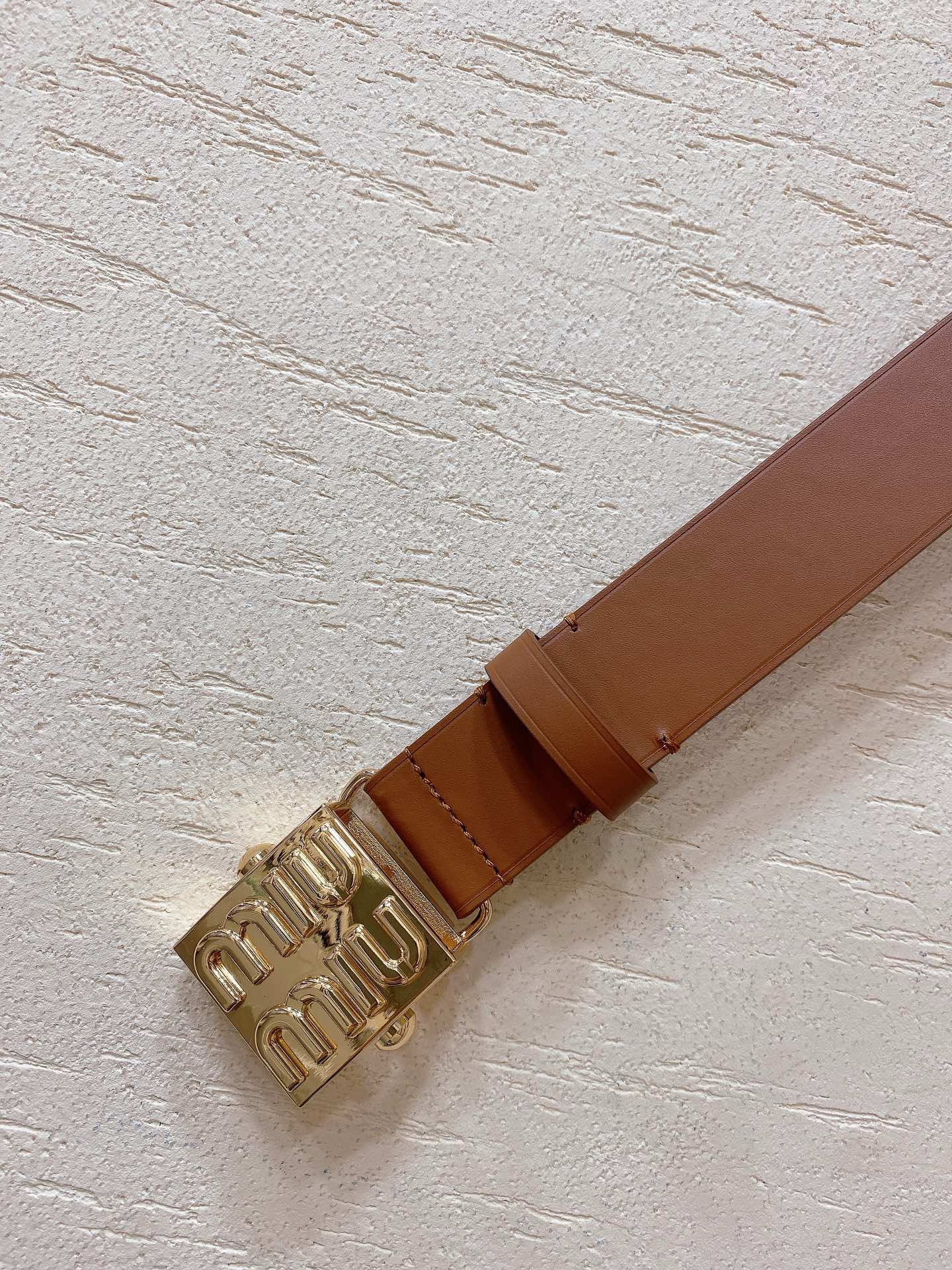 Brown leather belt with gold metal buckle engraved with Miu Miu