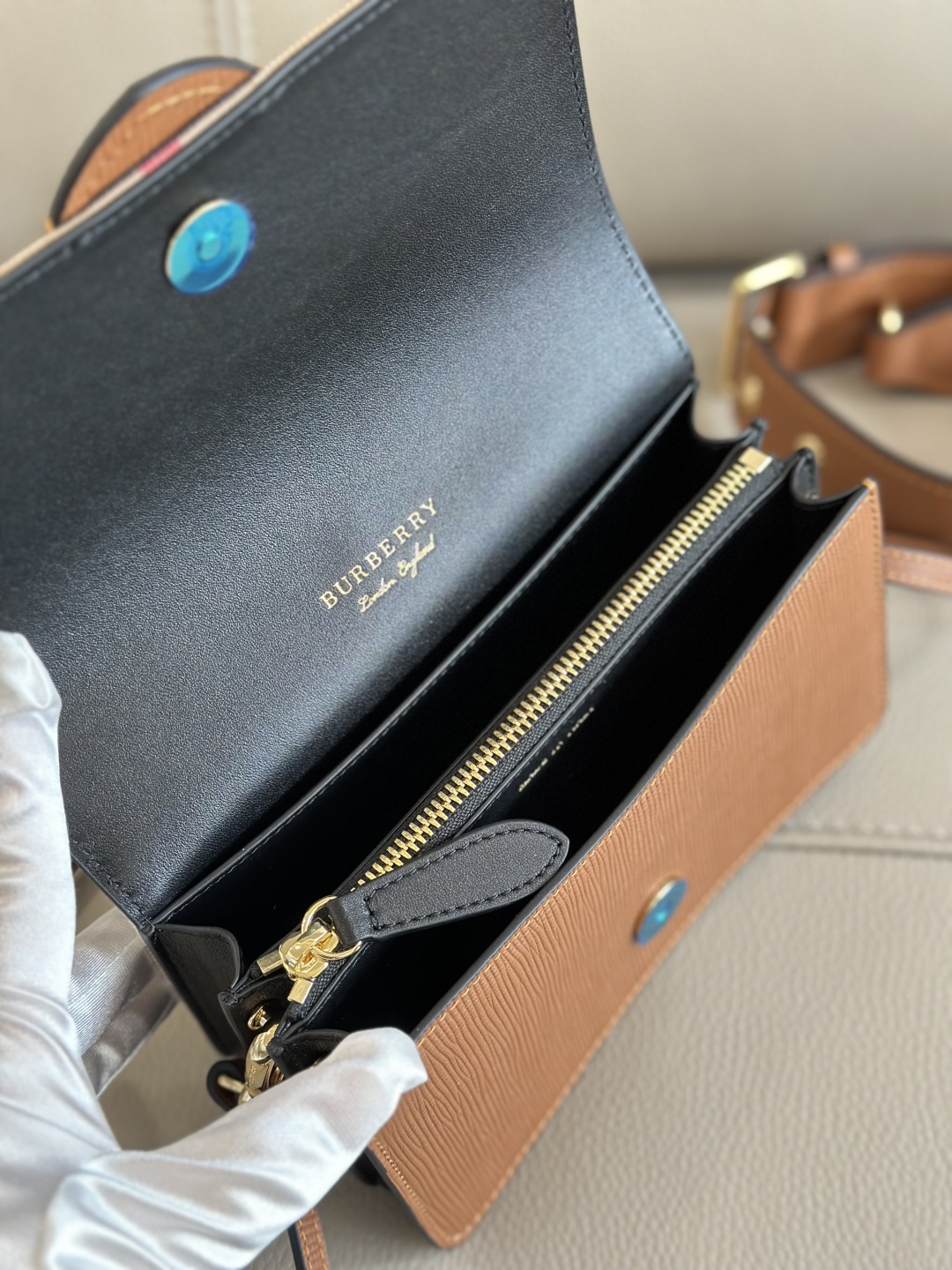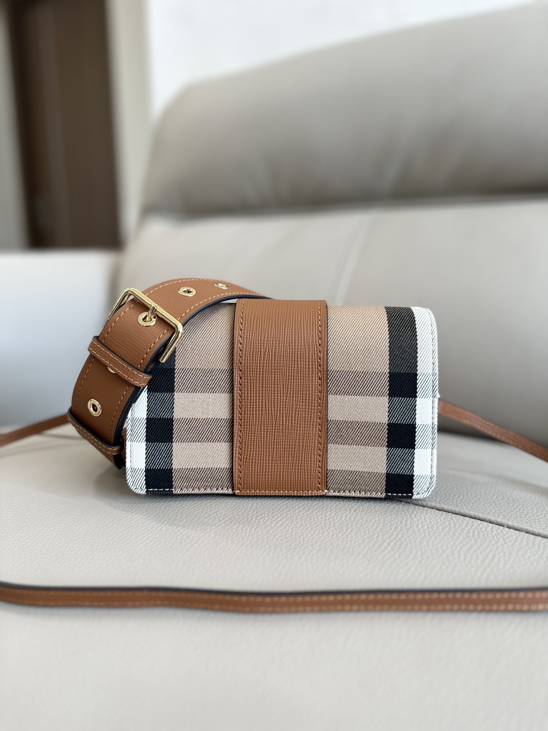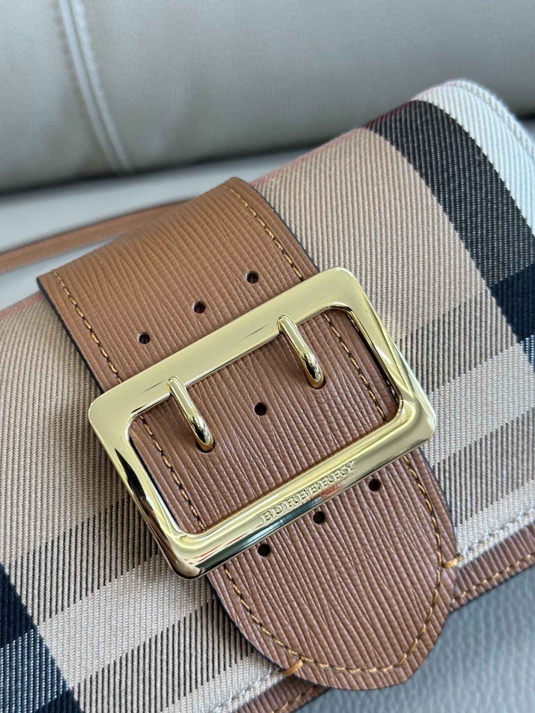 BURBERRY House Check Bridle Calfskin Small Madison Buckle Bag Tan 1253979 |