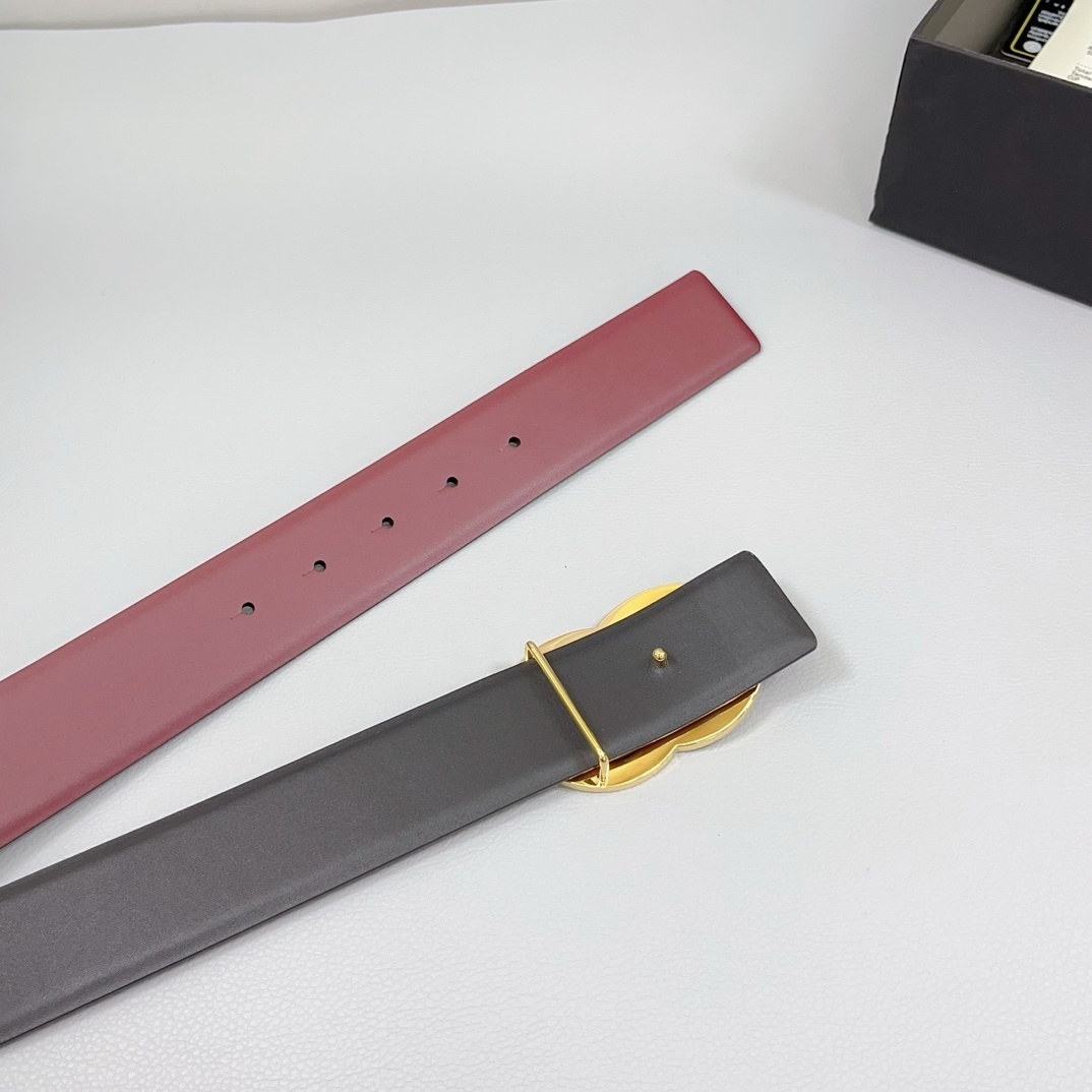 This designer belt is meticulously crafted from high-quality smooth leather, ensuring both durability and a soft, luxurious feel. The dual-tone design features a rich burgundy-red exterior paired with a classic black interior. Key features include: