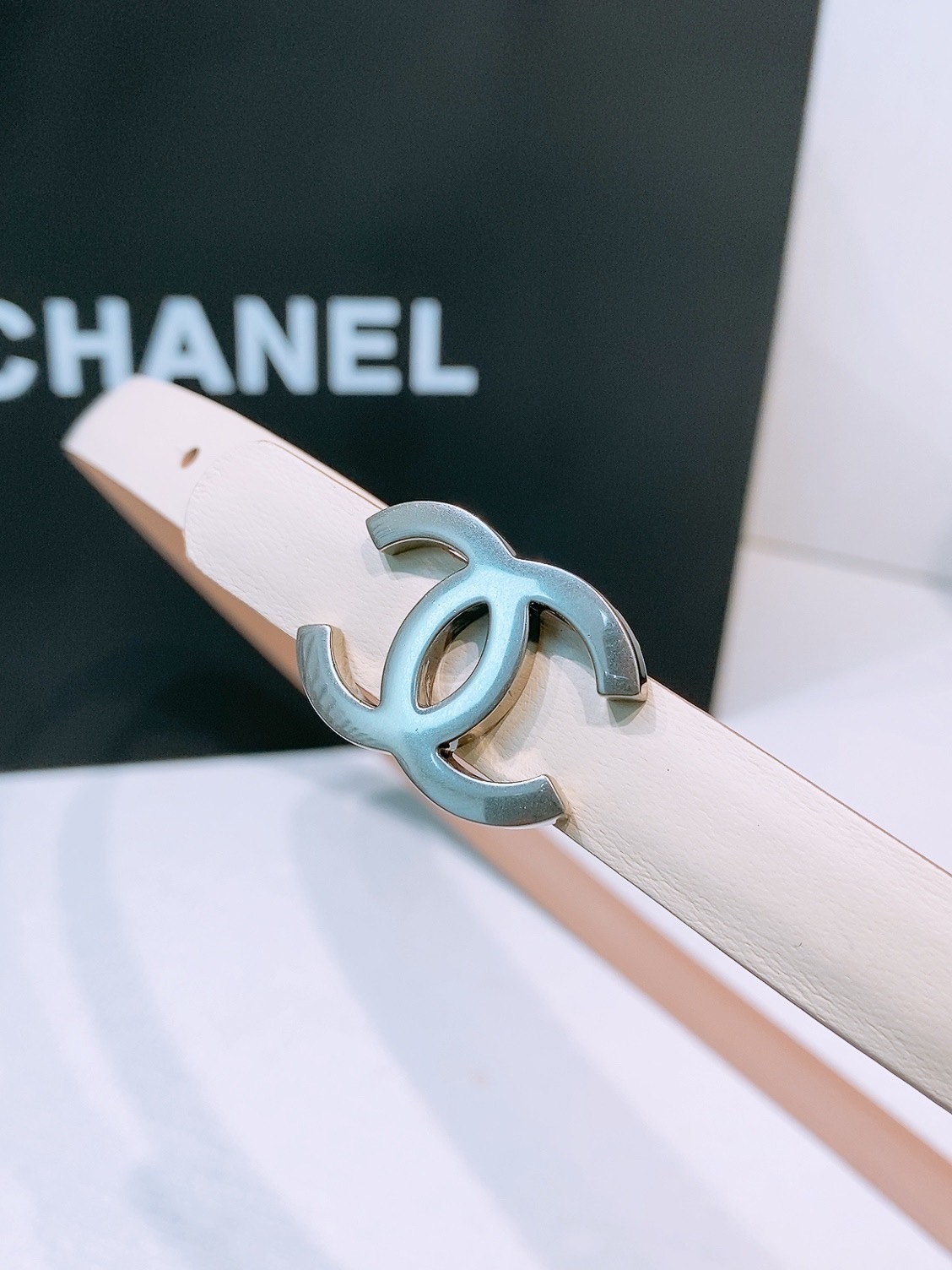 To preserve the beauty of your Chanel leather belt, avoid contact with water, oils, and perfumes. Store it in its original dust bag and box when not in use. Clean the silver buckle gently with a soft, dry microfiber cloth to maintain its brilliant shine and prevent oxidation.