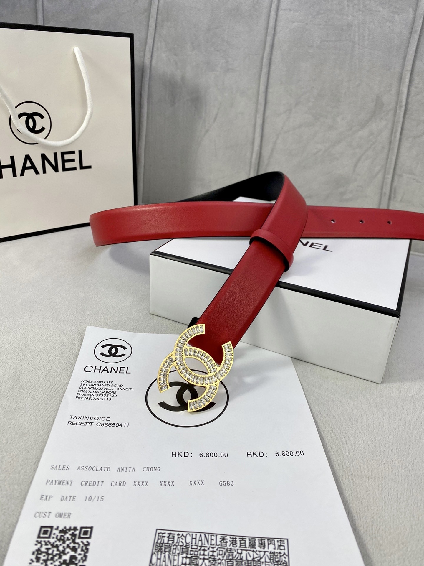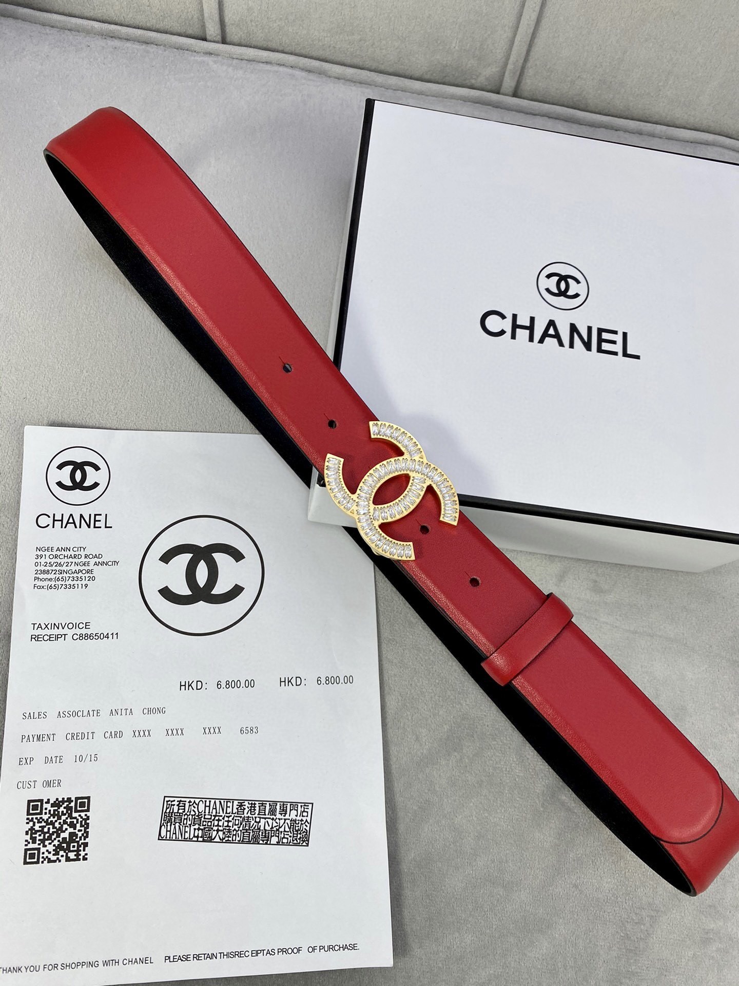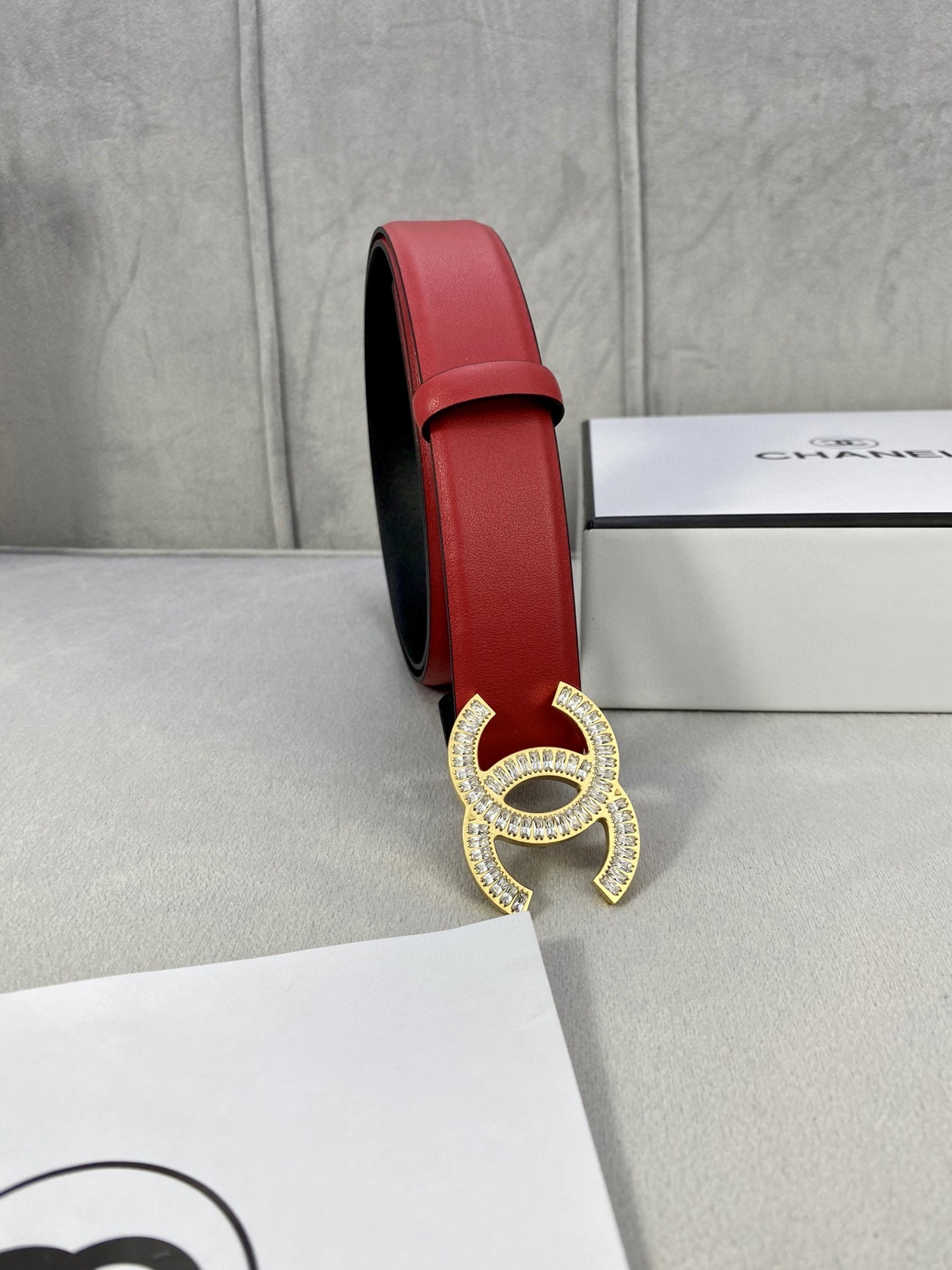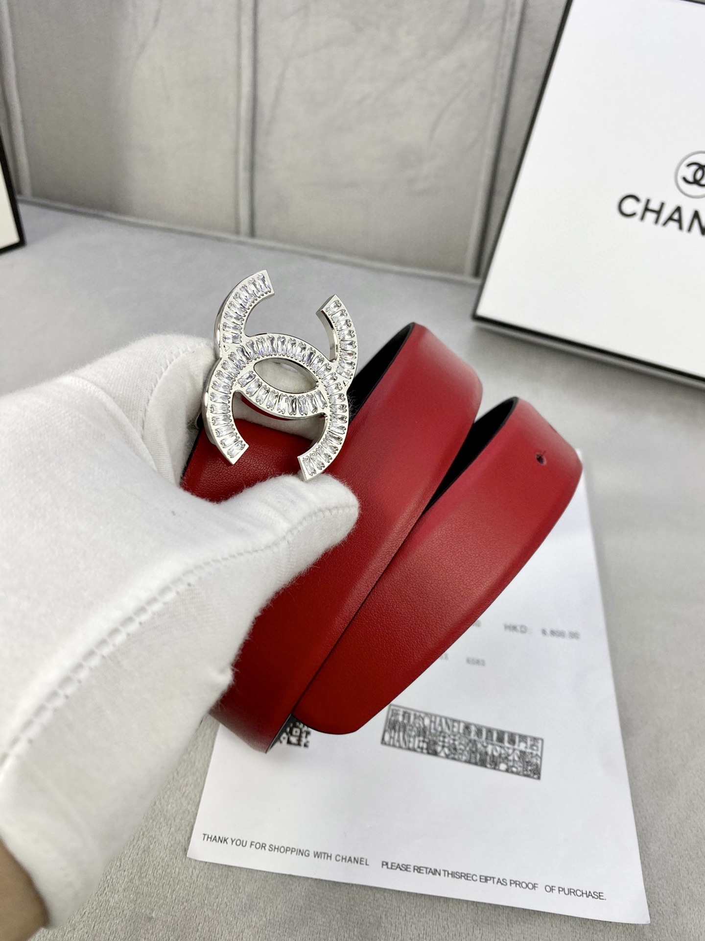 To preserve the beauty of your Chanel belt, store it in its original dust bag and box when not in use. Avoid contact with water, oils, and perfumes. Gently wipe the crystals with a soft, dry cloth to maintain their brilliant sparkle and keep the leather supple.