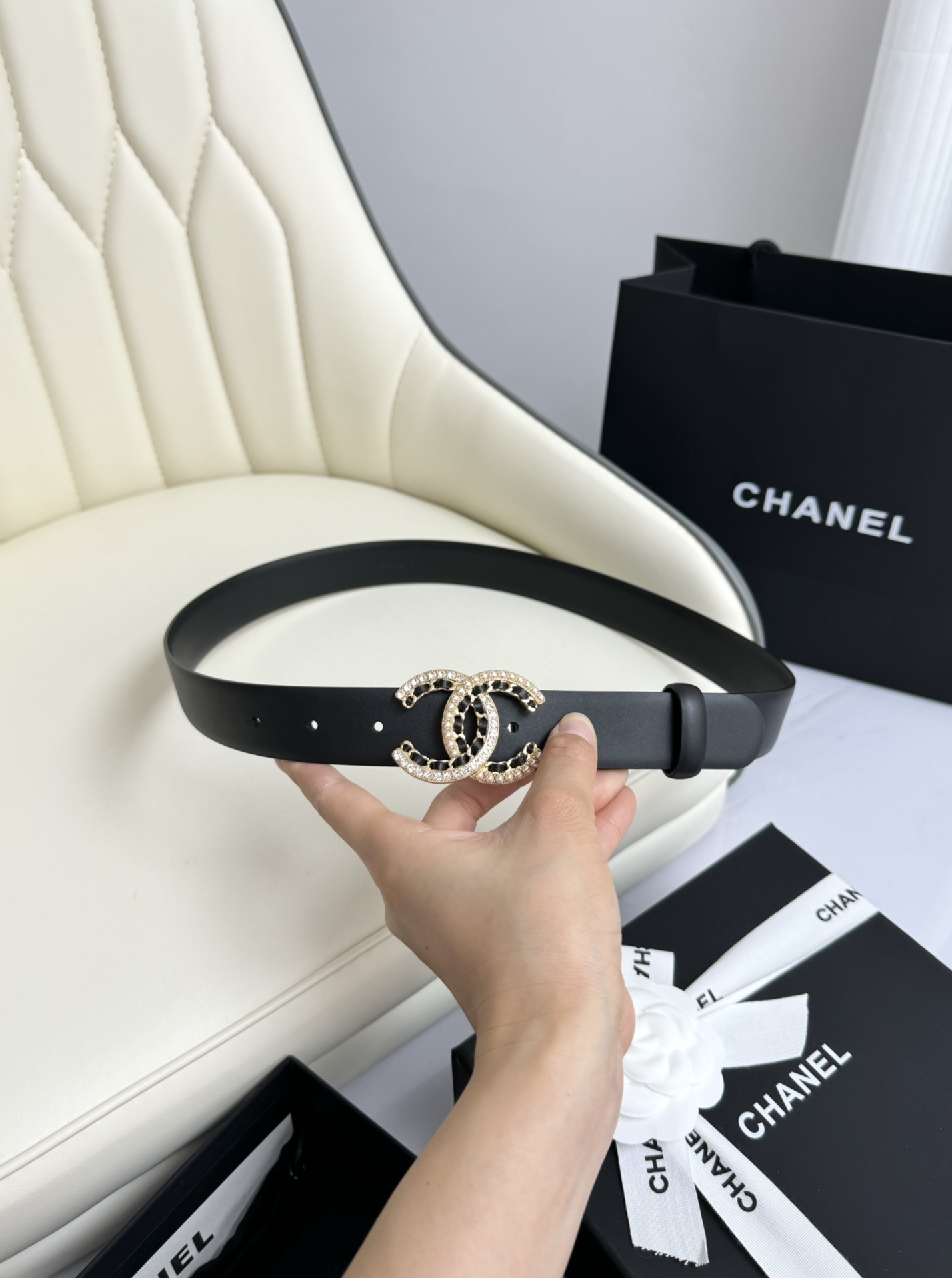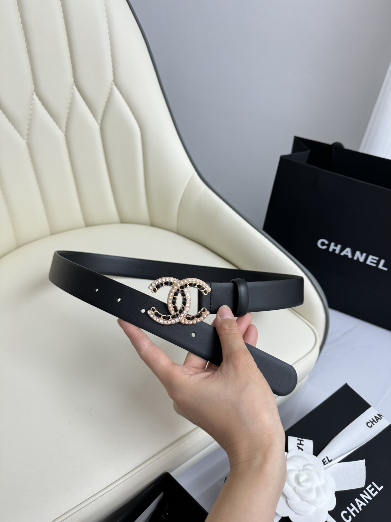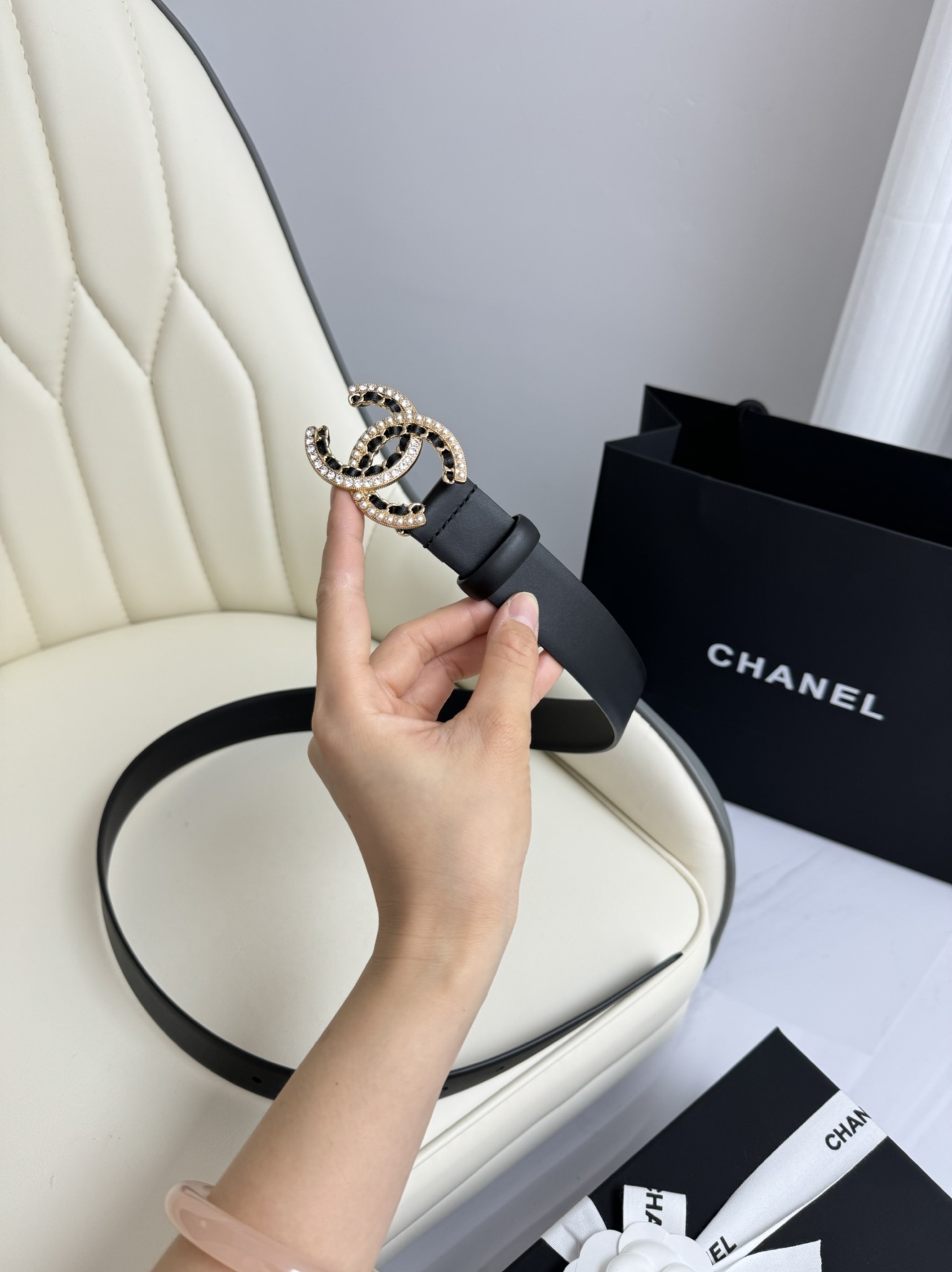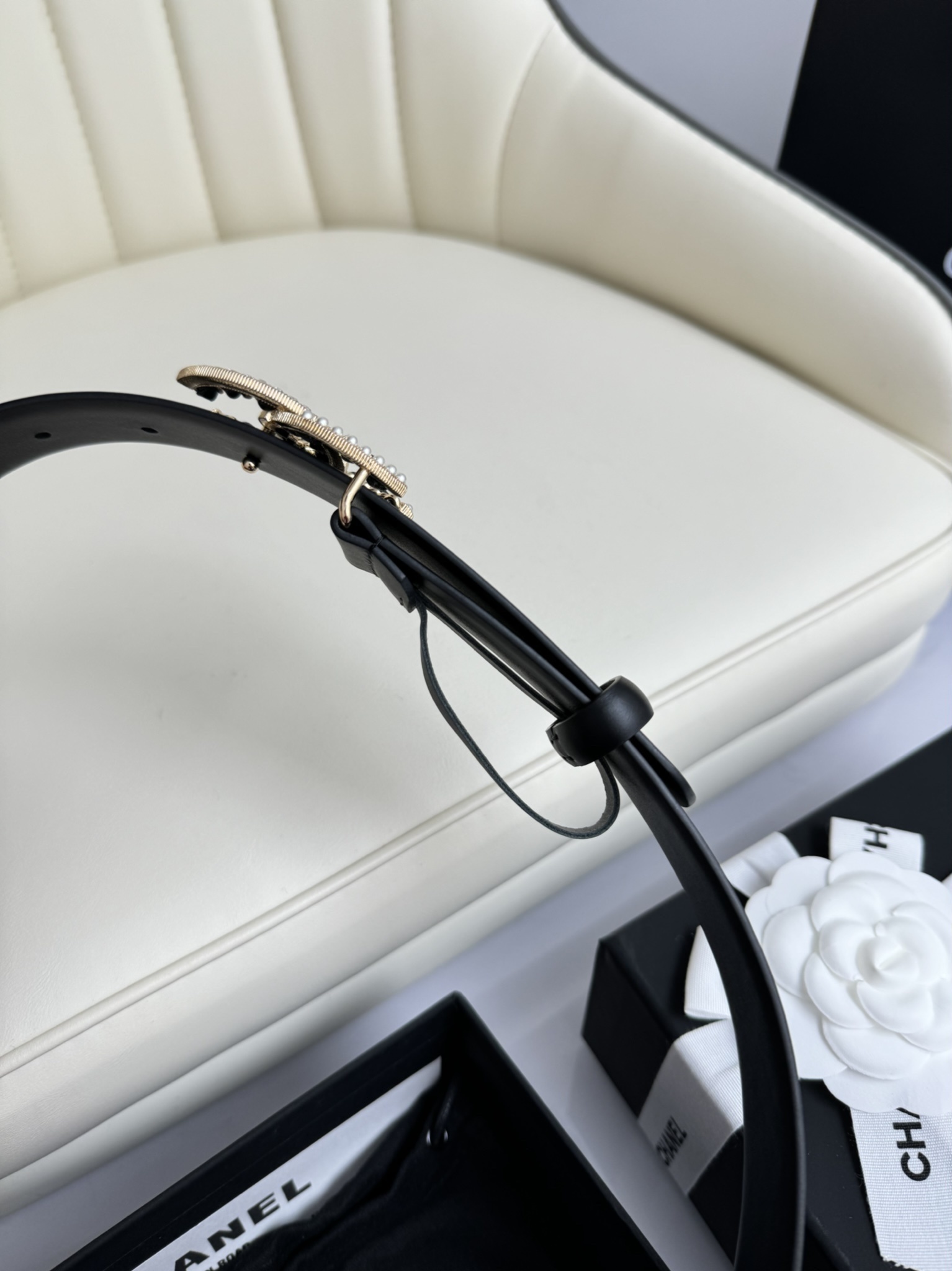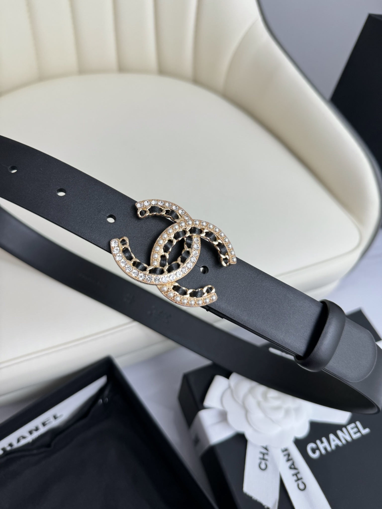 A Chanel belt is more than just a functional item; it is a profound investment in your personal style. The pearl-embellished buckle catches the light beautifully, drawing attention to your silhouette while signaling a refined taste in luxury goods. This item comes complete with original packaging, including the signature black box and dust bag, making it an ideal gift for yourself or a loved one.
