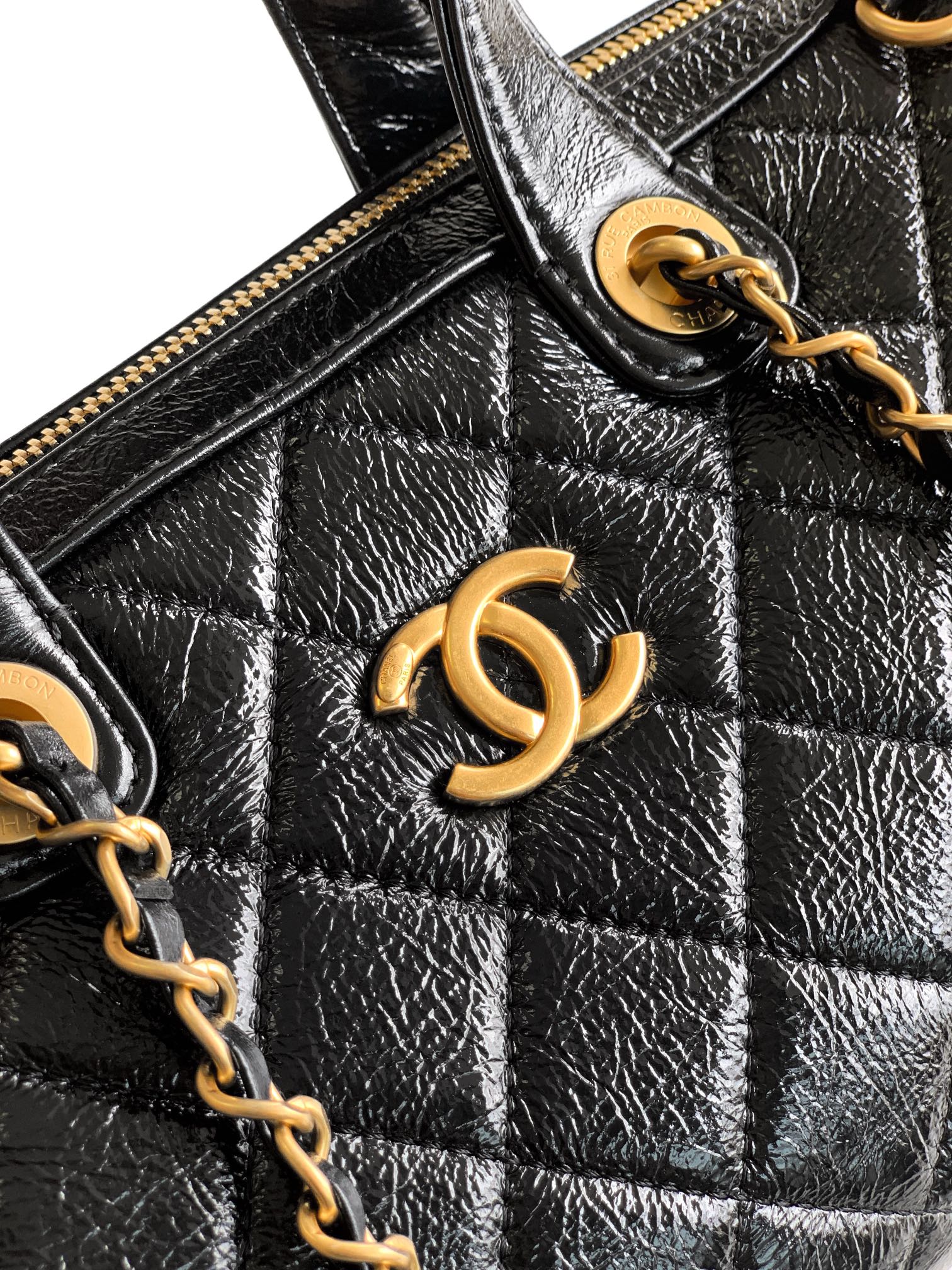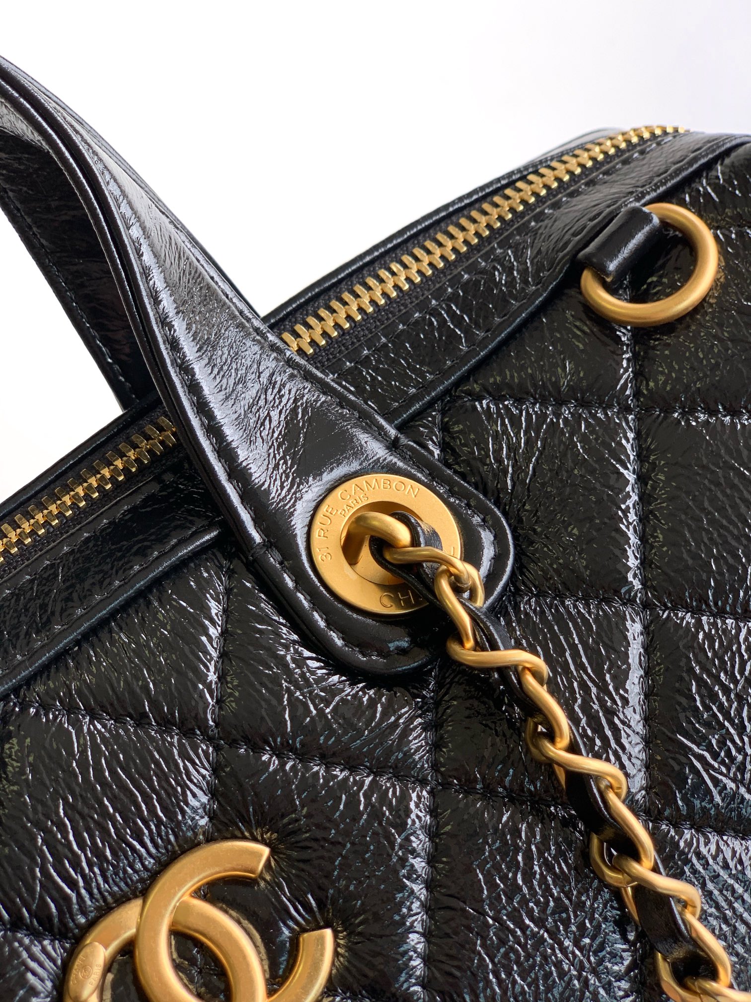 Chanel Maxi bowling bag, Patent crumpled calfskin & gold-tone pink
