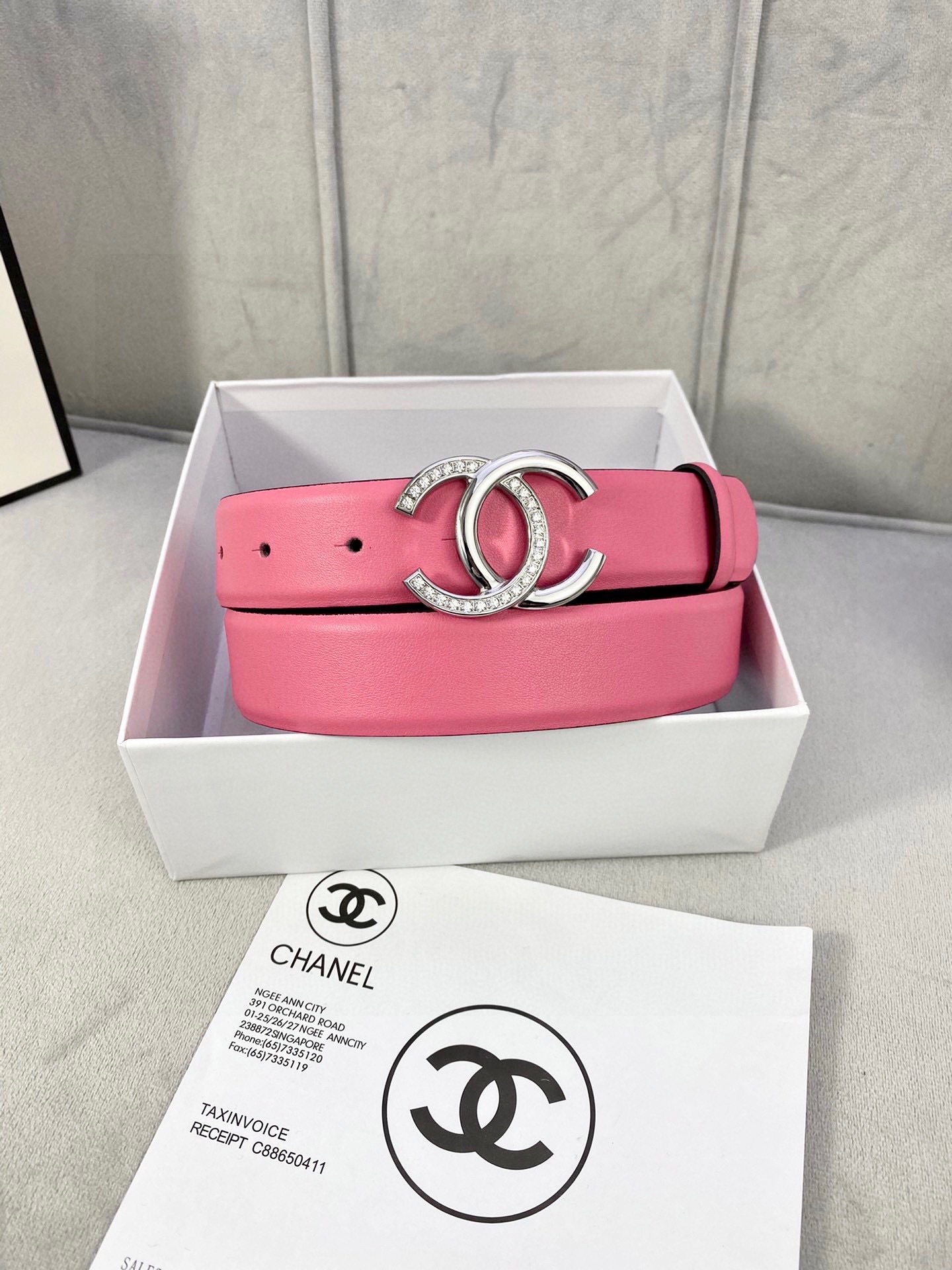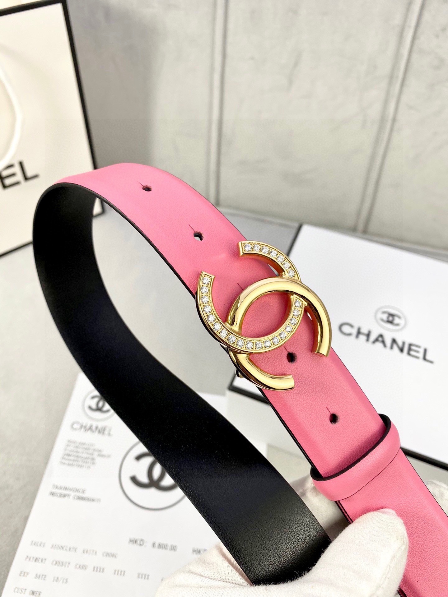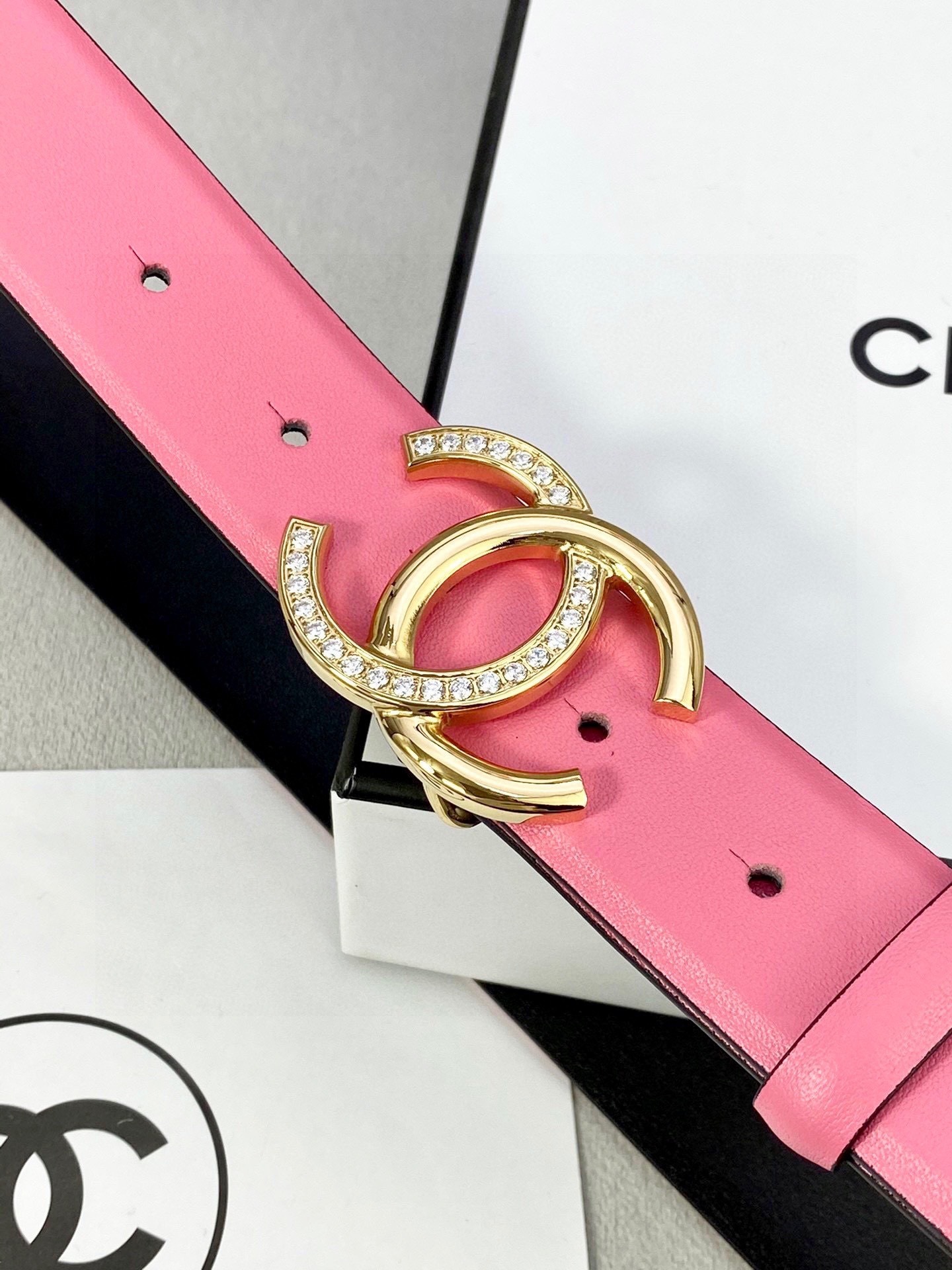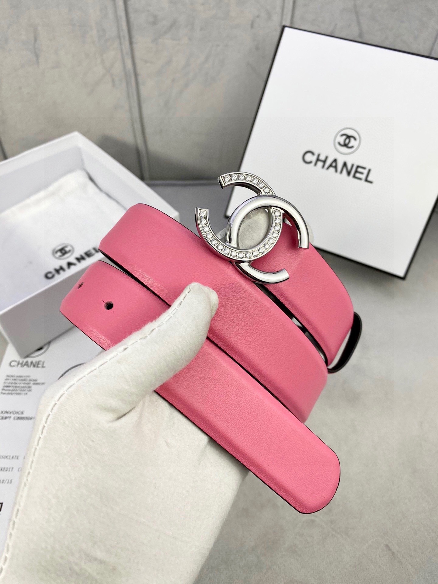 Chanel Pink Leather Belt with Crystal CC Buckle - Luxury Accessory