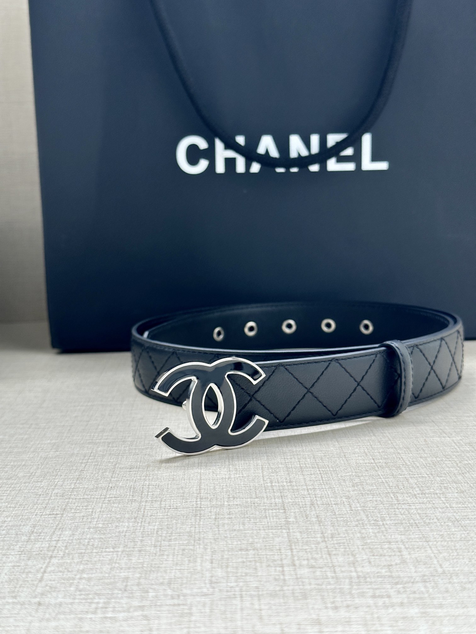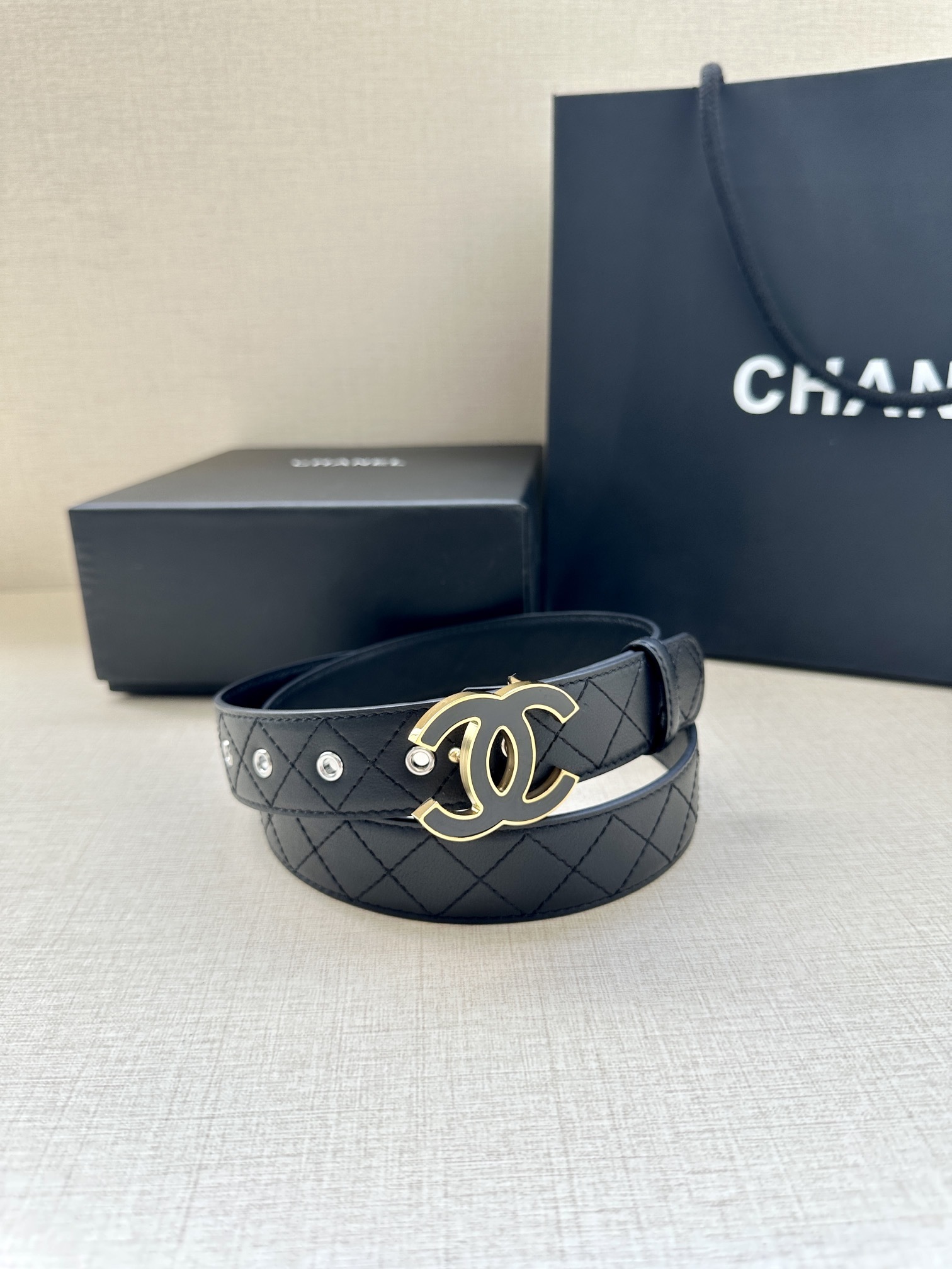 To preserve the beauty of your Chanel belt, we recommend storing it in its original dust bag when not in use. Avoid prolonged exposure to direct sunlight, heat, and moisture. For cleaning, simply wipe with a soft, dry cloth to maintain the luster of the leather and the shine of the hardware.