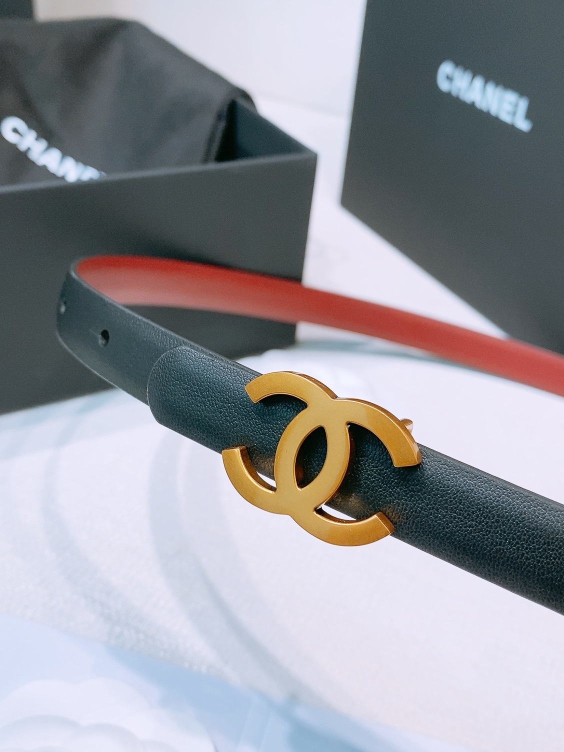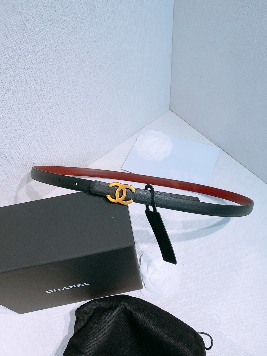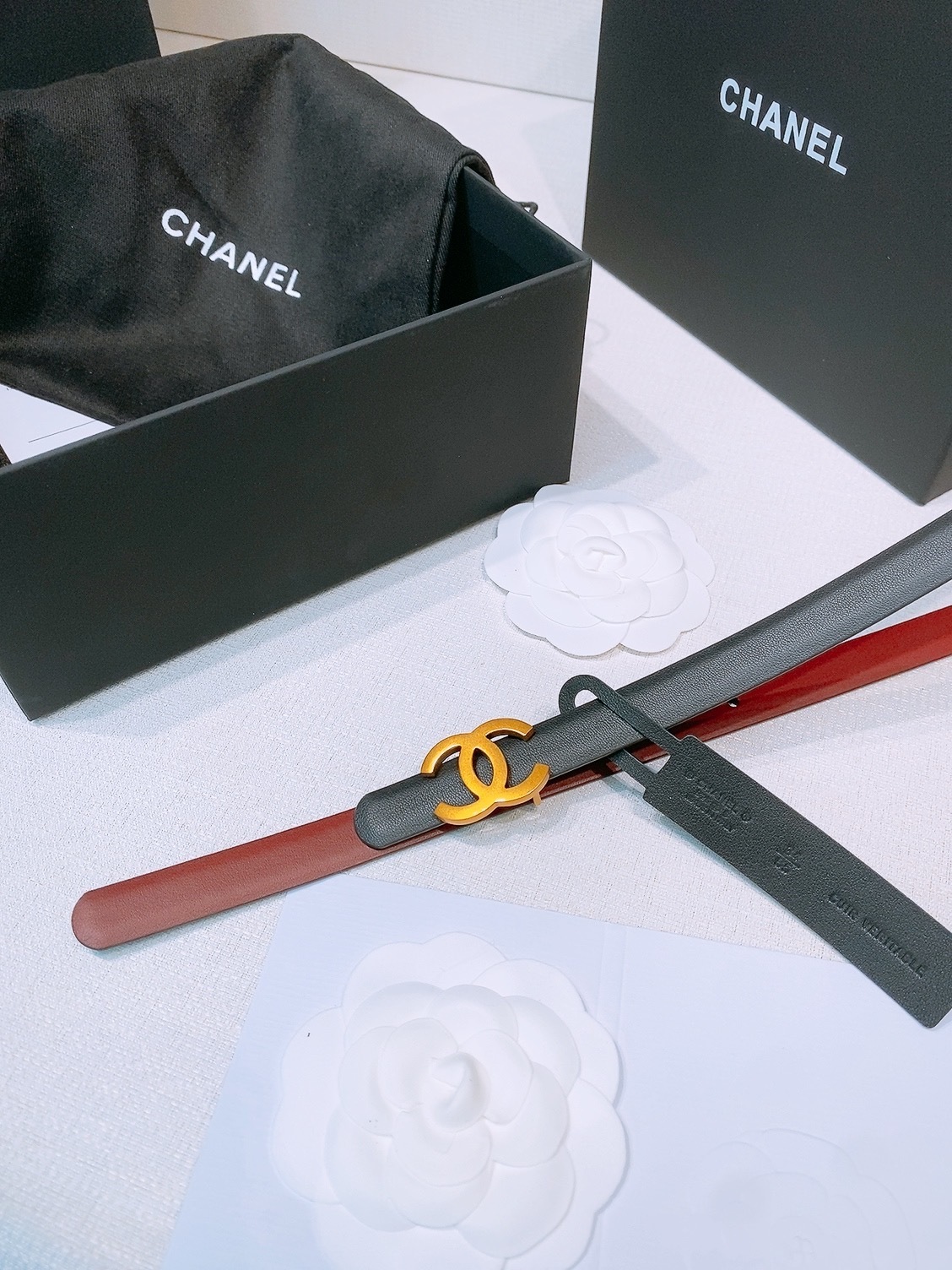 To preserve the beauty of your Chanel belt, avoid contact with water, oils, and perfumes. When not in use, store it in the provided dust bag and original box to maintain its shape and finish. Clean gently with a soft, dry cloth to keep the leather and hardware looking pristine.