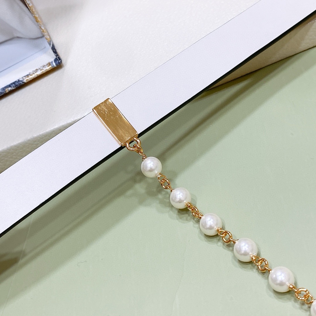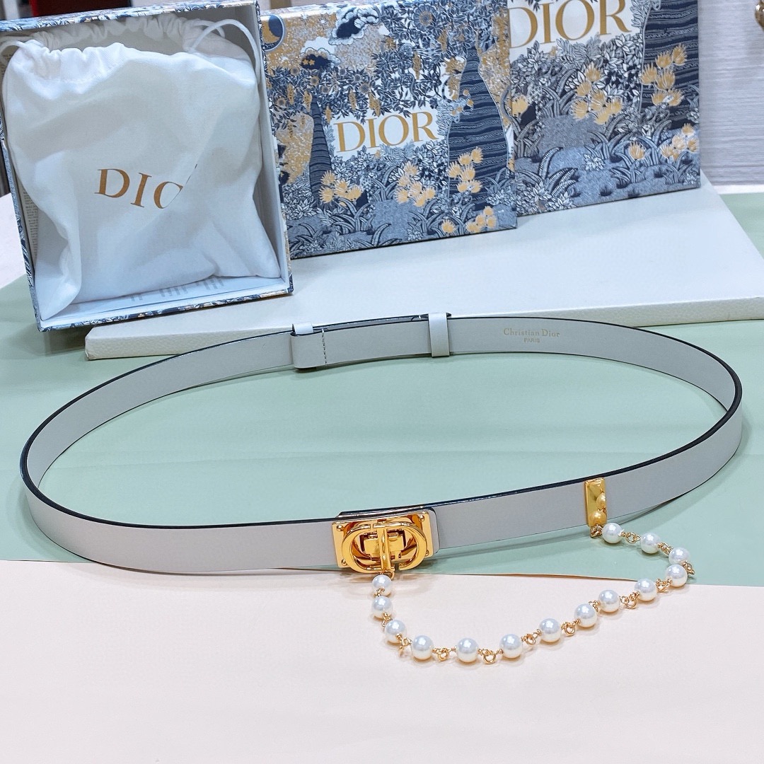 Dior belt with a "CD" buckle, accompanied by a string of pearls.