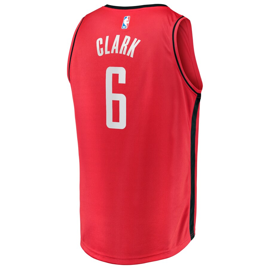 The striking red base of this Icon Edition jersey immediately grabs attention, embodying the fiery spirit of the Houston Rockets. Bold white lettering for "ROCKETS" on the front and "CLARK" on the back, along with the prominent number '6', ensures player and team recognition.