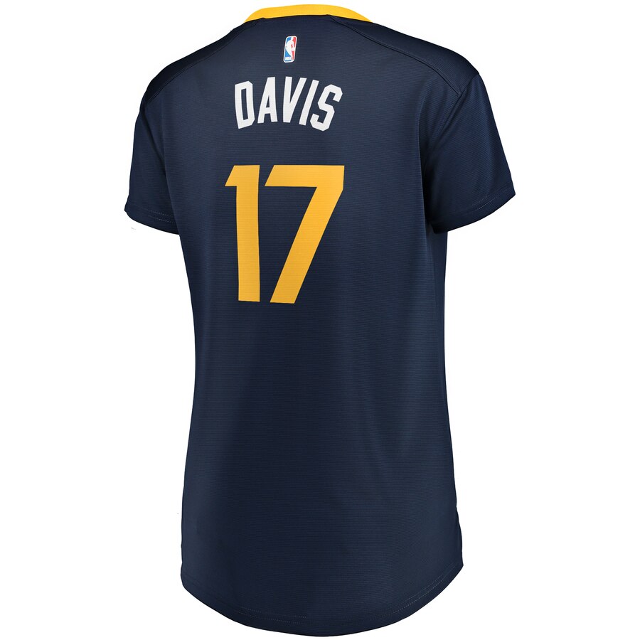 The design of this Ed Davis Fast Break Player Jersey is a tribute to the Utah Jazz's iconic visual identity. The deep navy blue base color is accented by striking gold trim around the V-neck, reflecting the team's primary colors. The front proudly displays the stylized "JAZZ" logo in white, with a unique basketball graphic integrating green and yellow hues, alongside the prominent number 17 in gold.