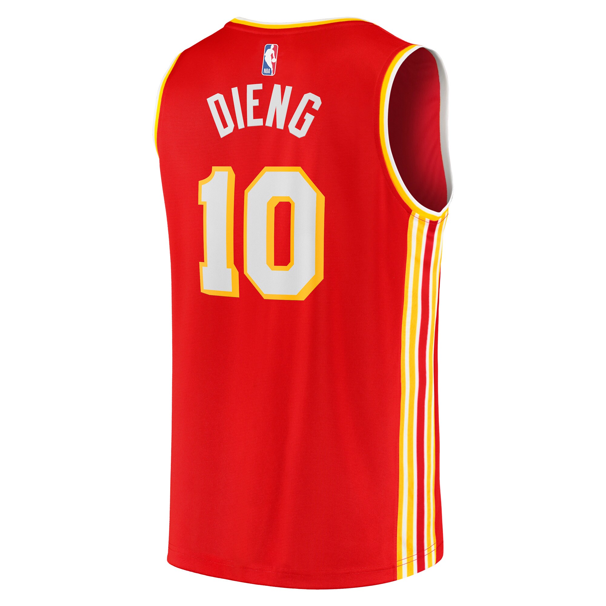 The design of this Fanatics Youth Dieng Hawks Jersey is a faithful reproduction of the 'Icon Edition' worn by the pros. Its dominant red hue symbolizes the fiery spirit of the Atlanta Hawks, complemented by bold white and yellow accents that define the team's aesthetic. The 'ATLANTA' wordmark across the chest and Dieng's number 10 are meticulously heat-sealed, providing a sleek and professional finish that resists peeling and fading.