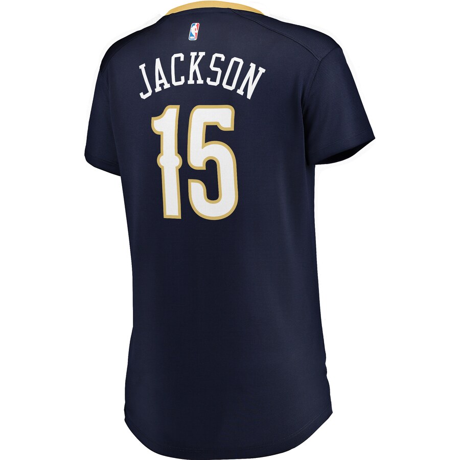 The Icon Edition of the New Orleans Pelicans jersey features the classic navy blue, accented with striking gold trim around the V-neck. This colorway embodies the team's identity and heritage. The bold 'NEW ORLEANS' lettering across the chest, paired with Jackson's number '15', makes an unmistakable statement.