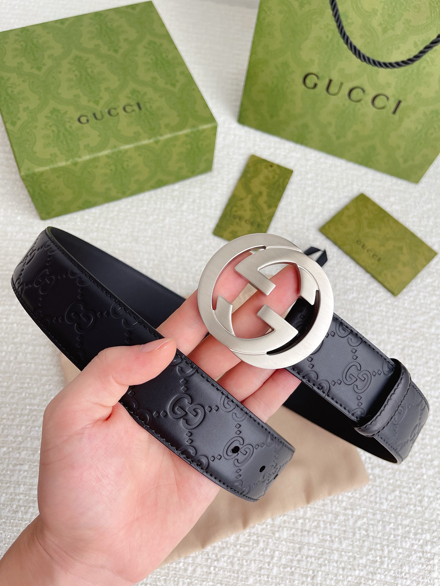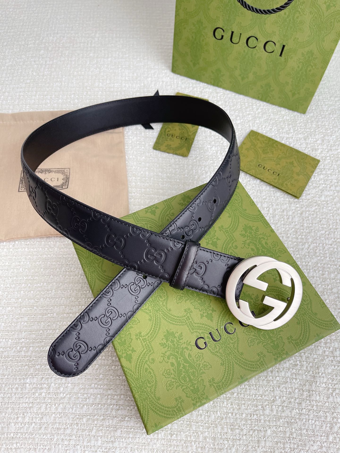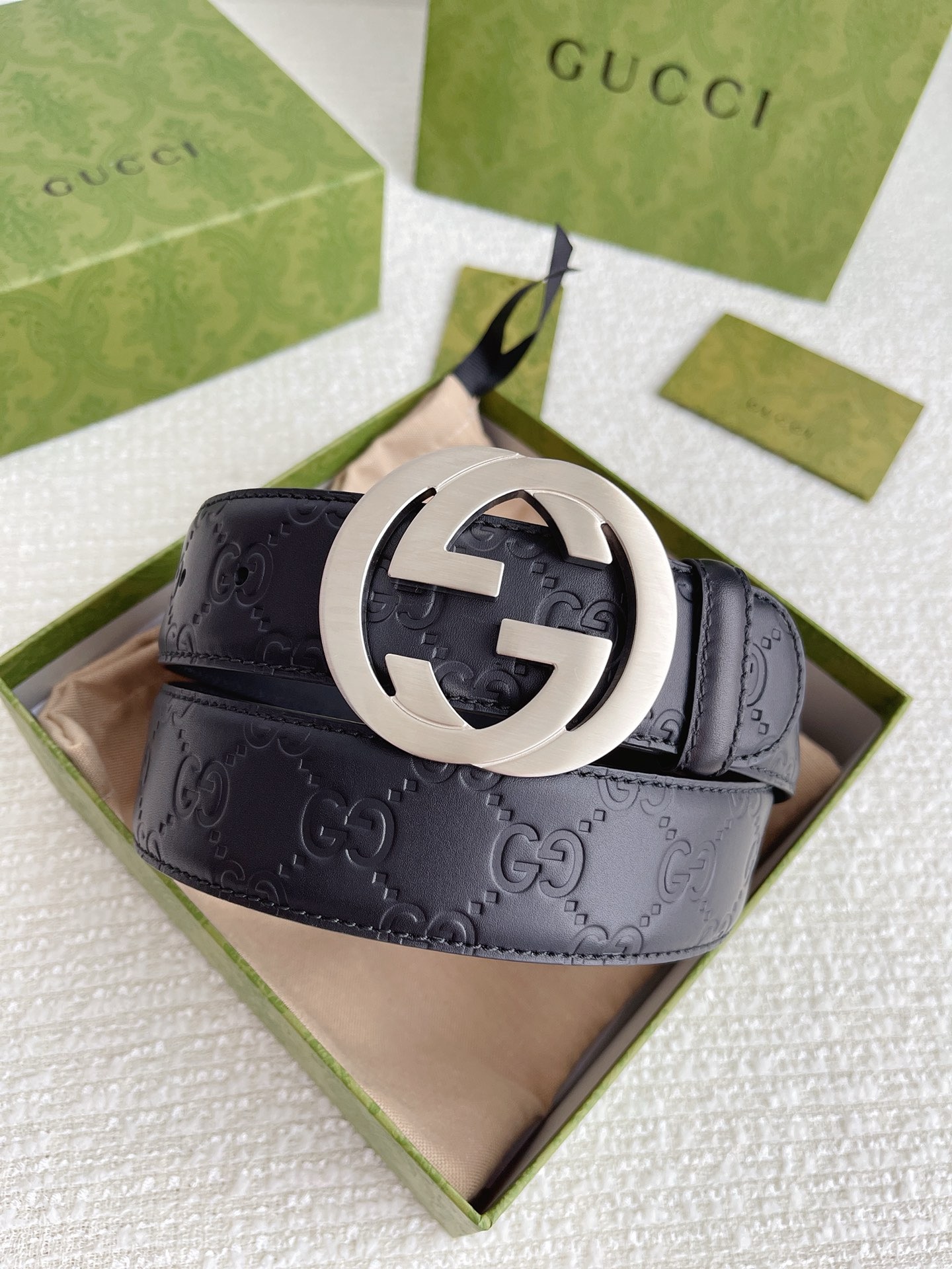 GUCCI GG Supreme Interlocking G Leather Black Mens Belt 411924 Used