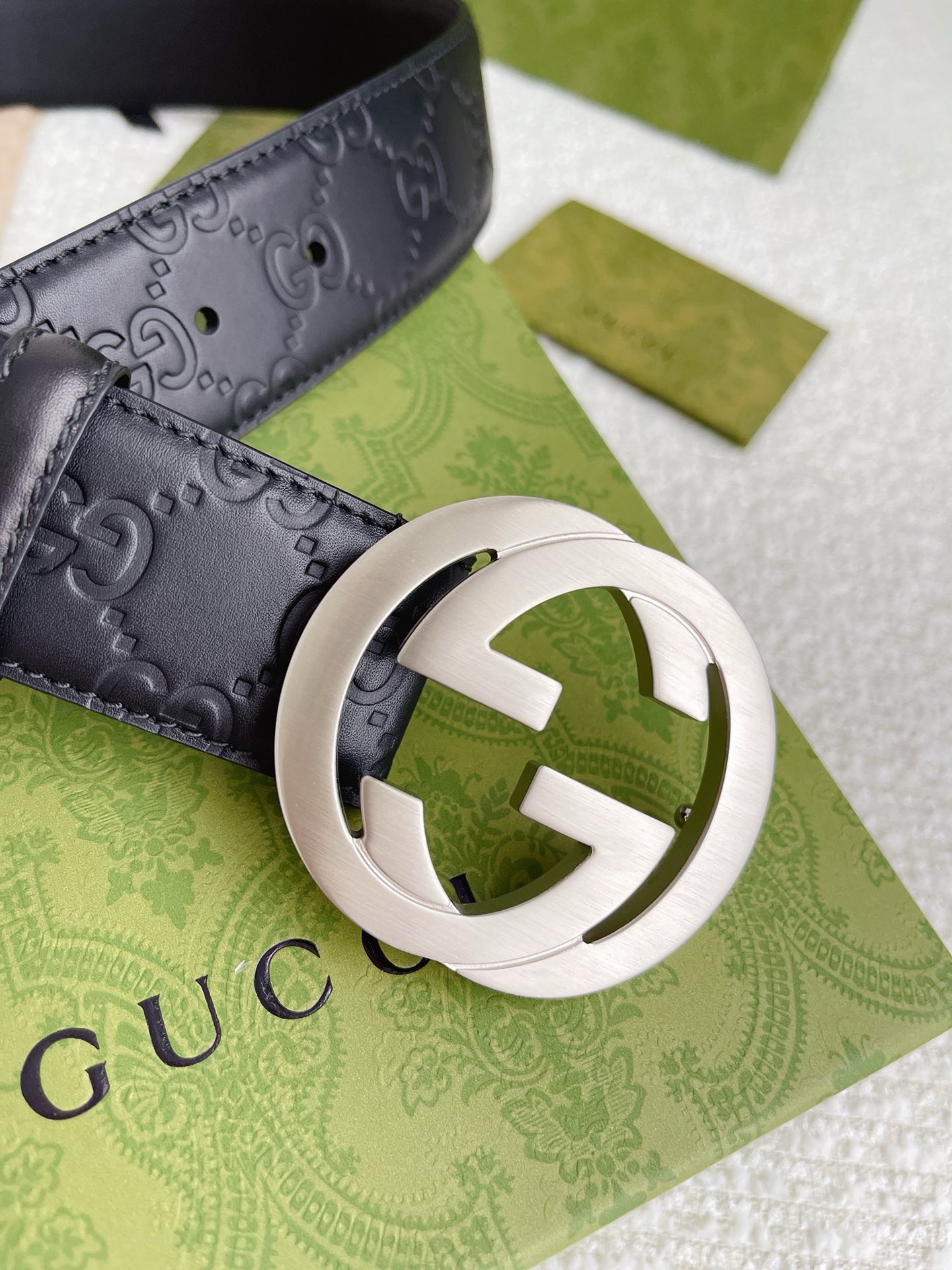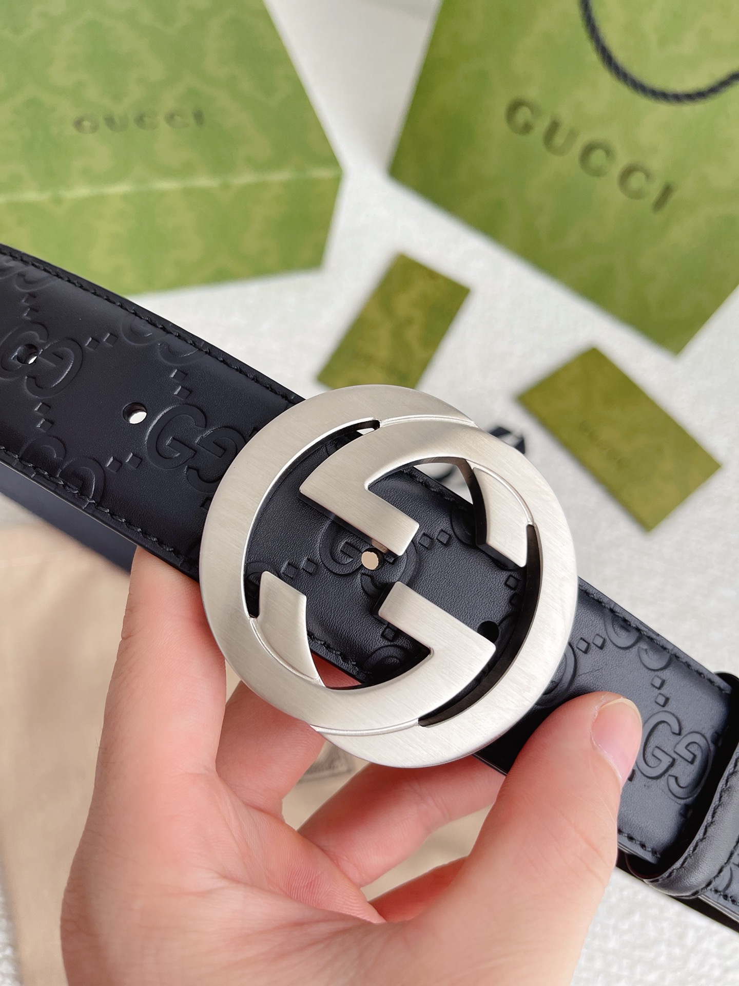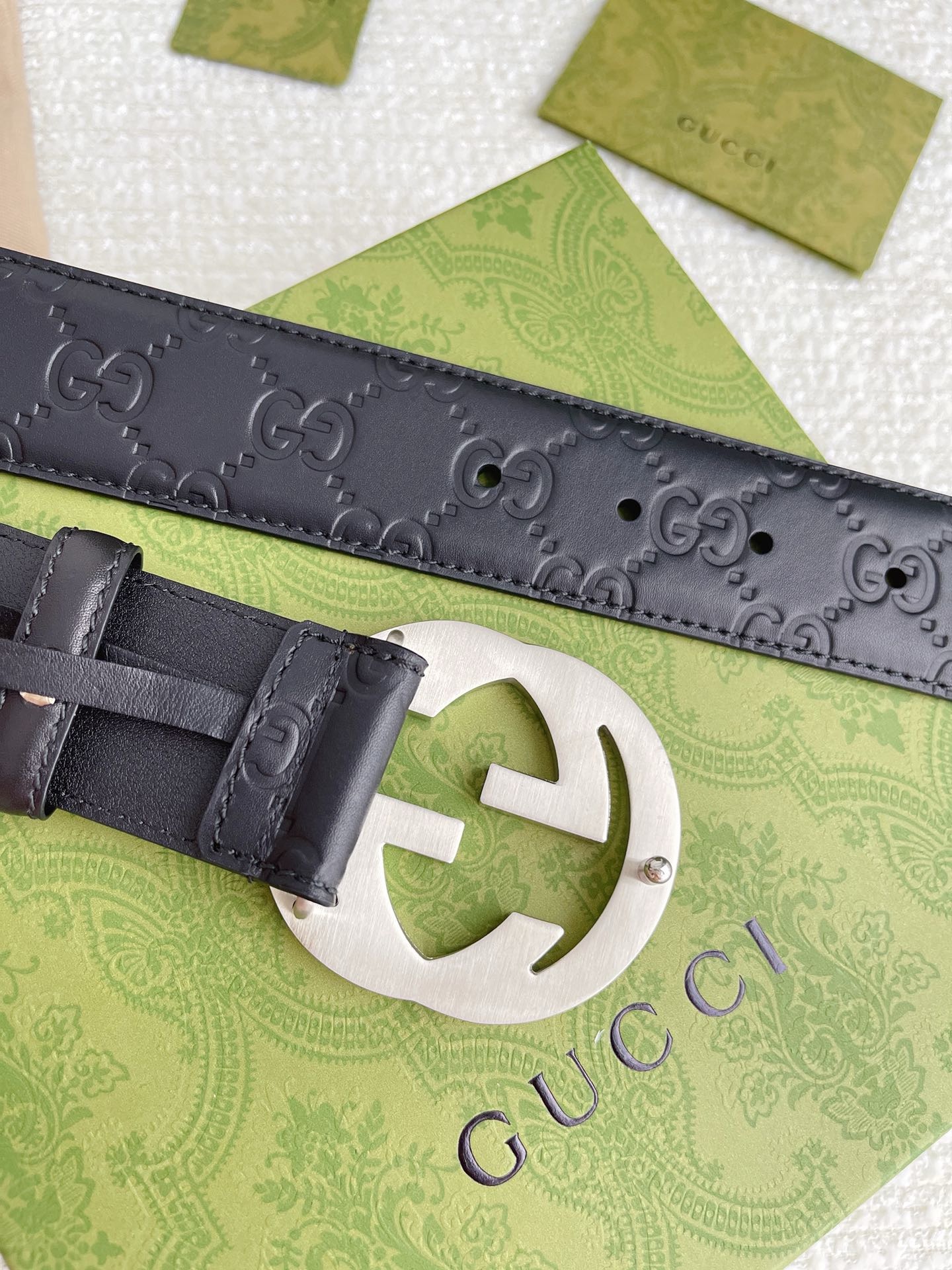 GUCCI GG Supreme Interlocking G Leather Black Mens Belt 411924 Used