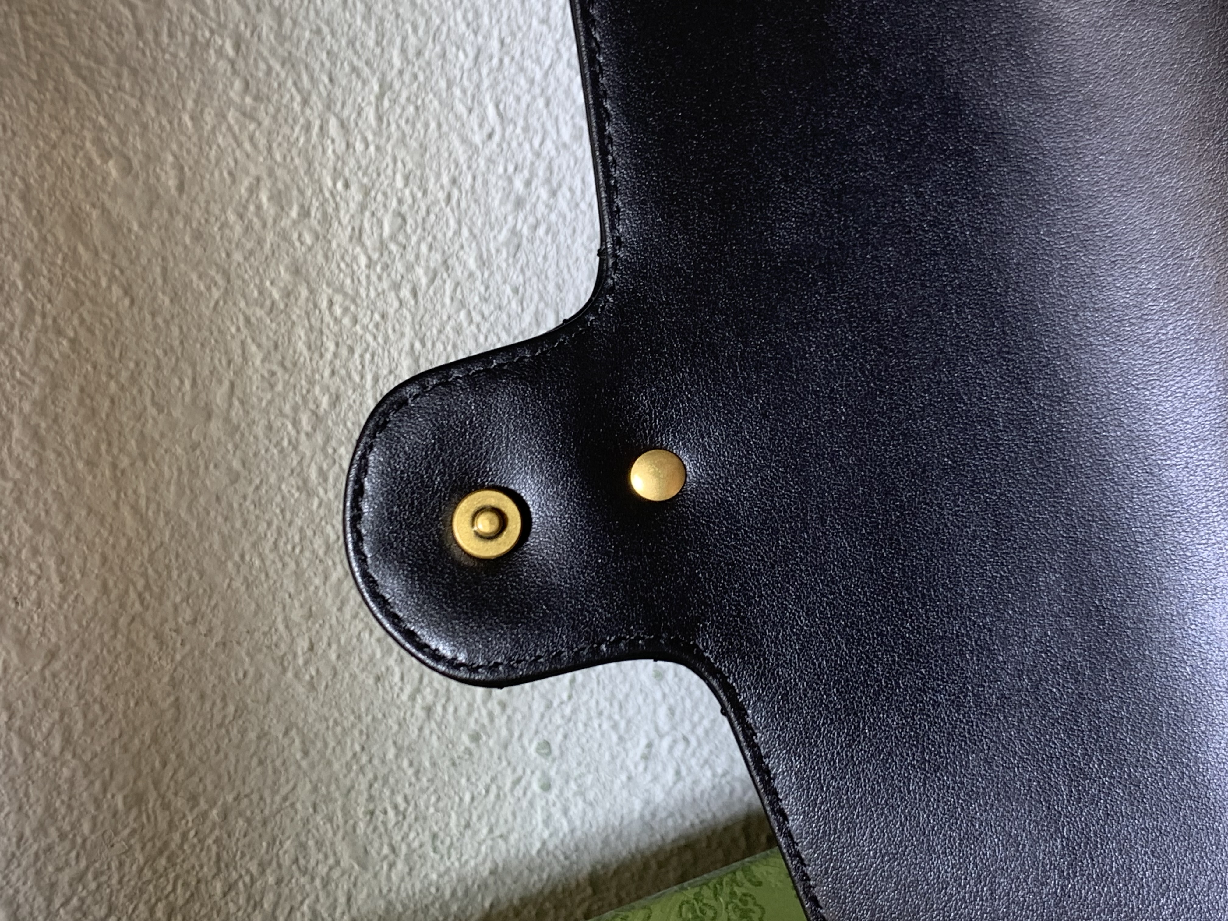 The hardware features an antique gold-tone finish, providing a vintage-inspired touch that complements the black leather perfectly. Its dimensions are approximately 22cm W x 13cm H x 6cm D, making it an ideal mini bag for various occasions. The interior includes a flat pocket, ensuring organized storage for your small necessities. This attention to detail reflects Gucci's unwavering commitment to luxury.