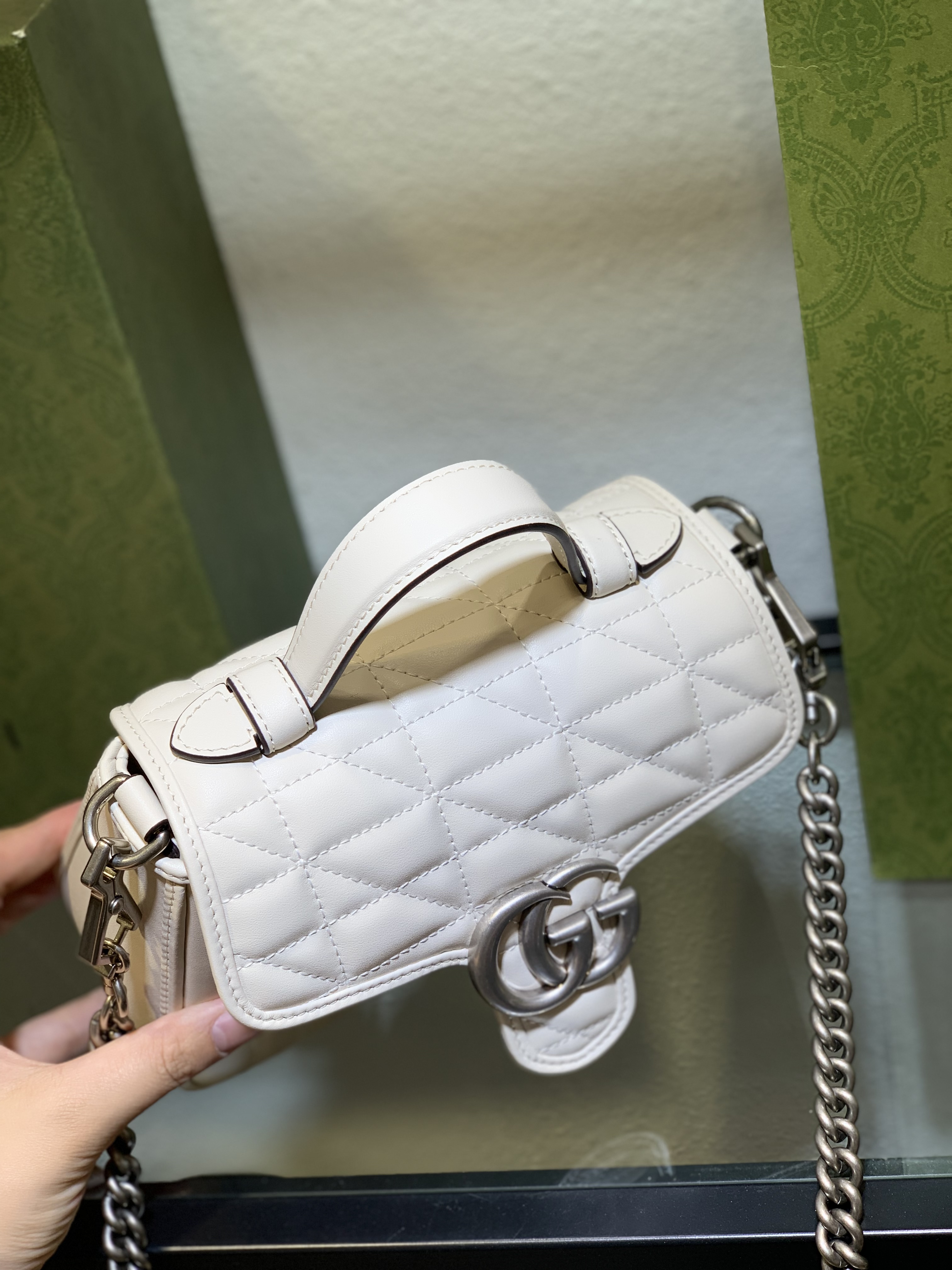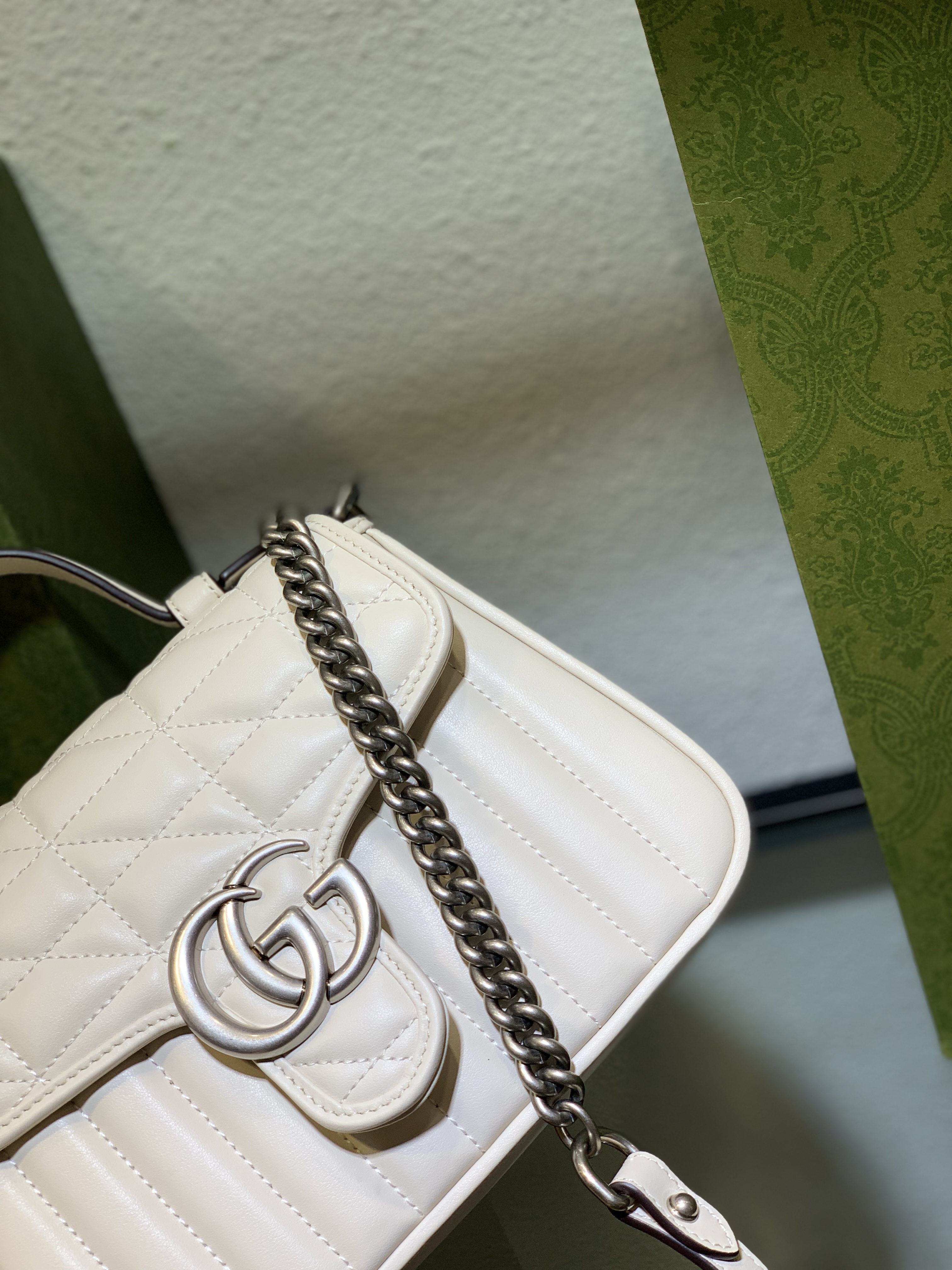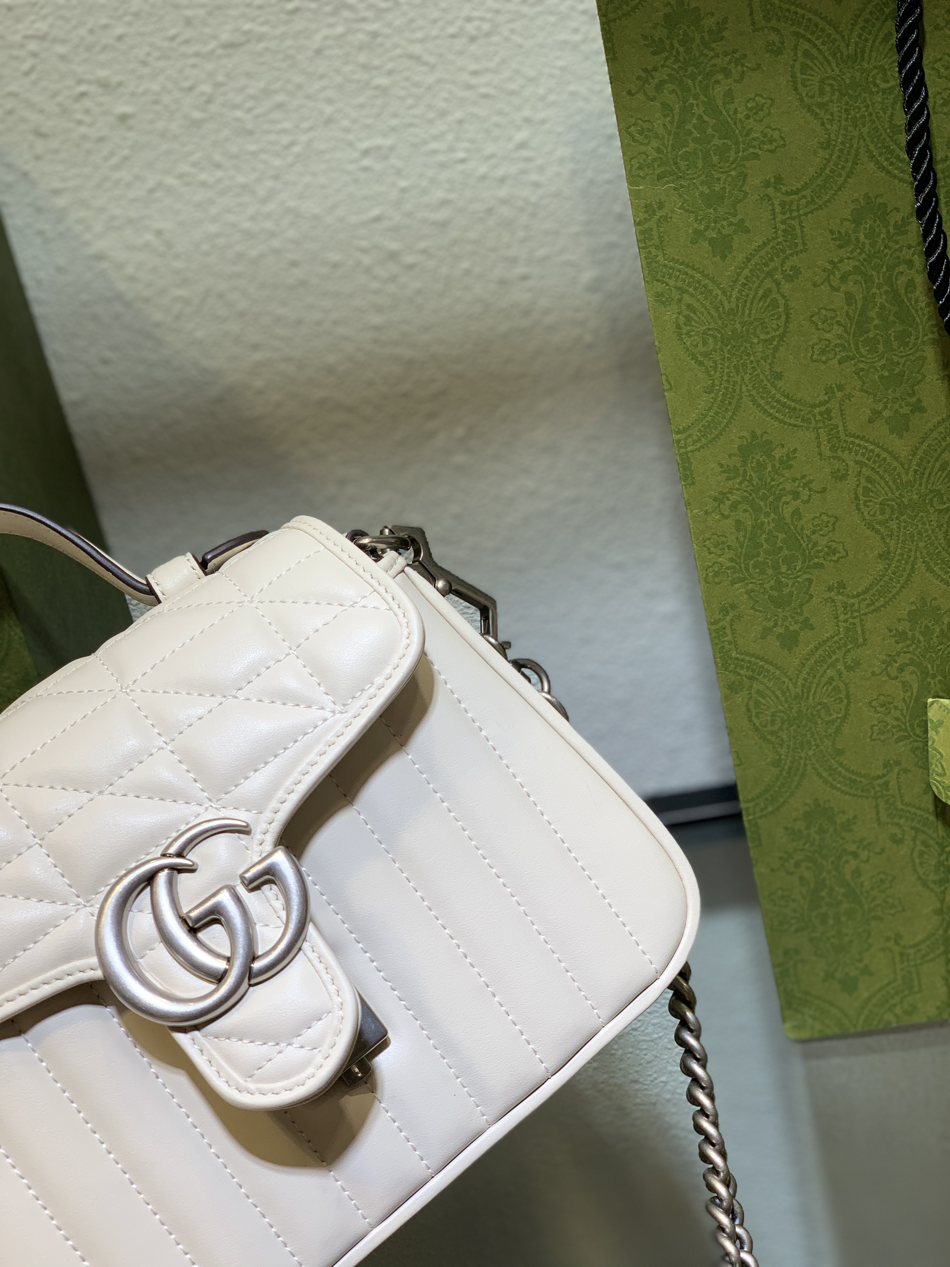 To ensure your Gucci GG Marmont White Mini Bag retains its pristine condition and beauty for years to come, proper care is essential. When not in use, store your bag in its original dust bag in a cool, dry place, away from direct sunlight and humidity. Avoid overloading the bag to maintain its shape and prevent stress on the handles and seams.