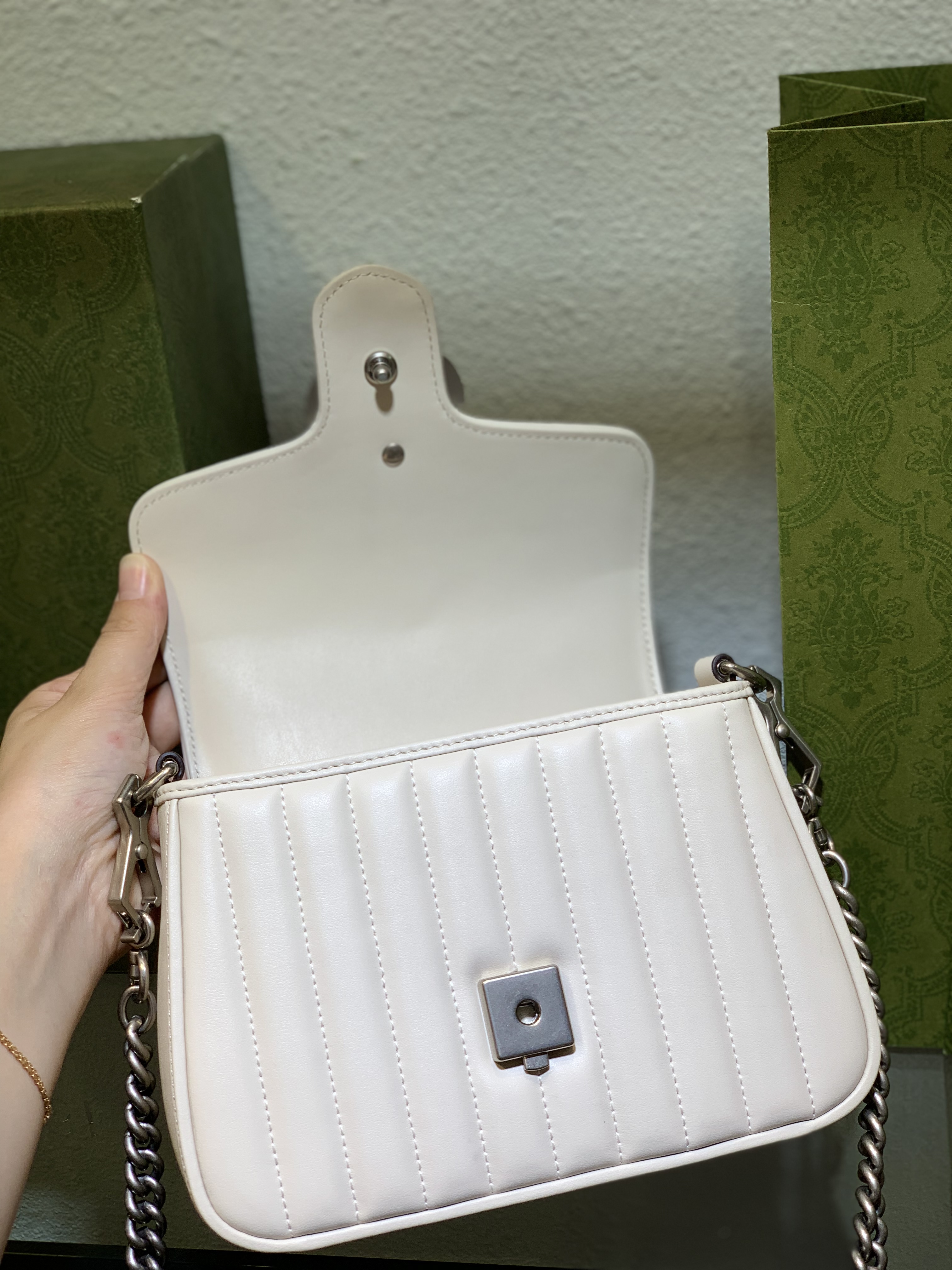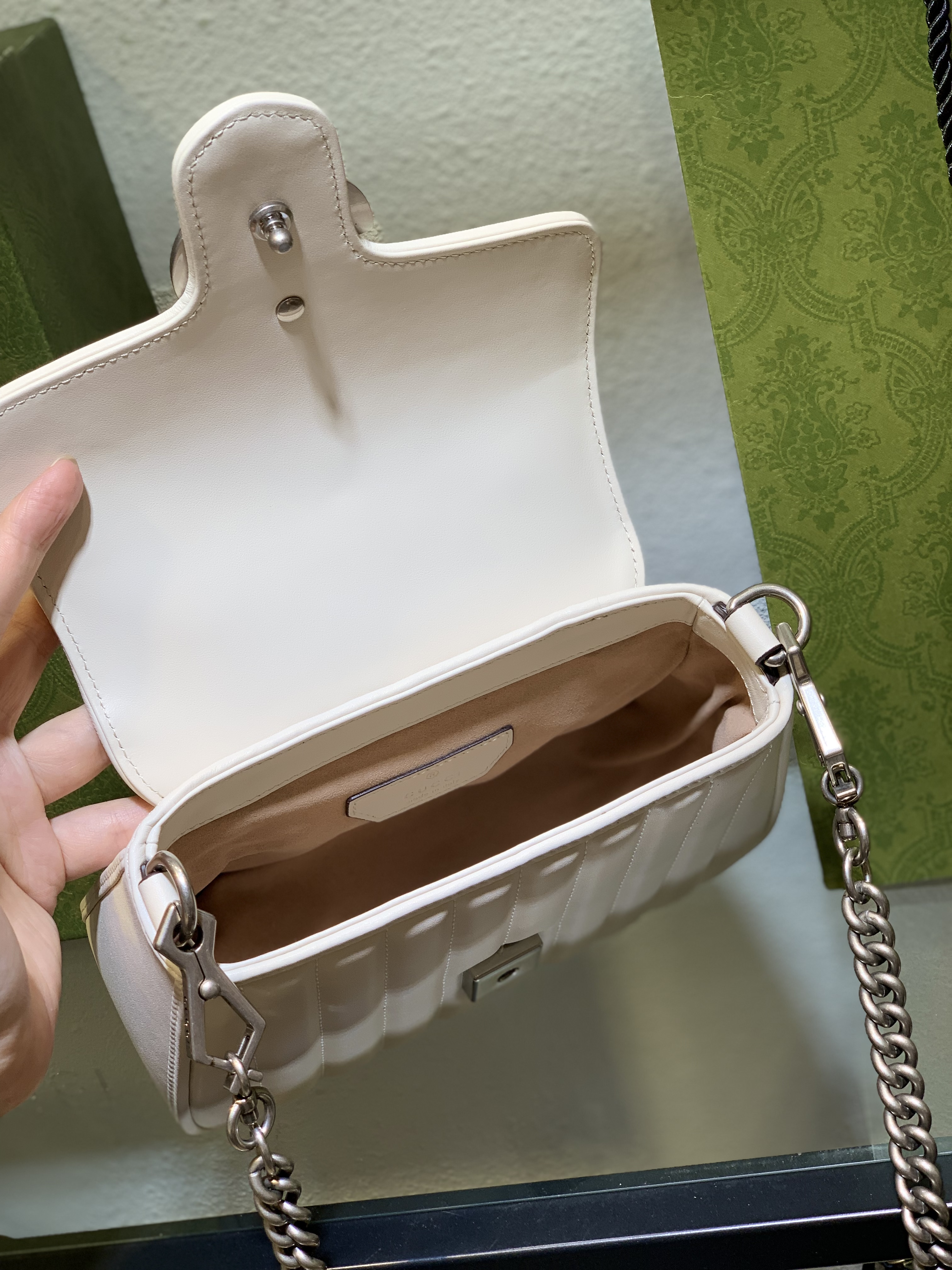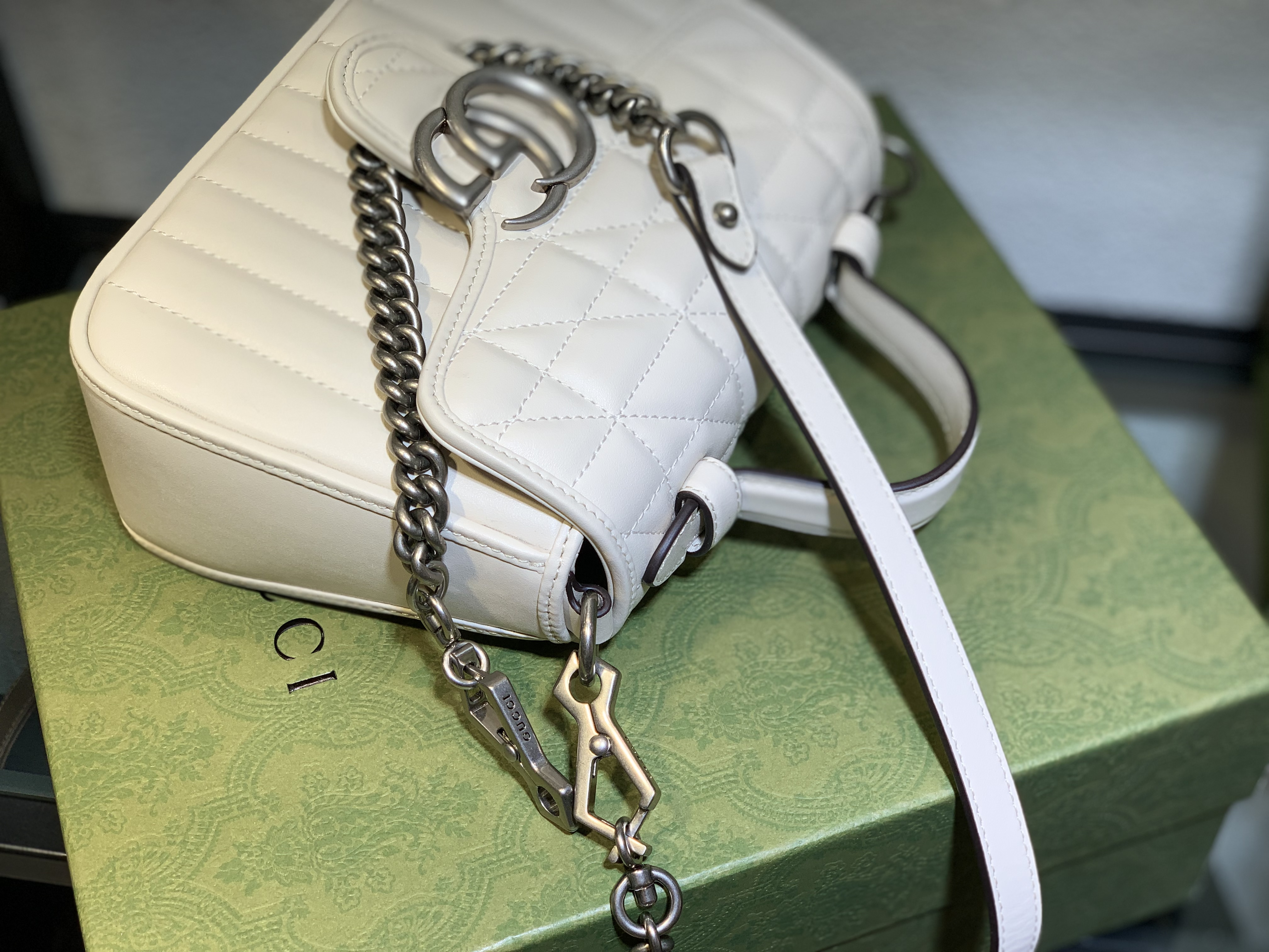 Handle the chain strap carefully to prevent snagging or scratching. Regularly check the hardware to ensure it remains secure. By following these simple care tips, your Gucci GG Marmont White Mini Bag will continue to be a cherished accessory. For deeper insights into luxury accessories, learn about handbags and their history.