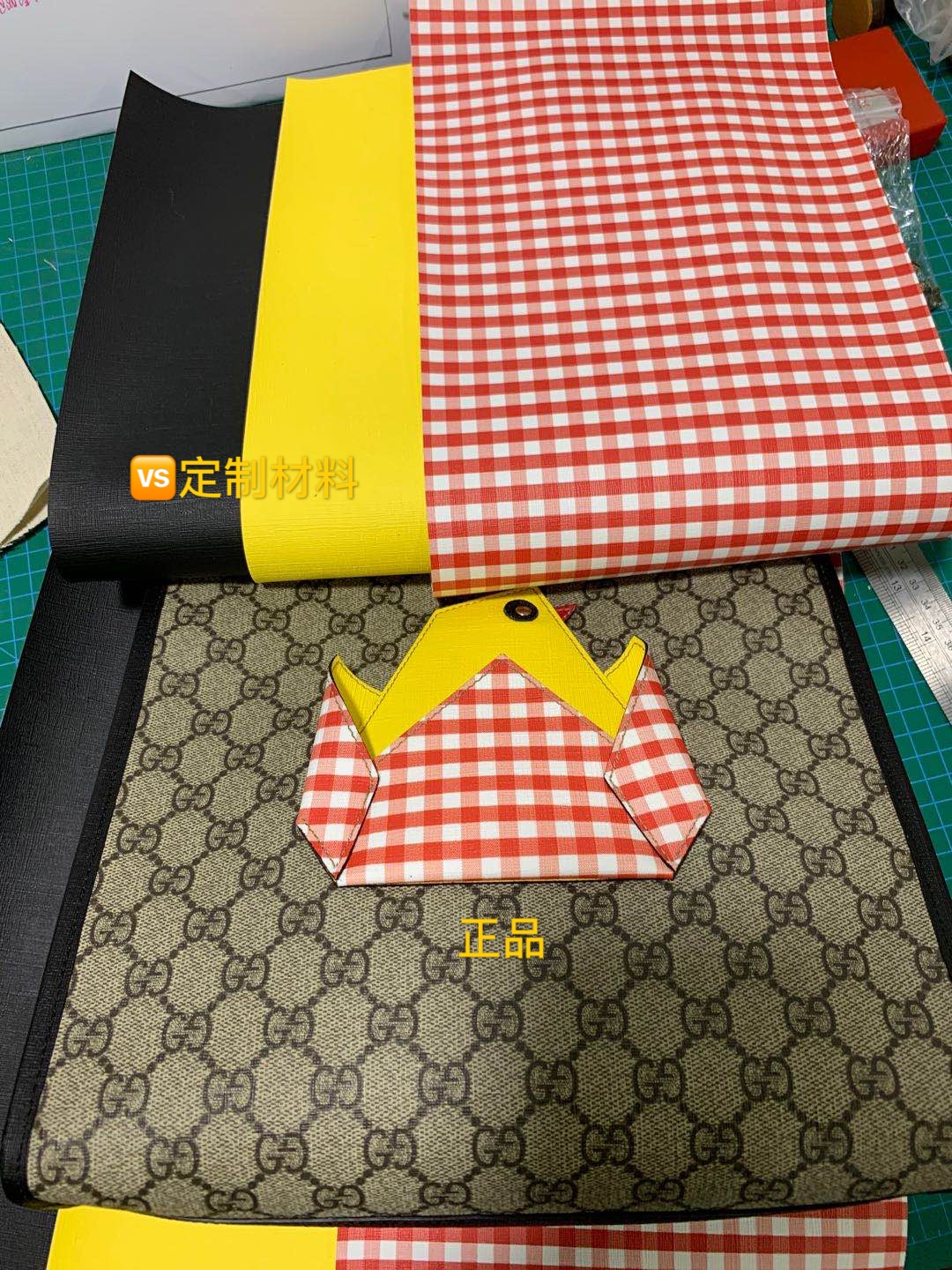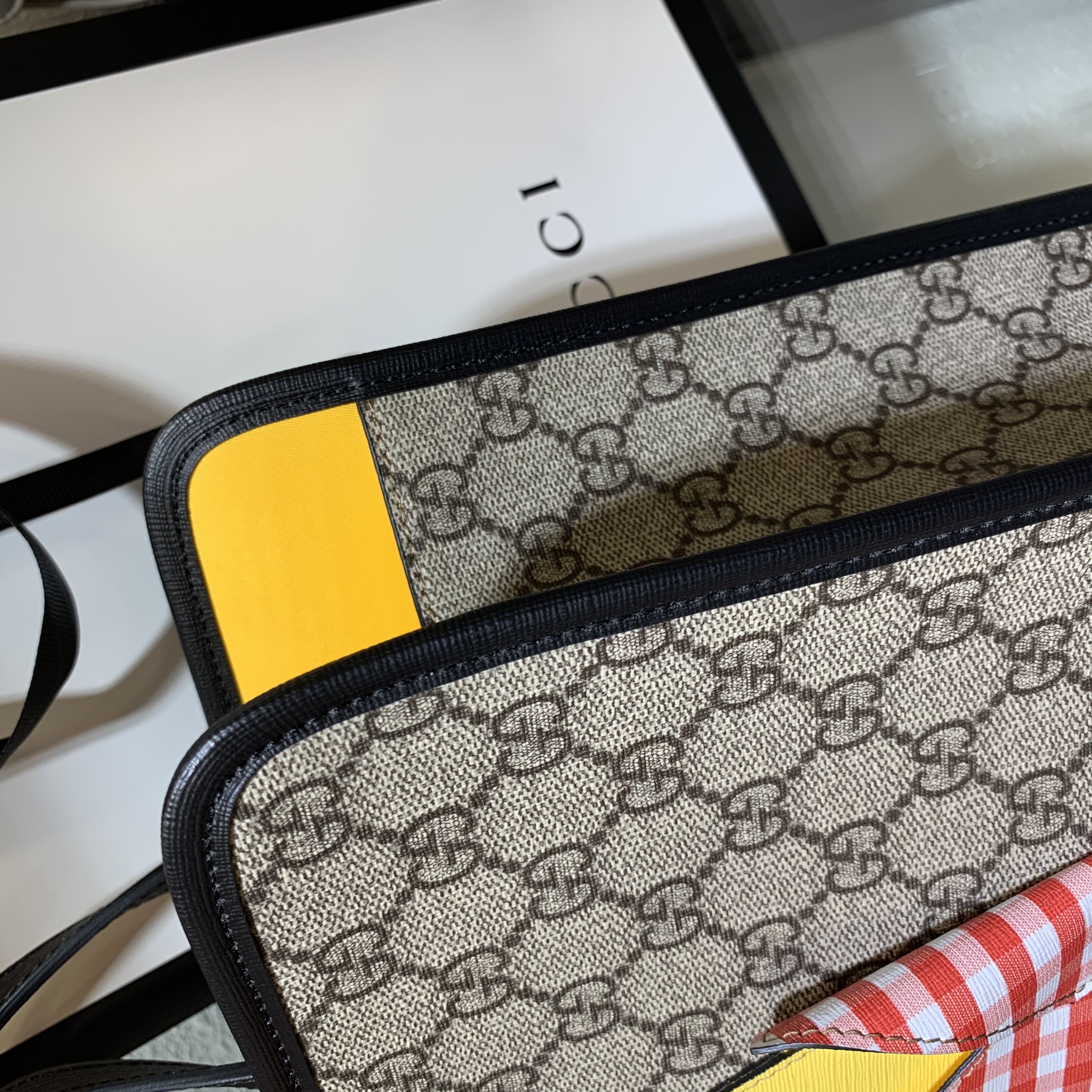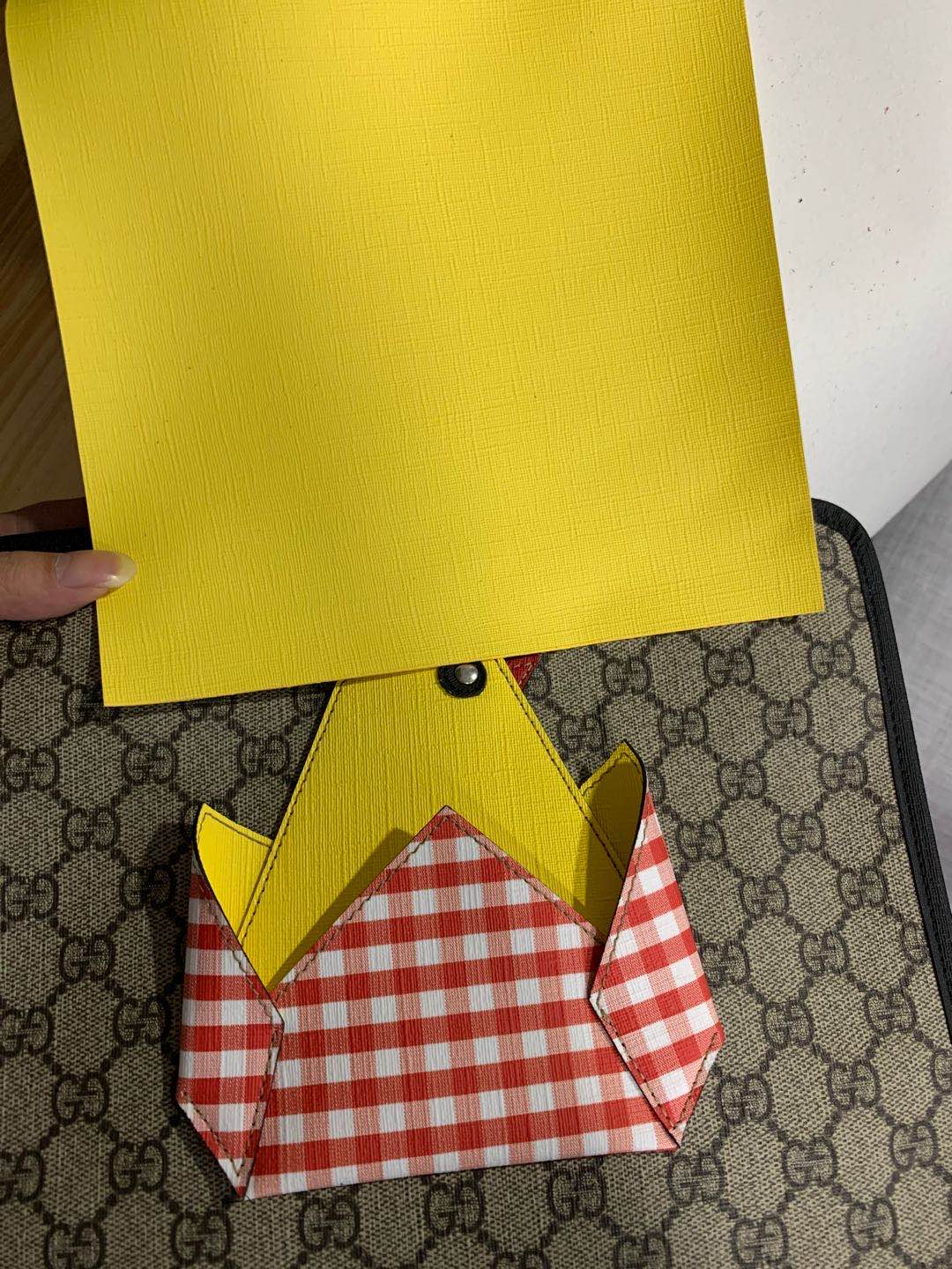 The design of the Gucci GG Supreme Chicken Tote is a masterclass in blending tradition with contemporary flair. The classic GG Supreme pattern provides a sophisticated backdrop, while the origami-inspired chicken appliqué introduces an unexpected burst of color and personality. The yellow and red gingham pattern of the chicken creates a delightful visual contrast against the muted tones of the canvas, making the bag a focal point of any outfit.