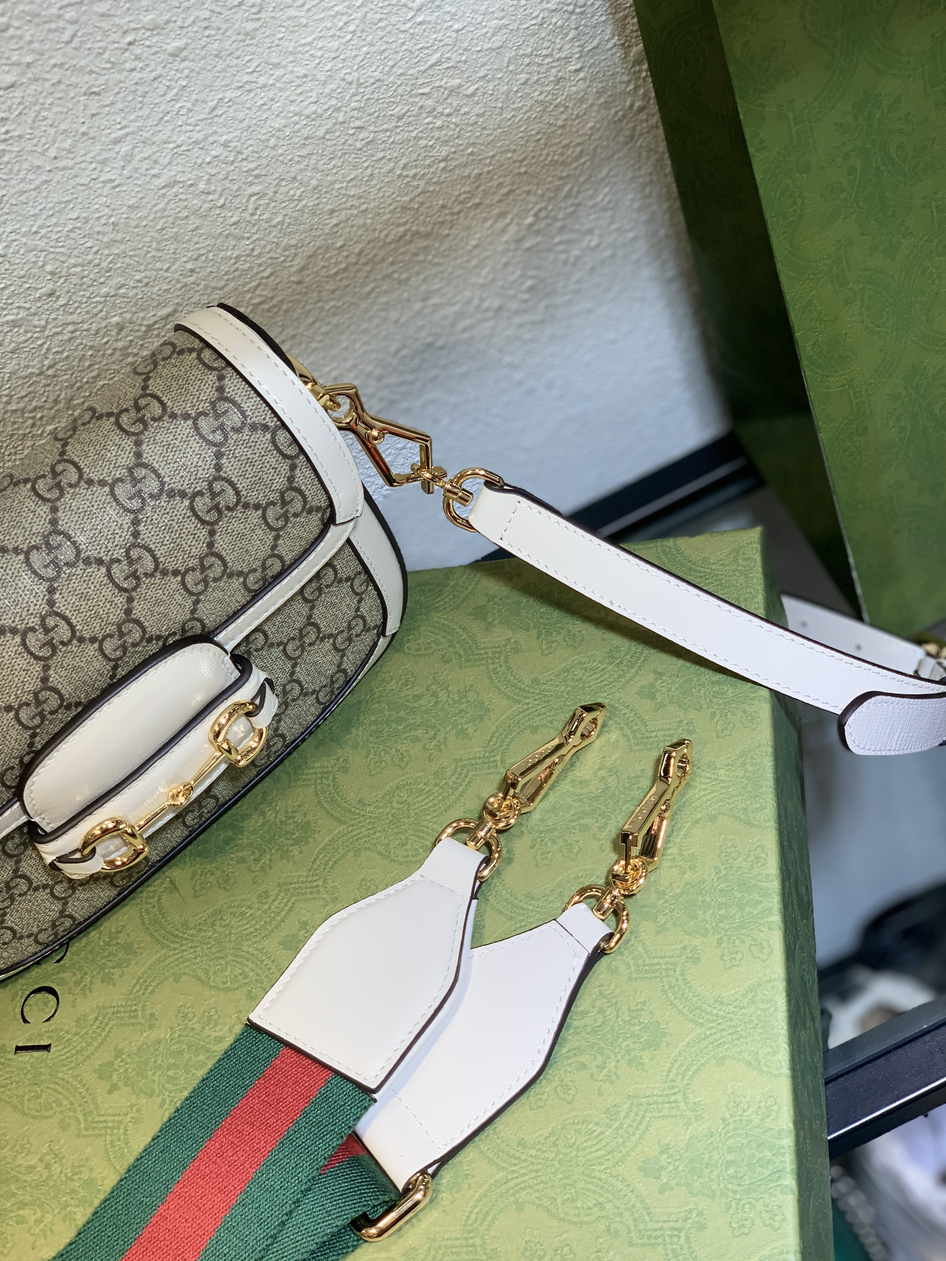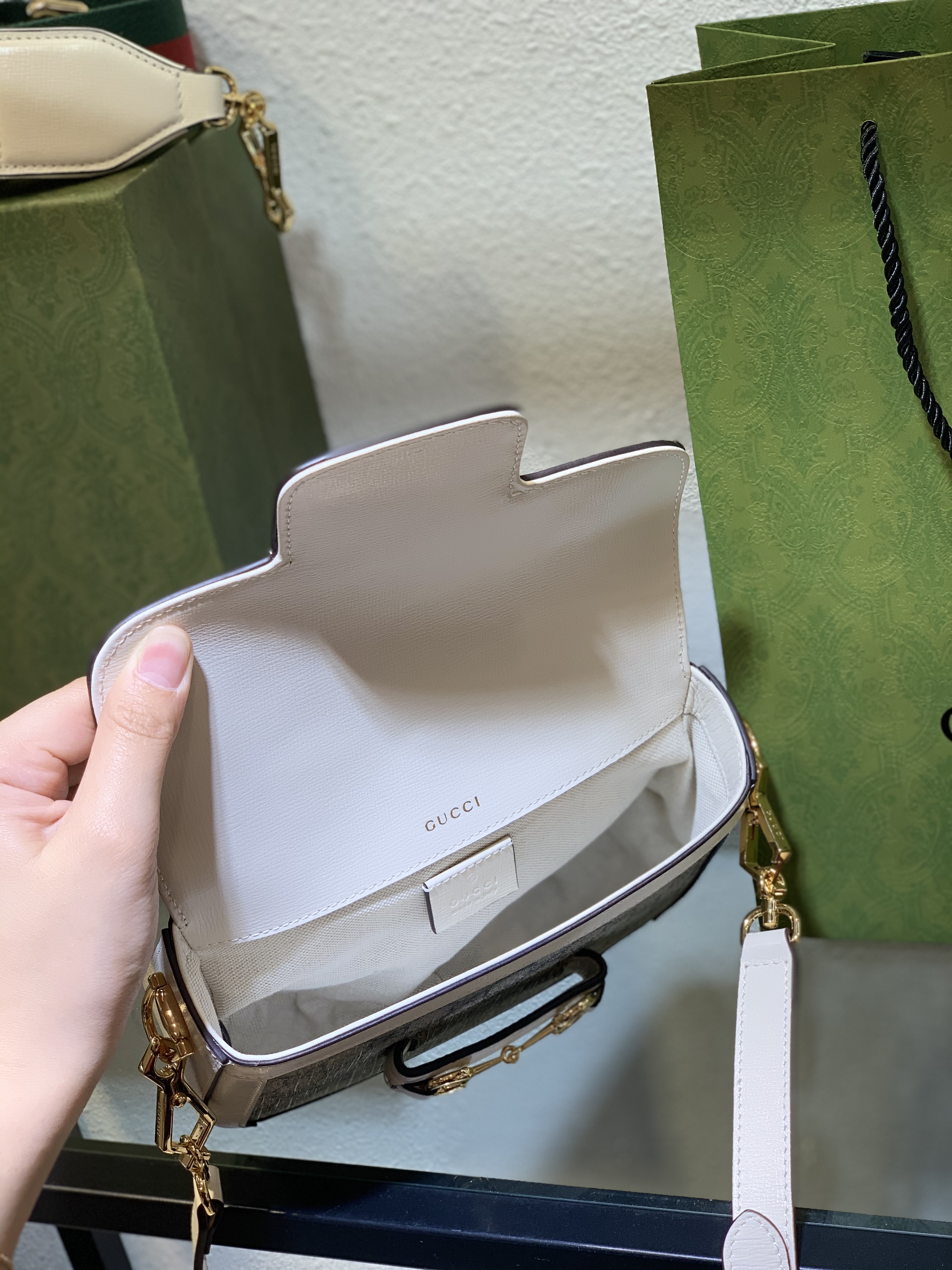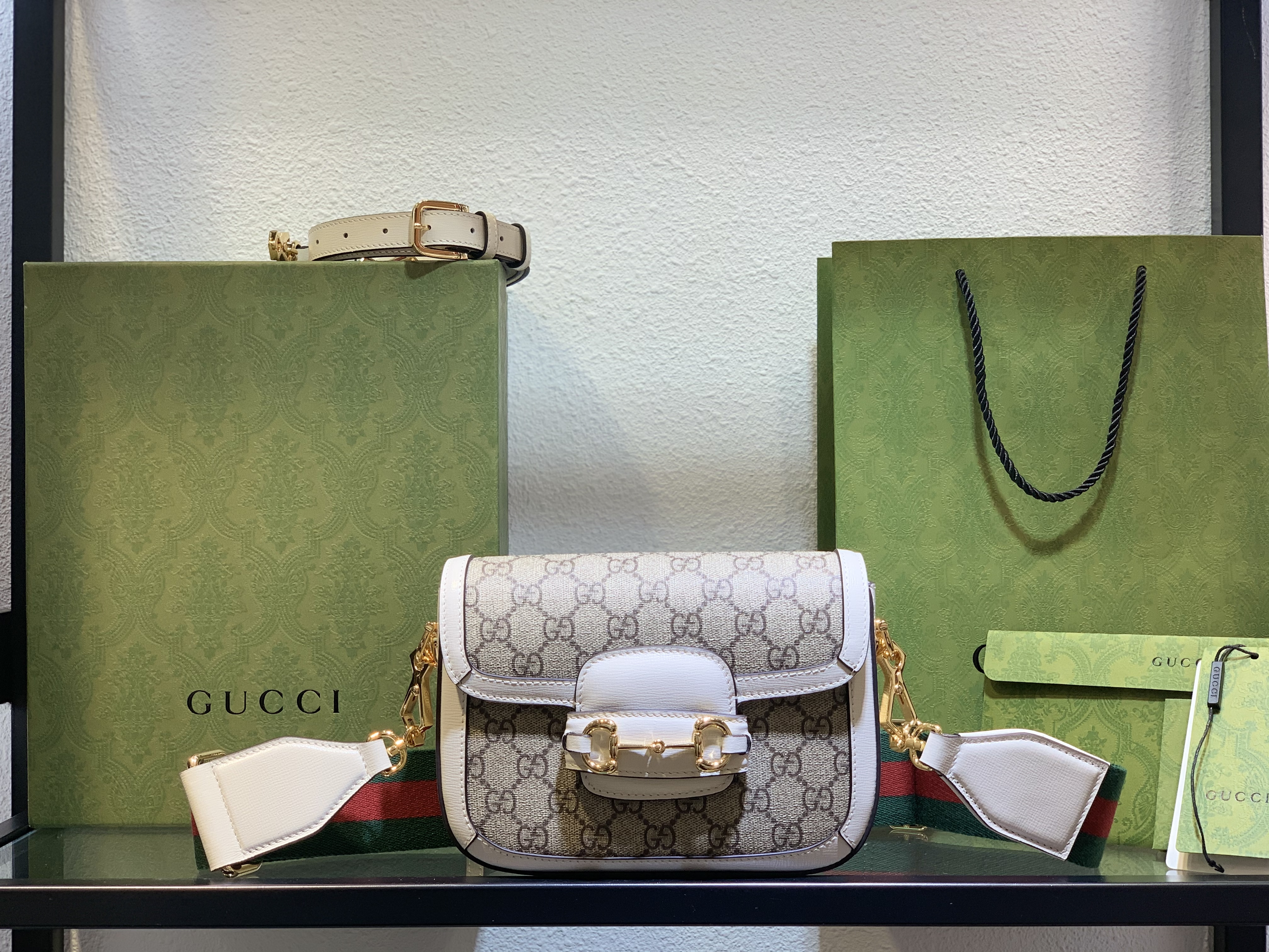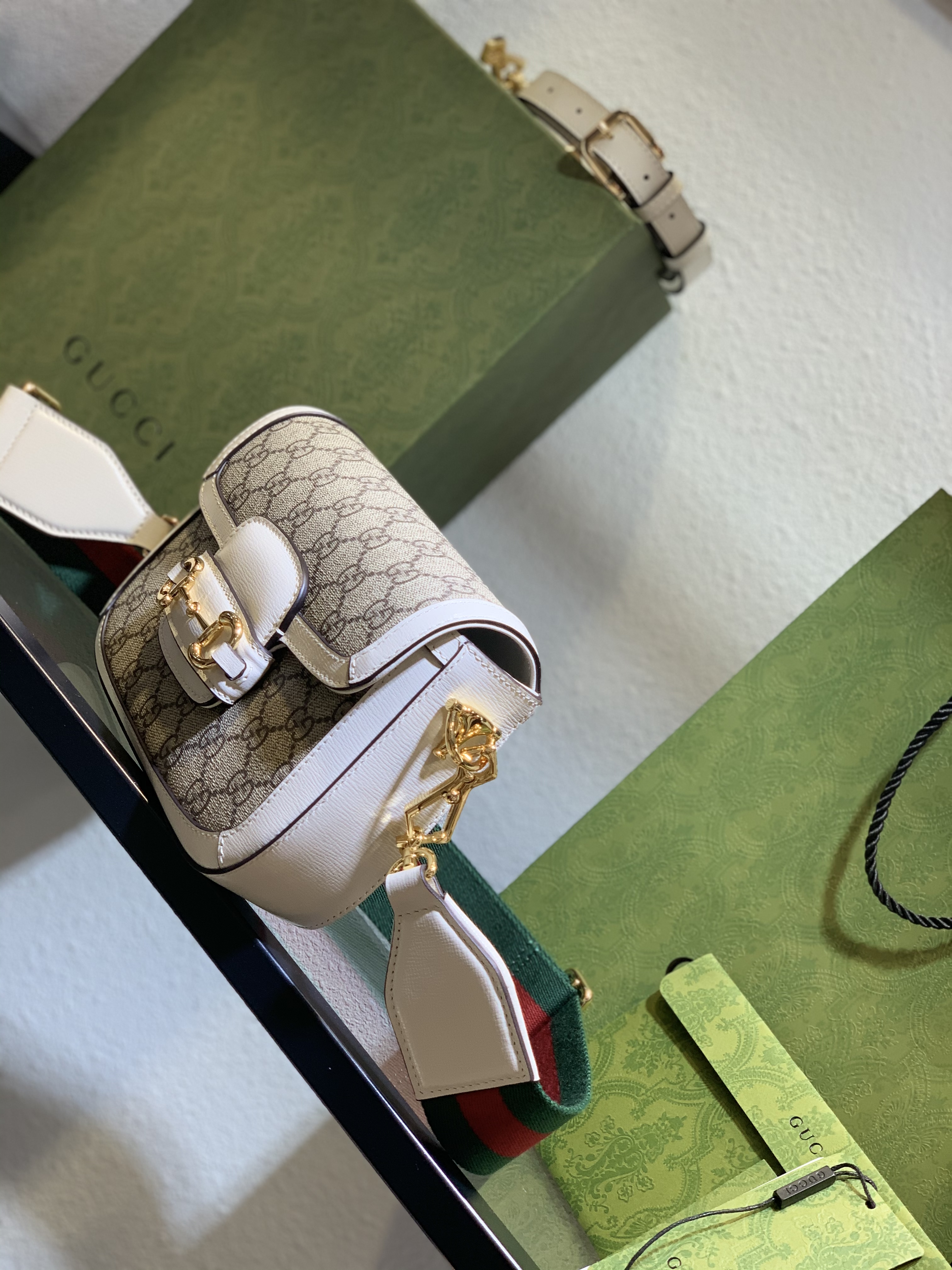 The crisp white leather accents add a fresh, modern touch, making this particular version of the Gucci bag collection exceptionally versatile. It pairs beautifully with spring dresses, sharp tailored suits, or even relaxed weekend wear, enhancing every look.