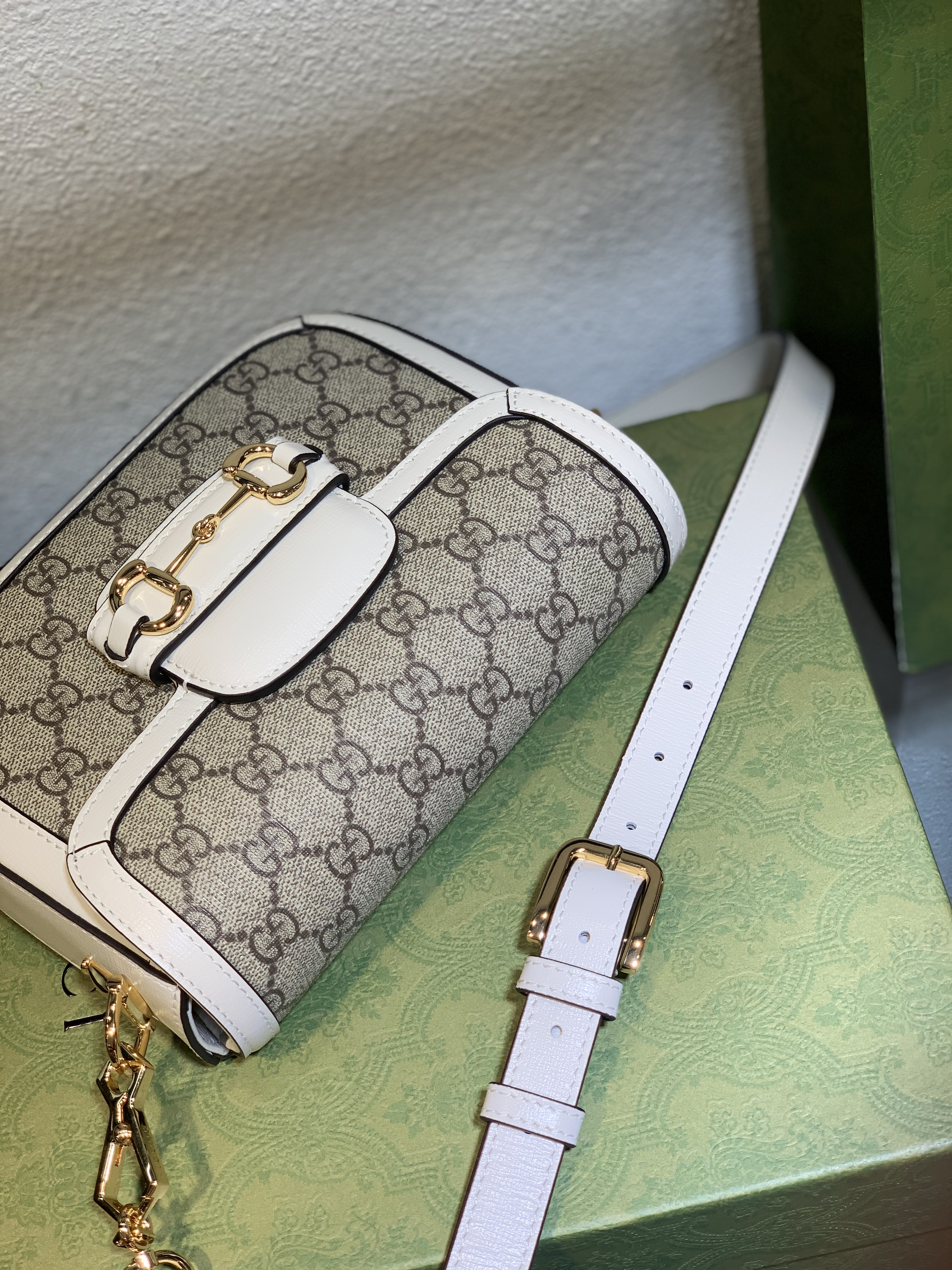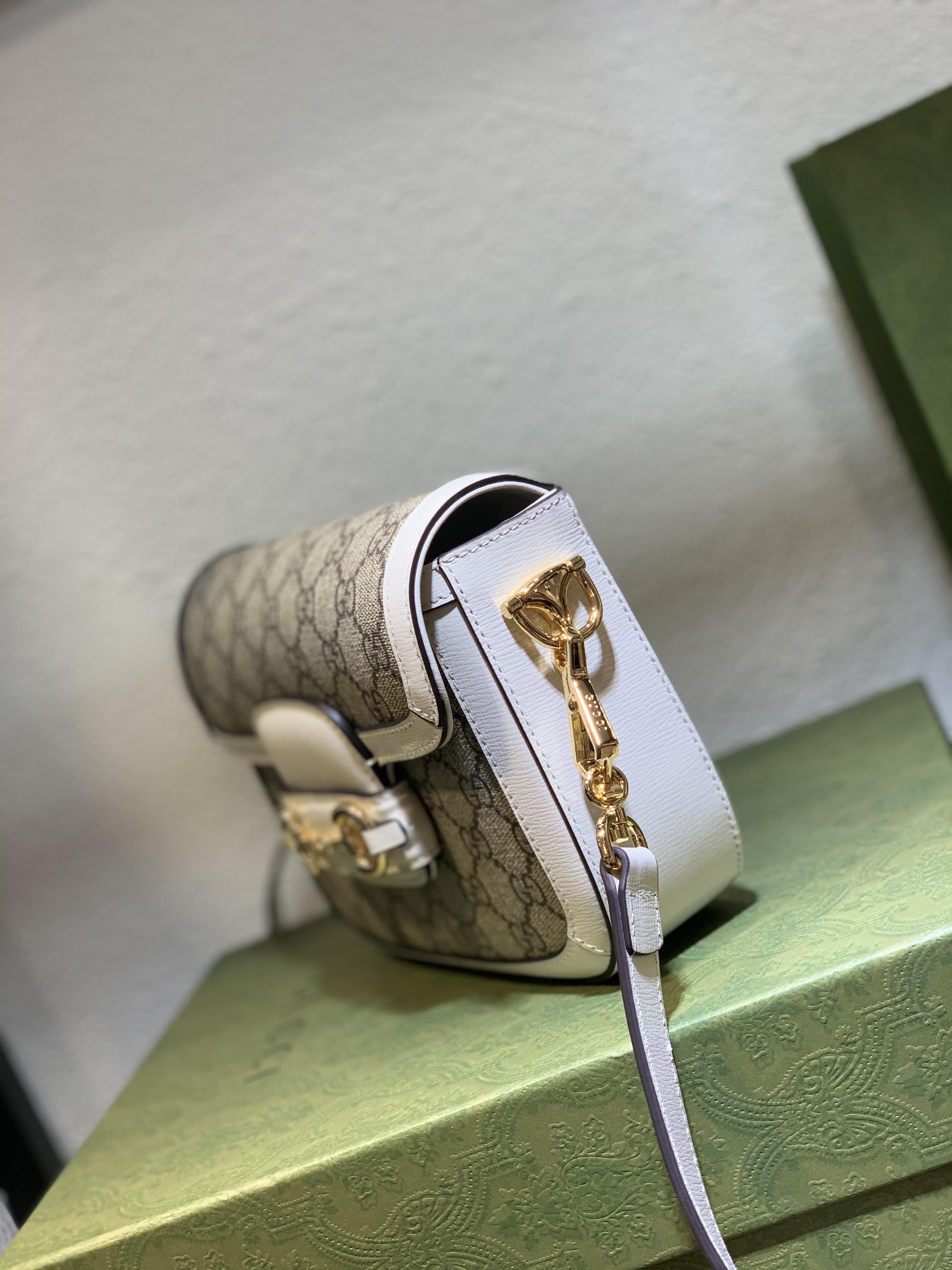 The Gucci GG Supreme Horsebit Mini Bag is constructed from the brand's signature GG Supreme canvas, renowned for its exceptional durability and distinctive aesthetic. This low-environmental impact material is beautifully complemented by supple white leather trim, providing a refined and striking contrast.