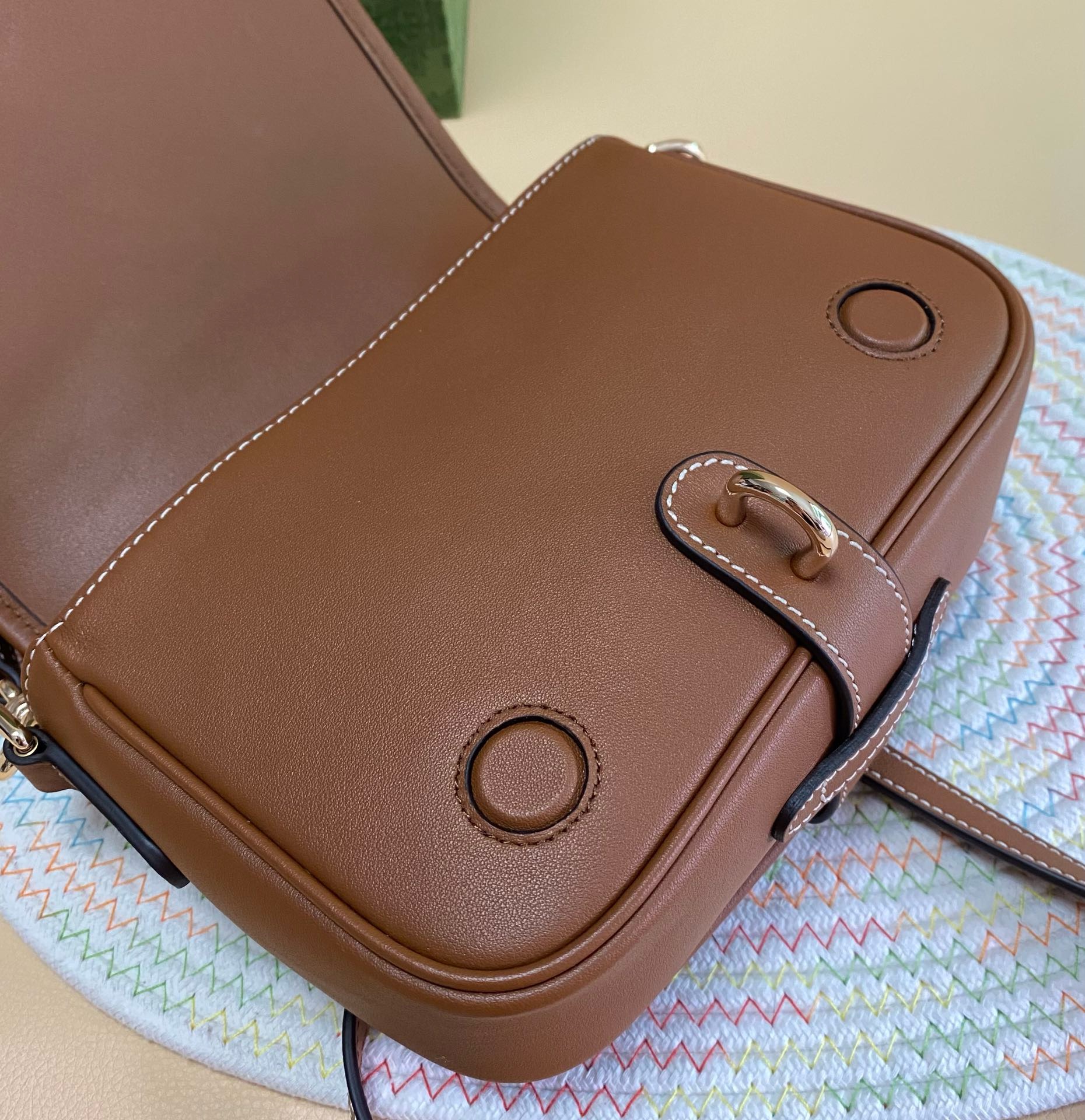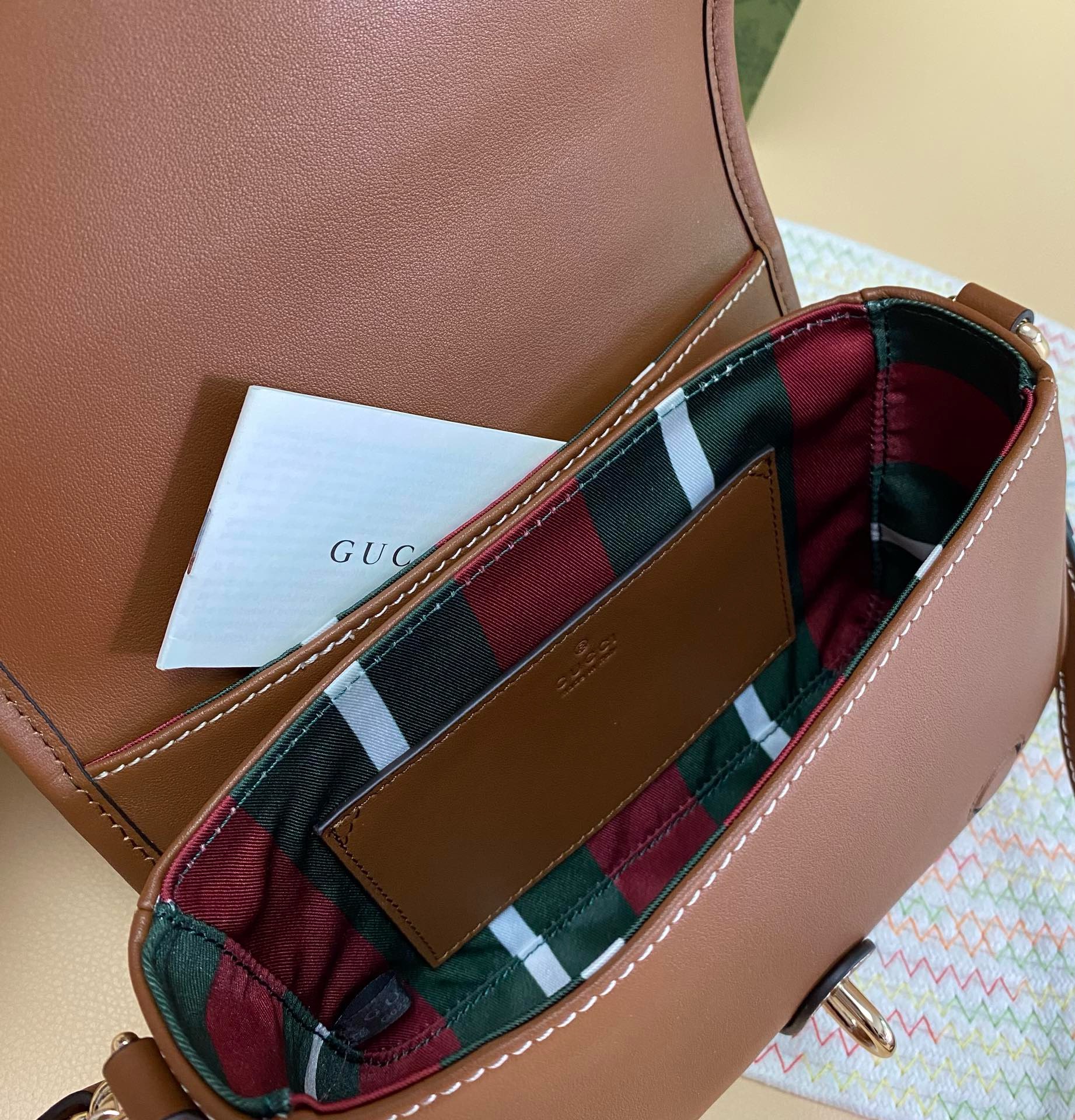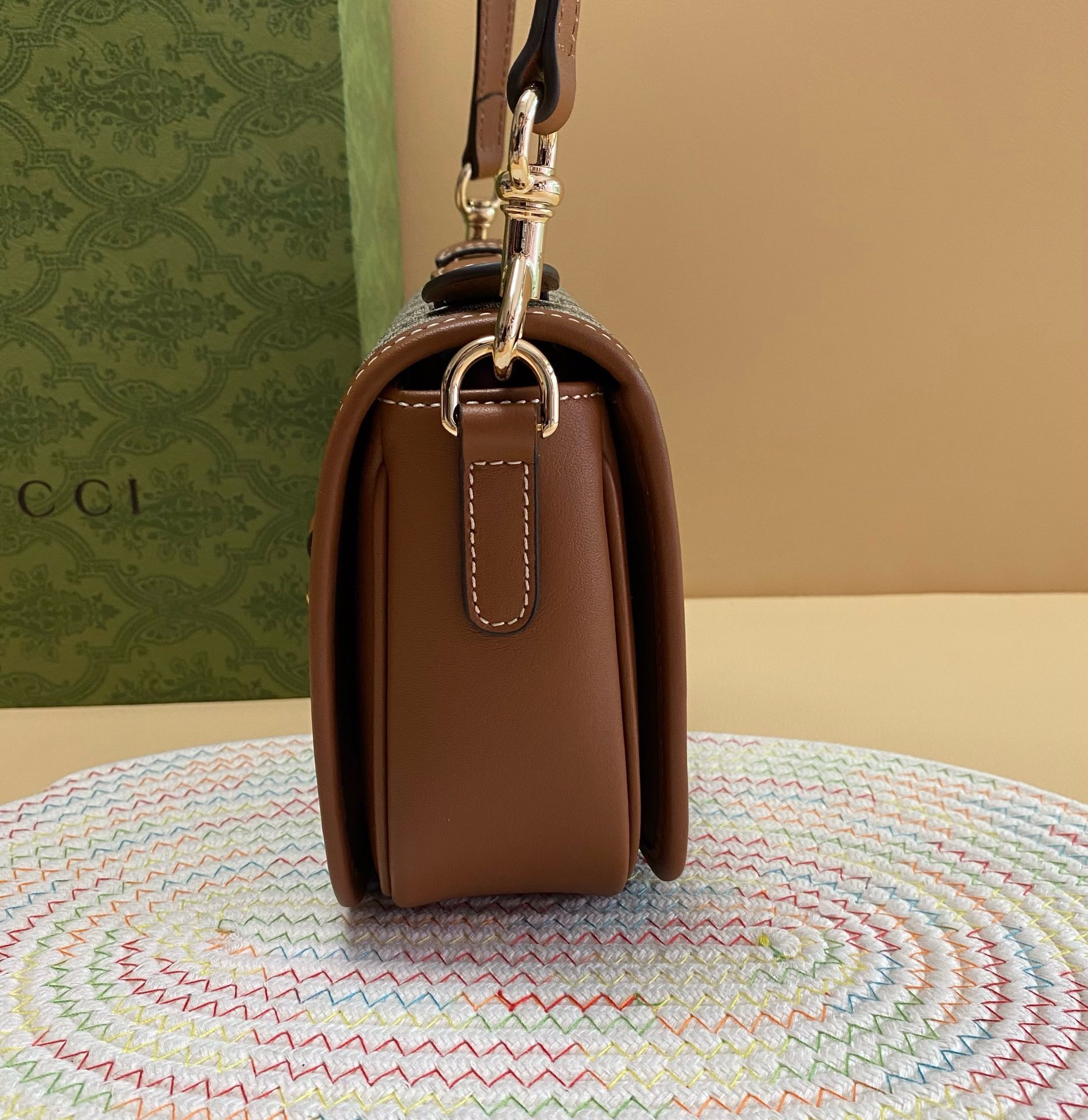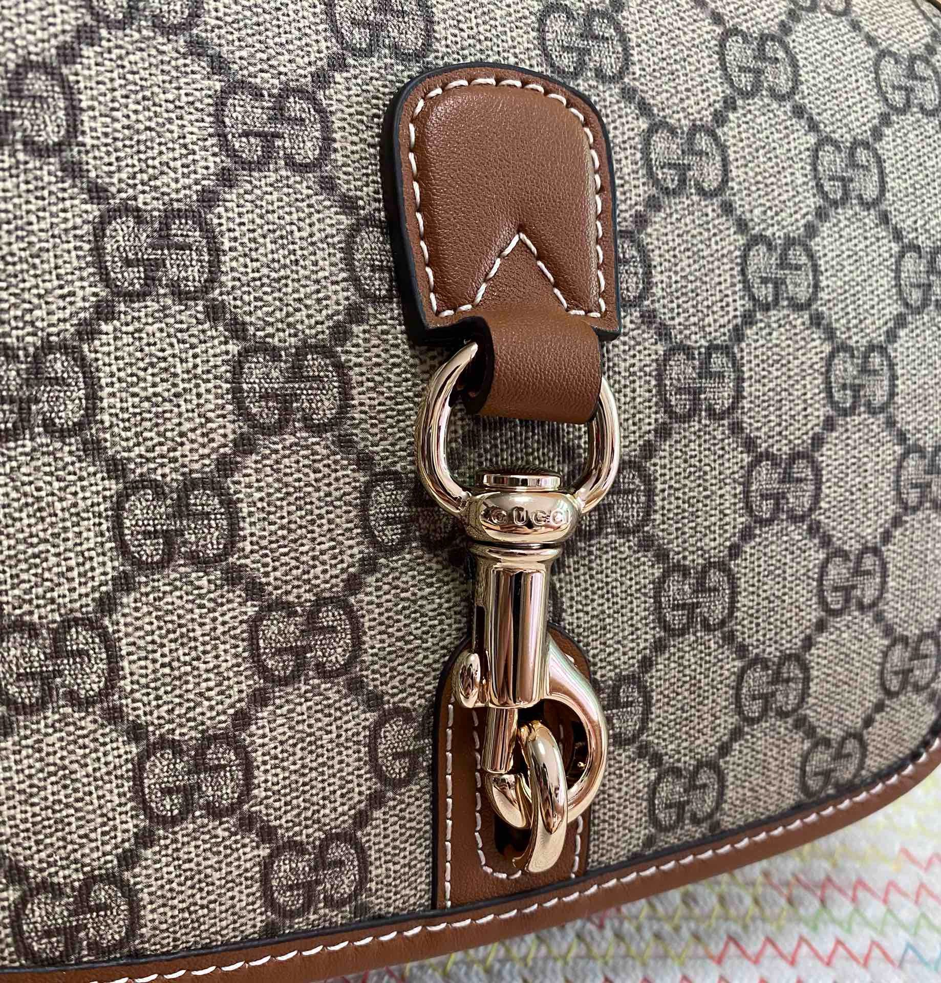 Complementing the canvas is the exquisite brown leather trim, meticulously stitched along the edges and detailing. This high-quality leather not only provides structural integrity but also adds a luxurious tactile contrast. The robust gold-tone hardware, including the unique hook clasp, is carefully chosen for its lasting shine and secure functionality, reflecting Gucci's commitment to superior craftsmanship.