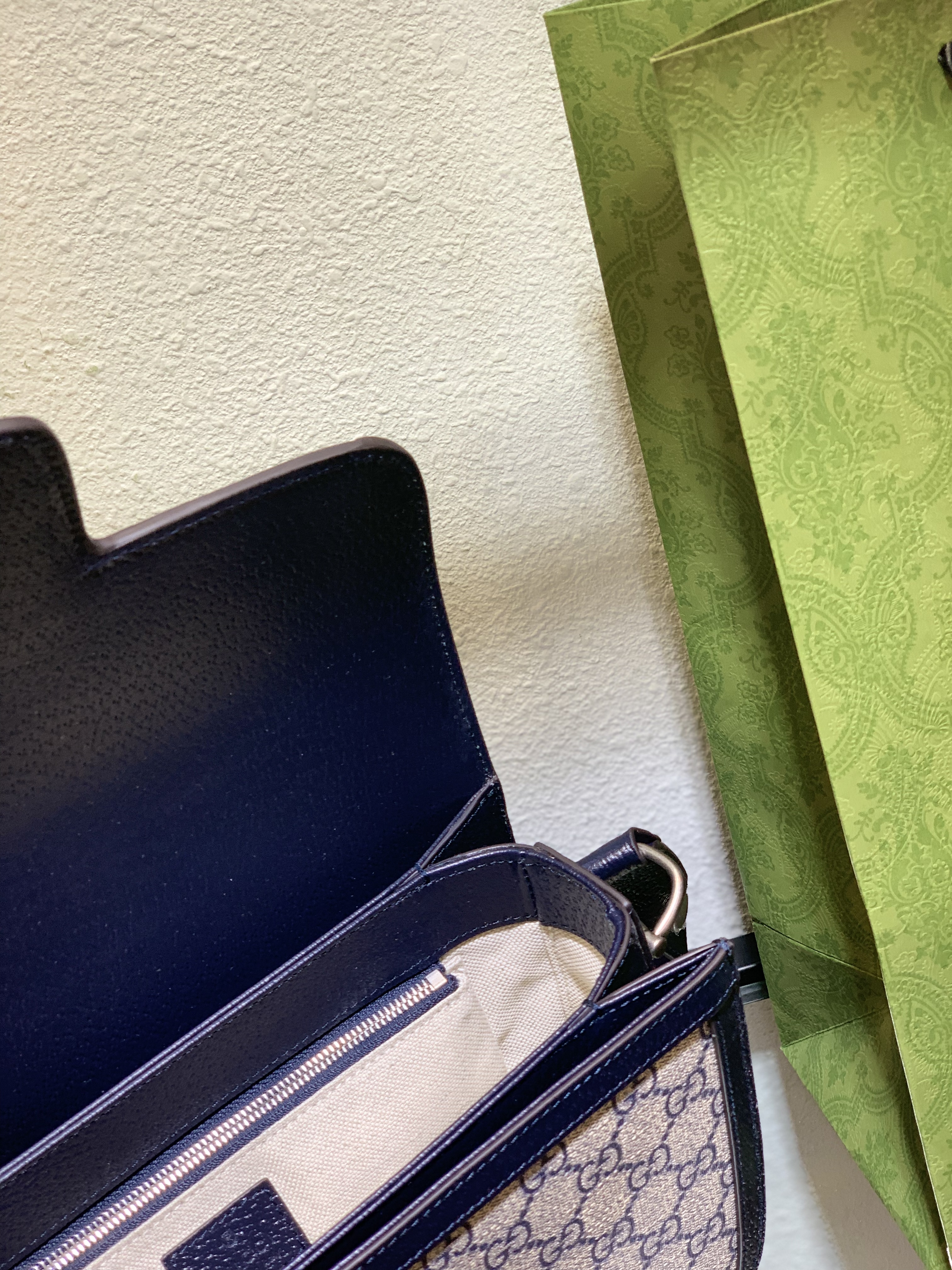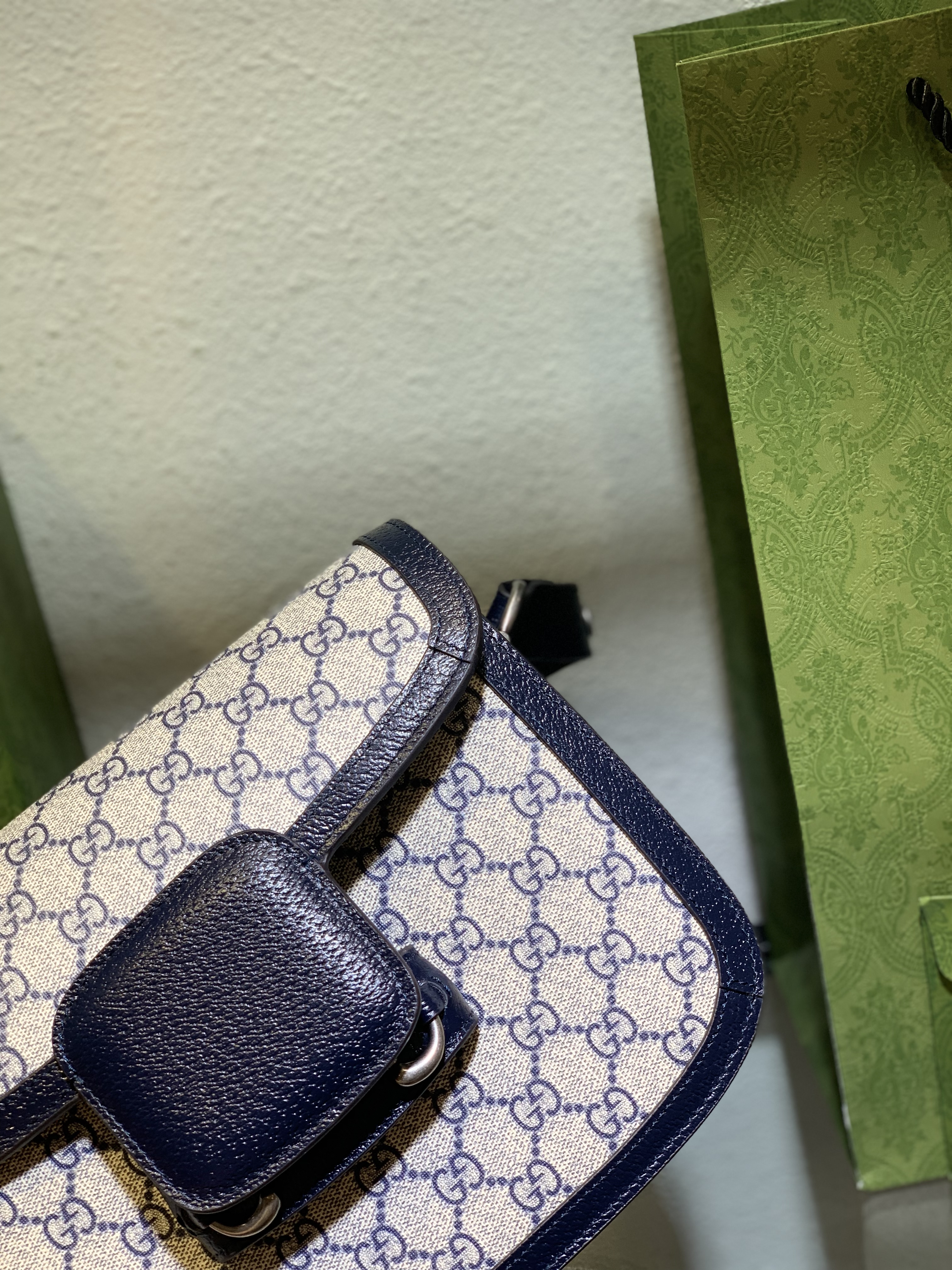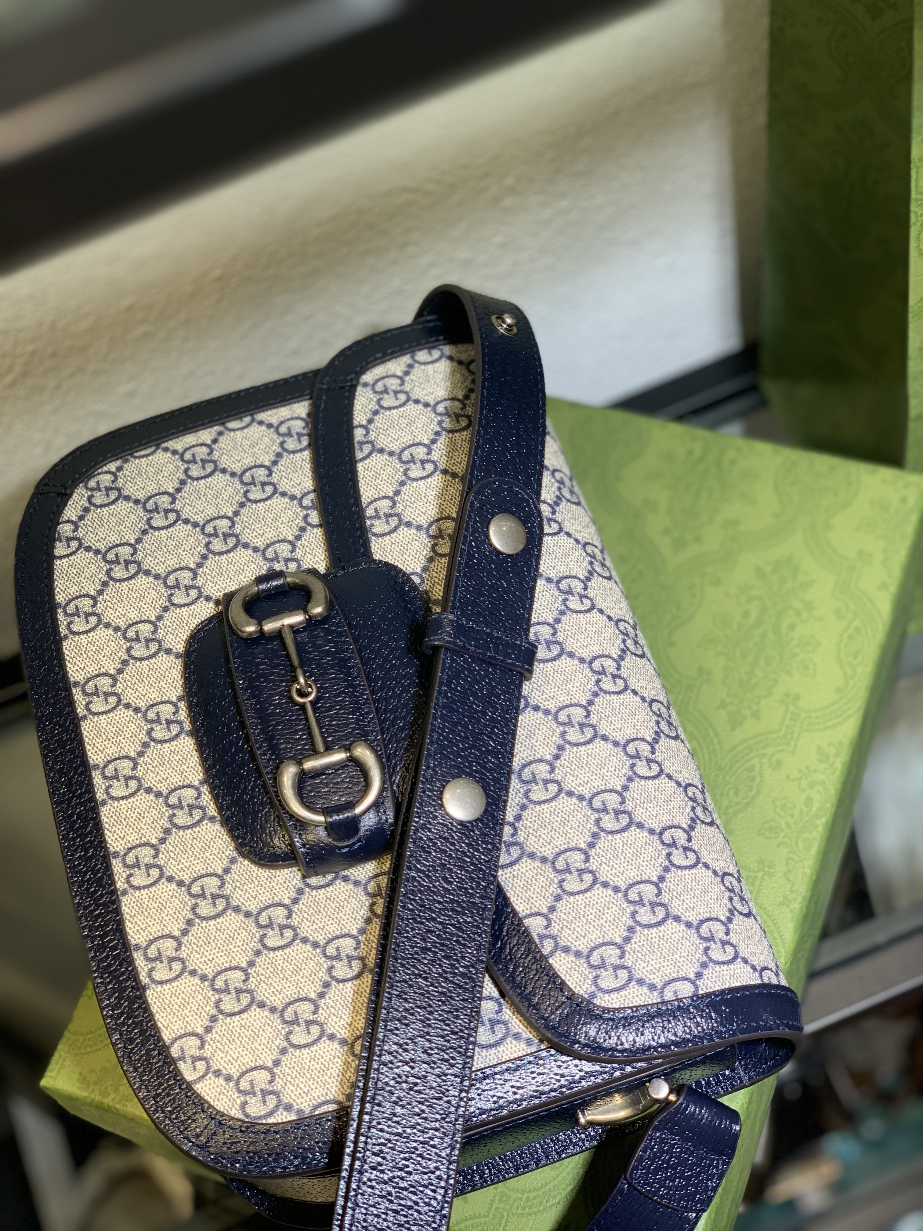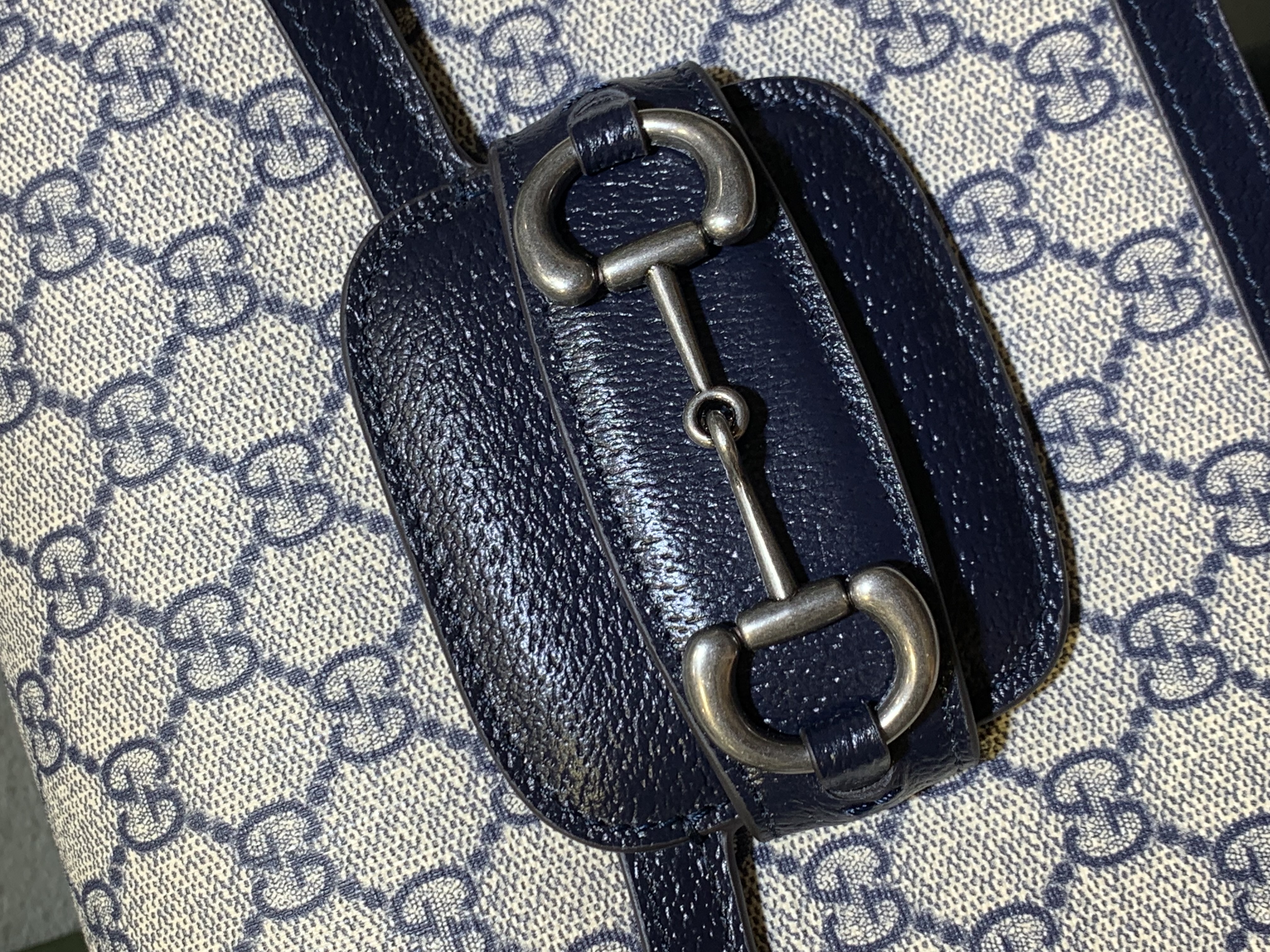 To maintain the pristine condition of your Gucci Horsebit 1955 Navy bag, gentle care is recommended. Avoid exposure to direct sunlight, heat, and moisture. Clean the GG Supreme canvas with a soft, dry cloth.