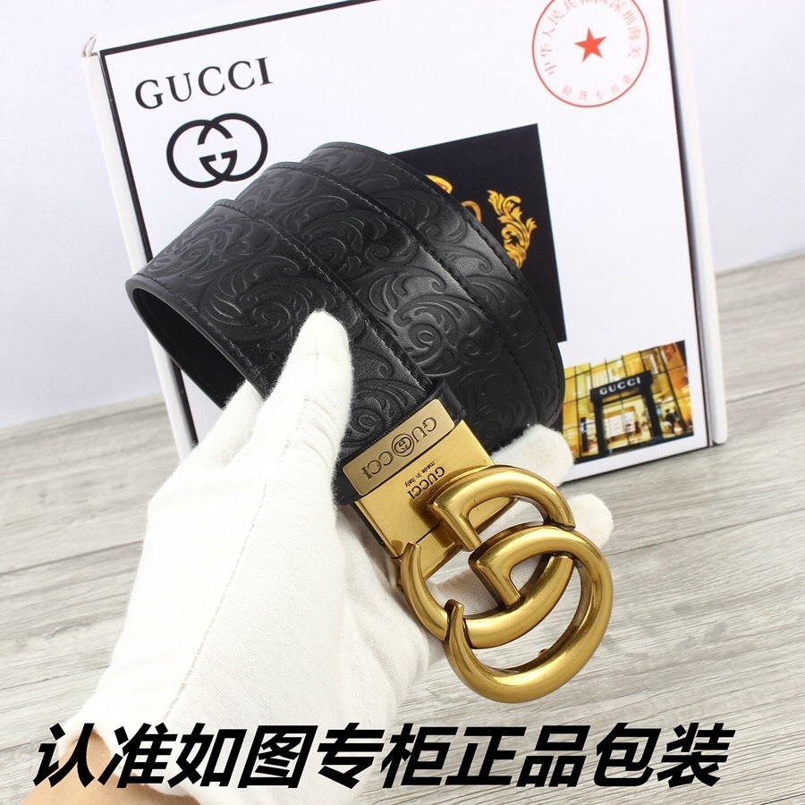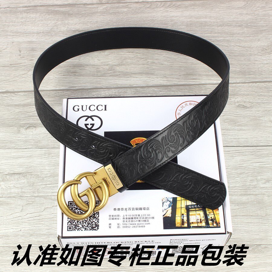 This belt is made from high-quality genuine leather, ensuring durability and a luxurious feel. The intricate embossed pattern adds a touch of subtle texture and visual interest. The iconic double G buckle, finished in a polished gold tone, is the centerpiece of this belt, adding a touch of glamour and instantly recognizable style.