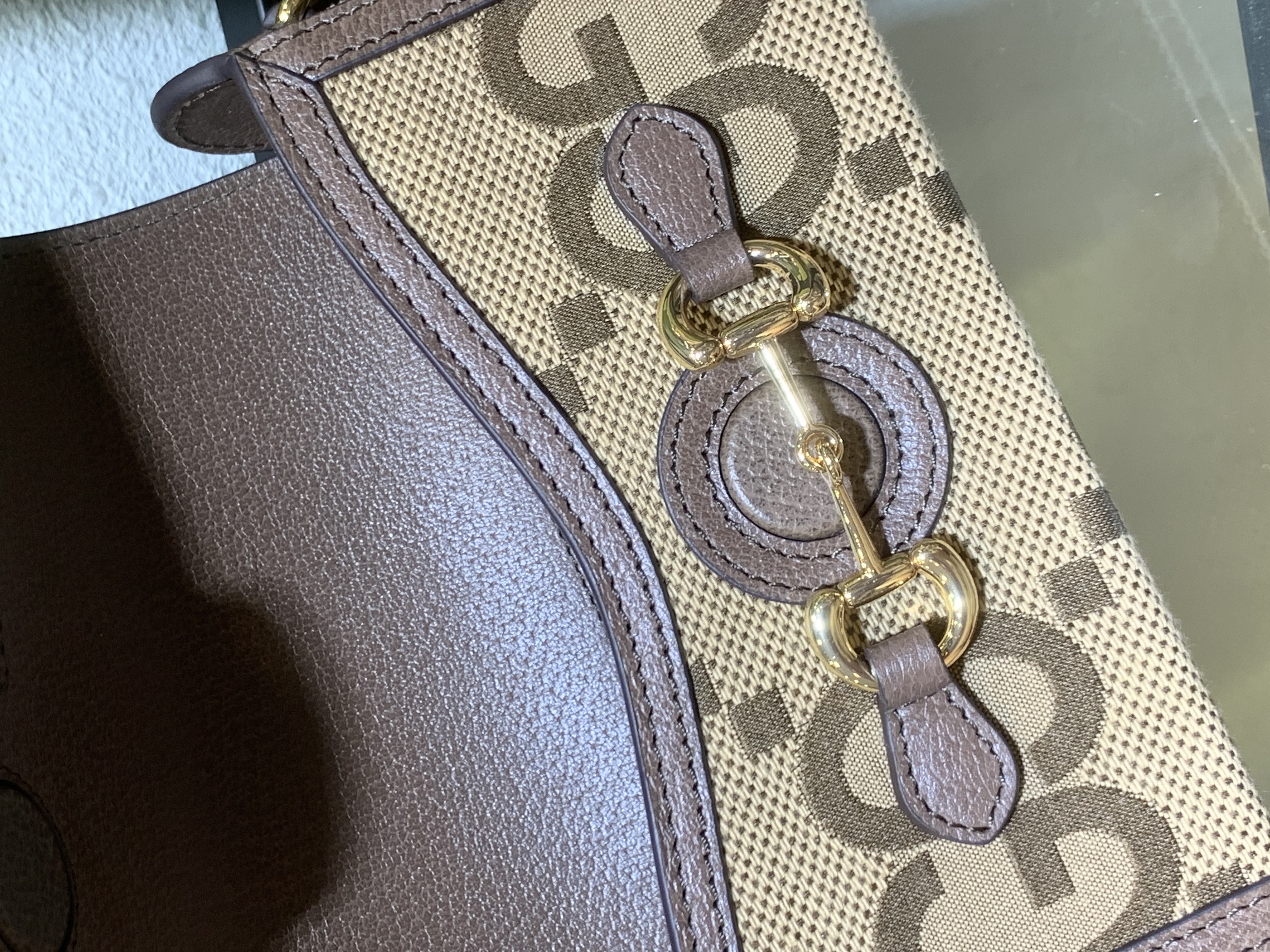 The design of the Gucci Jumbo GG Horsebit Mini Bag is a masterclass in blending heritage with contemporary fashion. The enlarged GG motif makes a strong visual statement, offering a playful yet luxurious twist on the traditional monogram. This bold pattern ensures the bag is instantly recognizable and highly fashionable.