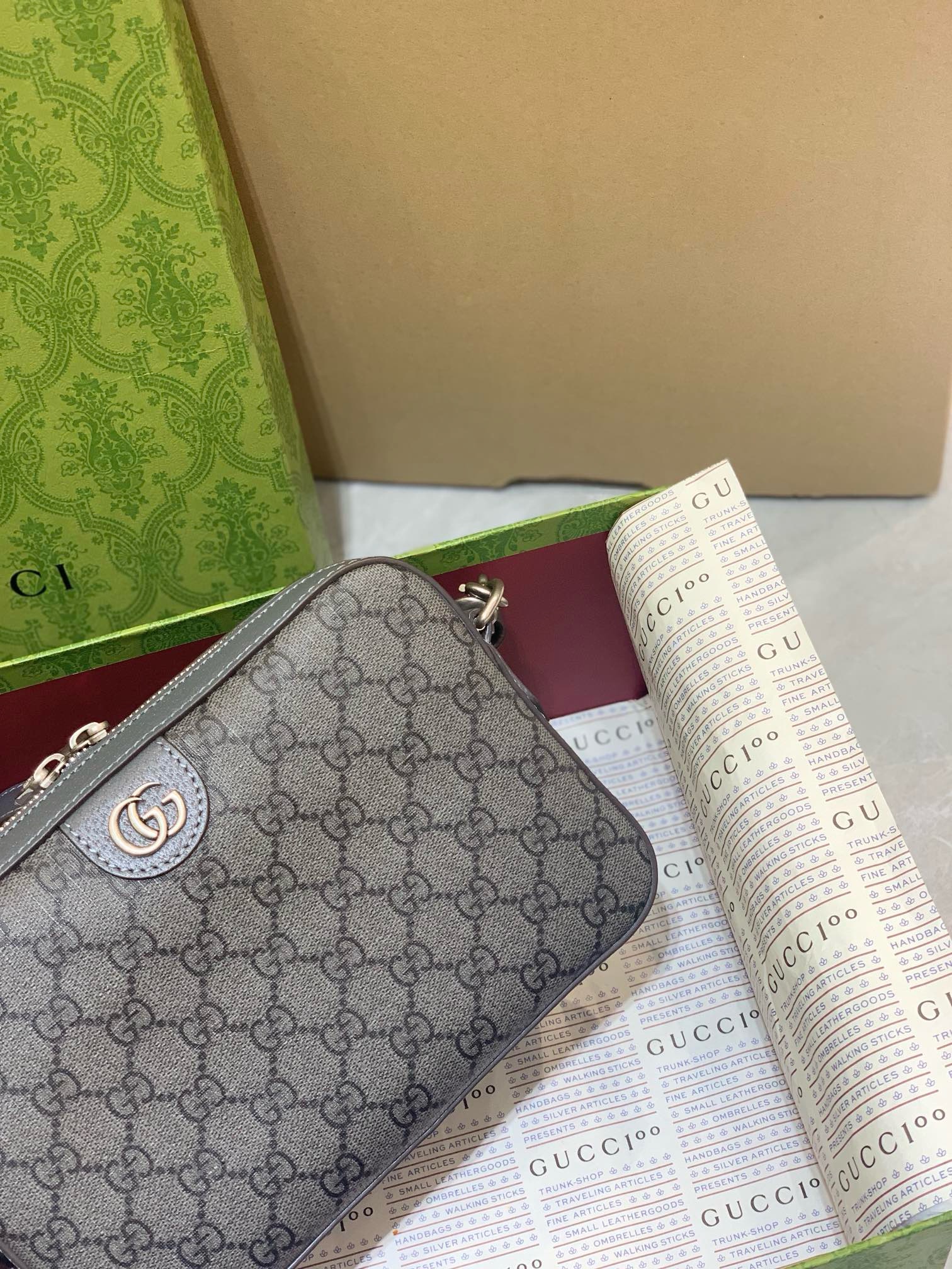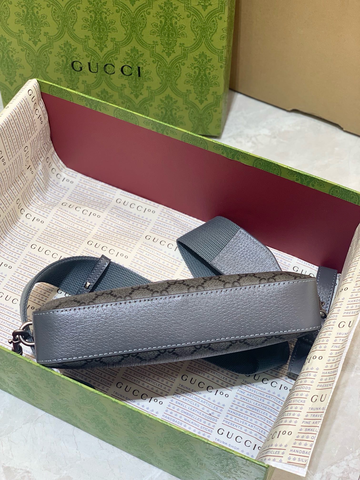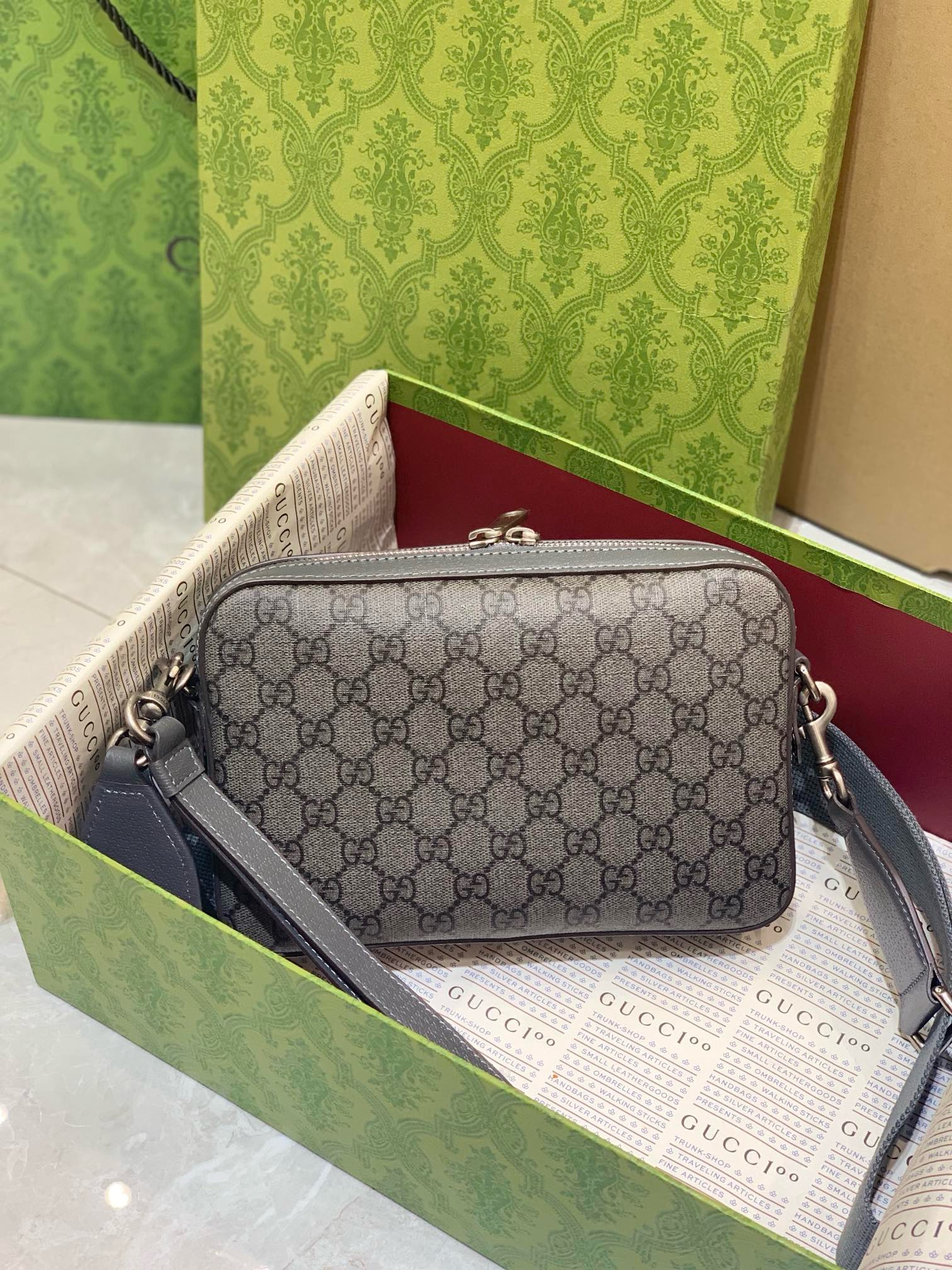 • Iconic GG Supreme Canvas: Durable, low-maintenance material featuring the signature Gucci monogram pattern in grey and black.