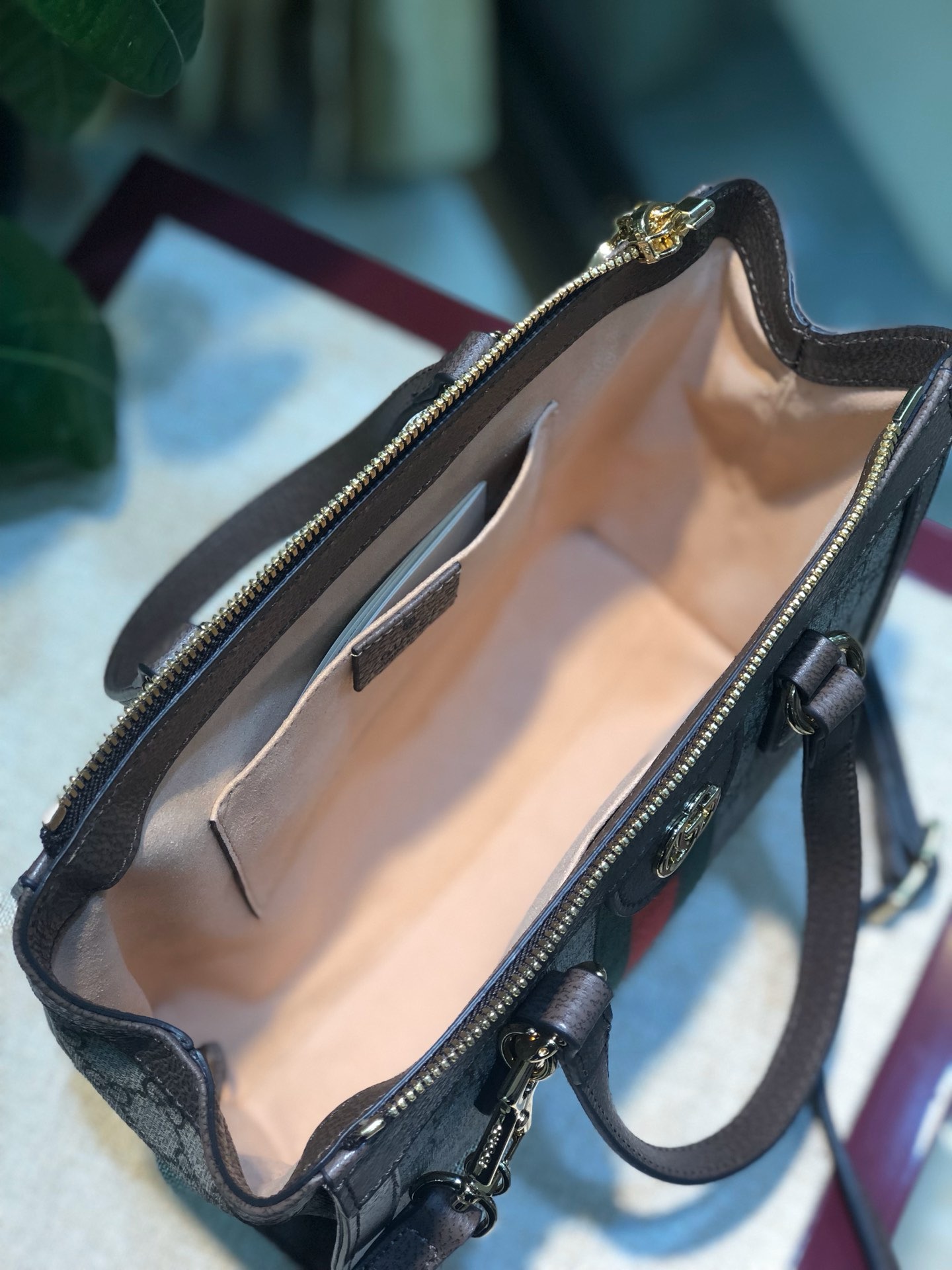 Complementing the canvas is the rich, textured brown leather trim, which outlines the bag's silhouette, forms the elegant top handles, and comprises the adjustable shoulder strap. This genuine leather not only adds to the bag's luxurious feel but also provides structural integrity and long-lasting durability. The gold-toned hardware, including the iconic interlocking G logo, the zipper pull, and the strap clasps, is polished to a high shine, reflecting Gucci's meticulous attention to every detail. Inside, the bag is lined with a high-quality fabric, often a microfiber or cotton linen blend, designed to protect your belongings and add a touch of internal luxury. The precise stitching throughout the bag is a testament to the unparalleled Italian craftsmanship that defines every Gucci creation, ensuring a product that is both beautiful and built to last.