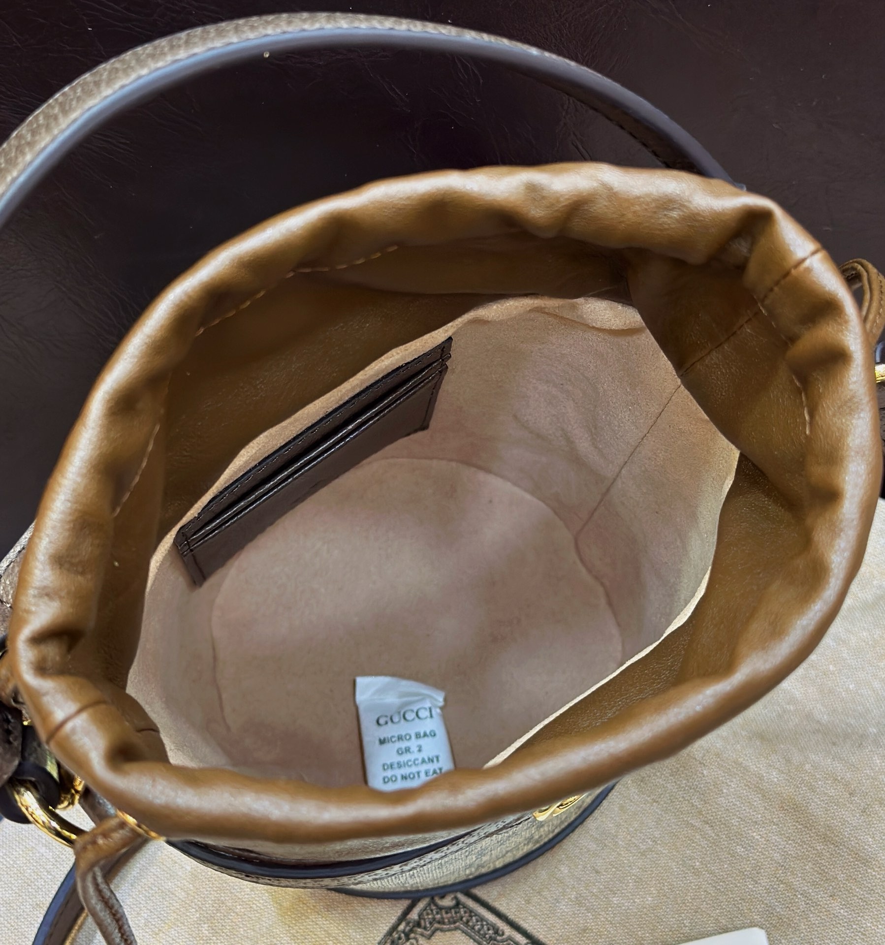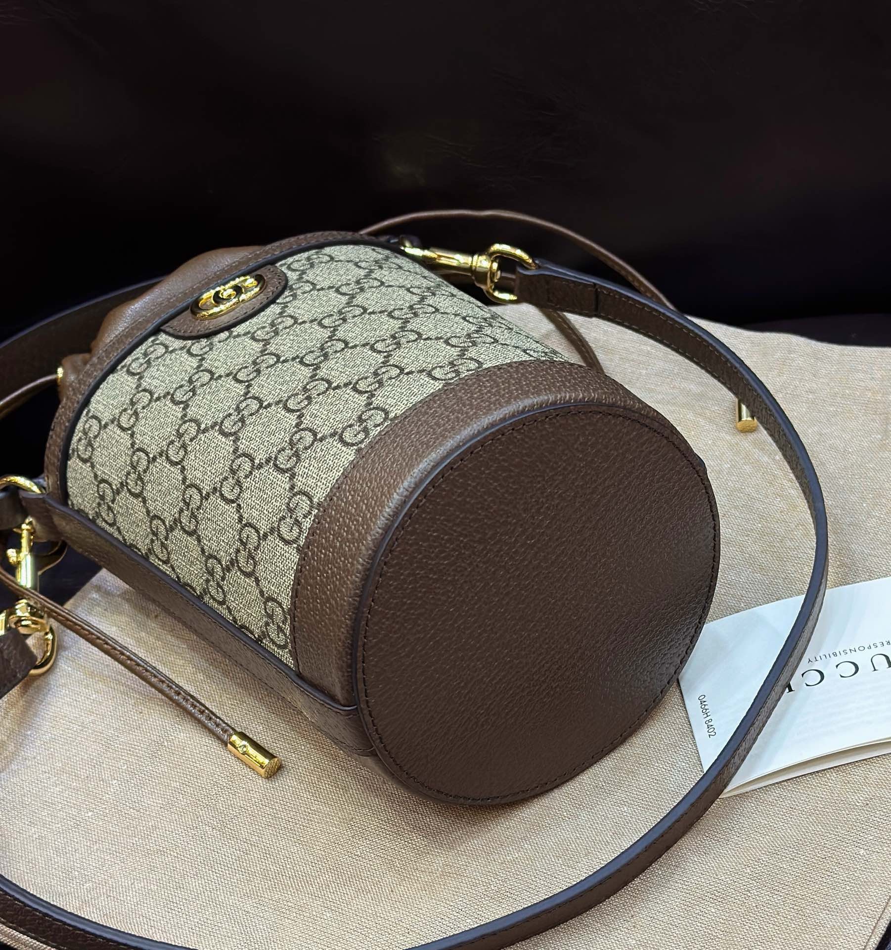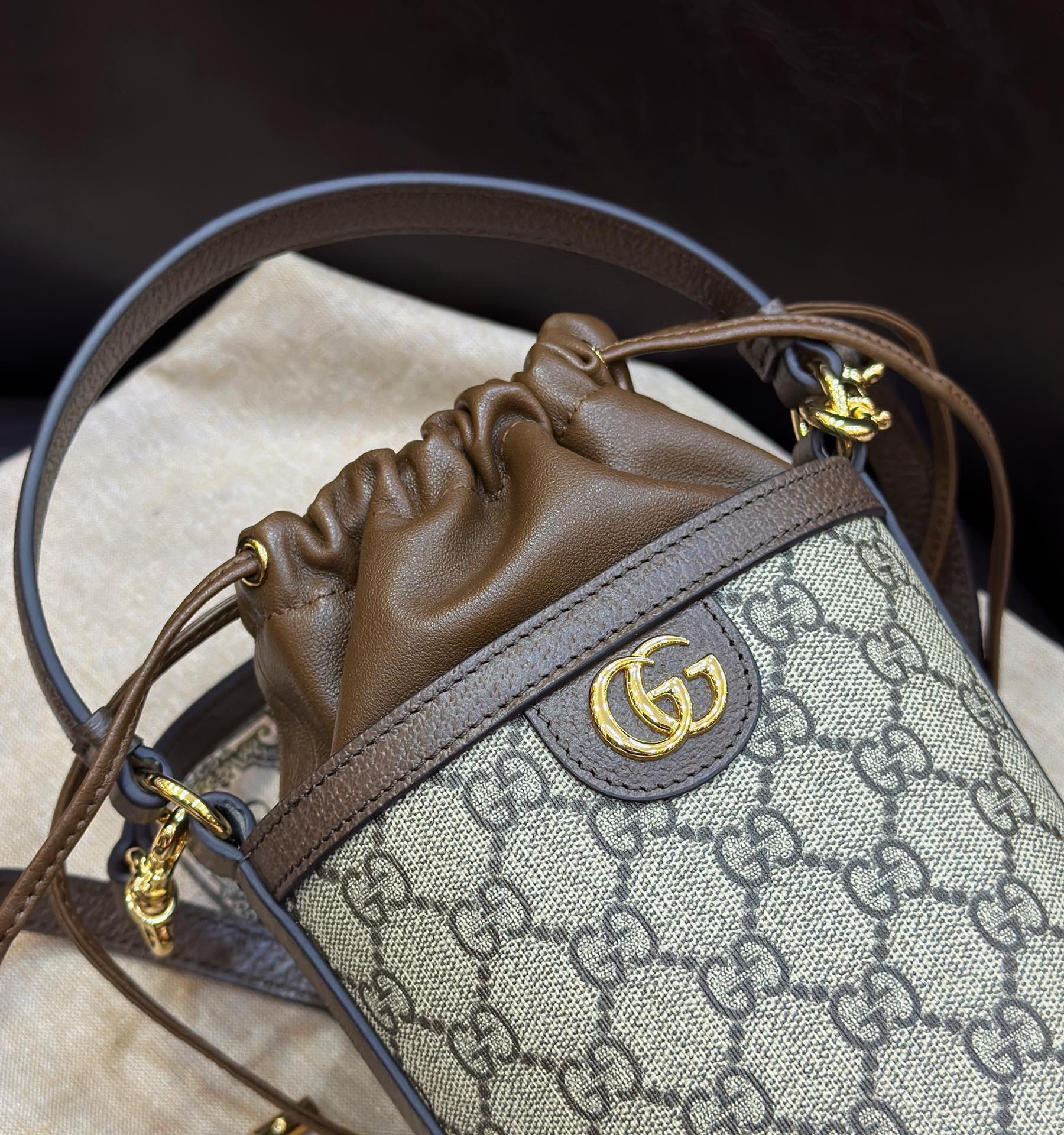 Hardware on this mini bucket bag is crafted from polished gold-toned metal, ensuring a luxurious shine and robust functionality. The prominent Double G logo, strap clasps, and internal rings all reflect this premium finish. While exact dimensions can vary slightly, this mini bucket bag typically measures around 16 cm in height, 10 cm in width, and 10 cm in depth, making it an ideal compact companion.