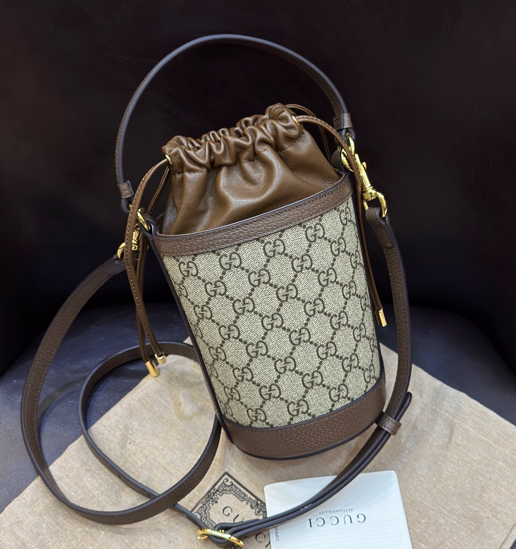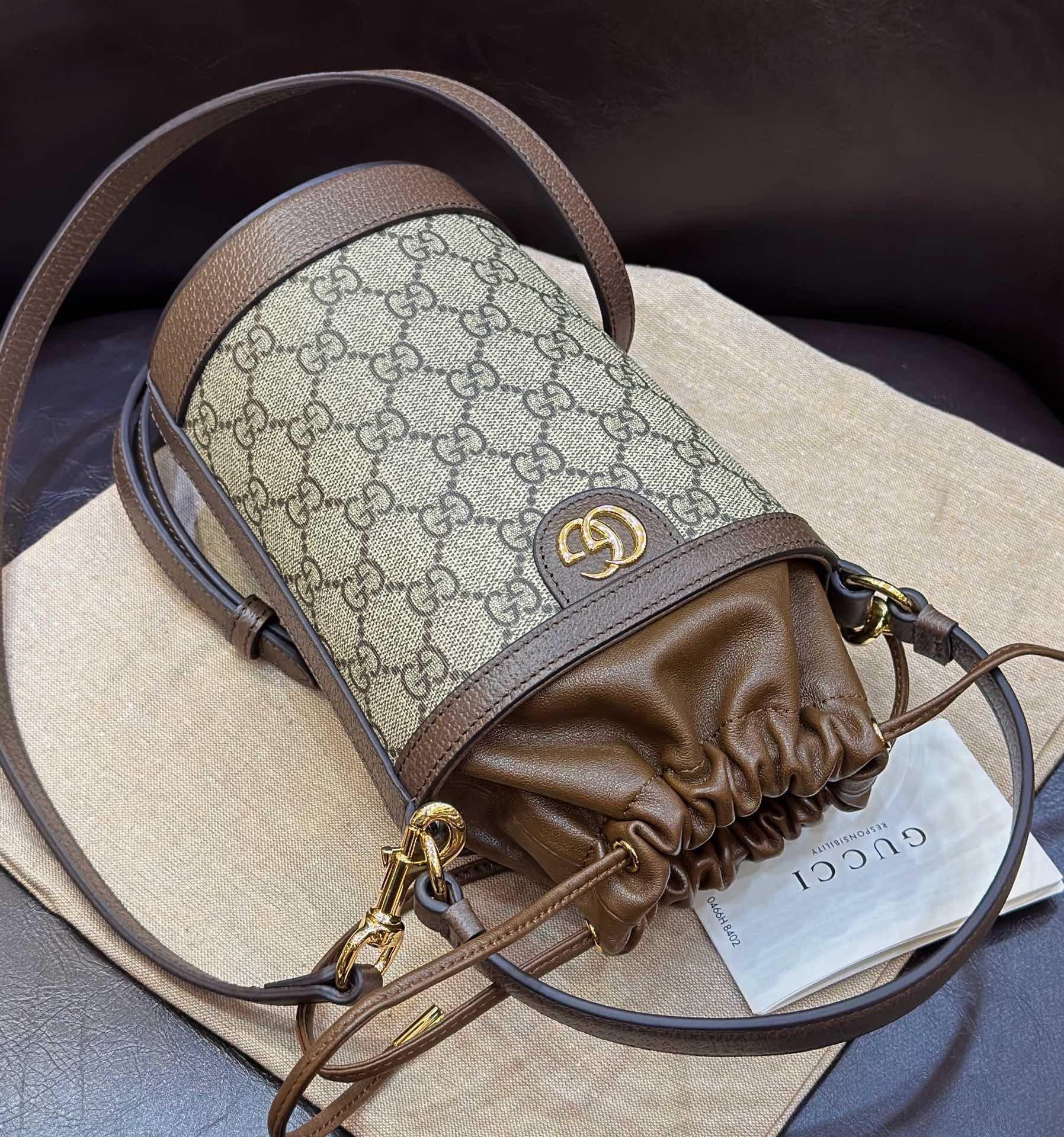 Crafted for the discerning individual, this mini bucket bag seamlessly blends the classic GG Supreme canvas with rich brown leather details. It’s more than just a bag; it's a statement of refined taste and impeccable style, designed to complement any ensemble.