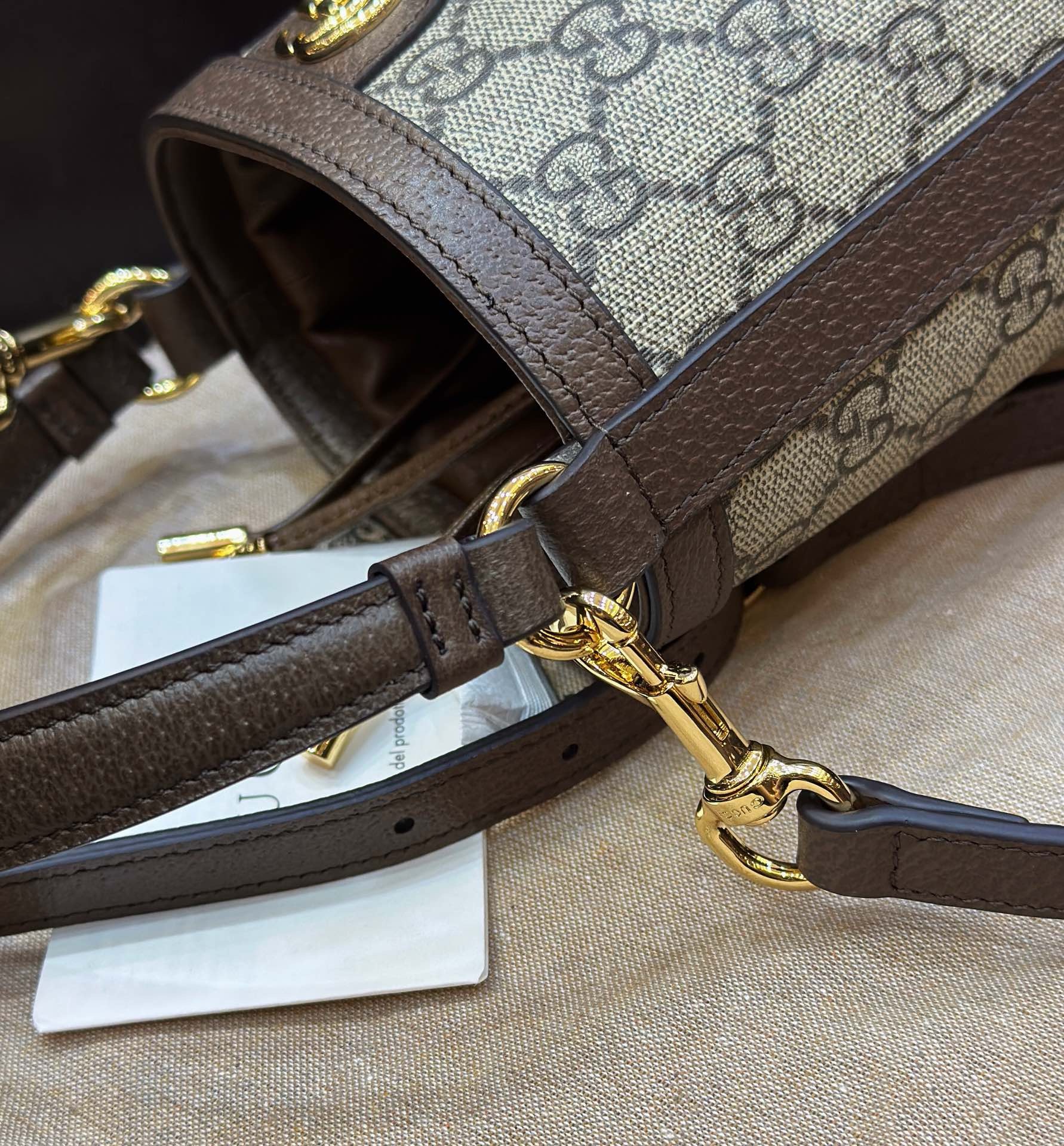 • Gold-Toned Double G Hardware: A prominent, polished Double G logo graces the front, serving as a signature emblem of luxury and brand identity.