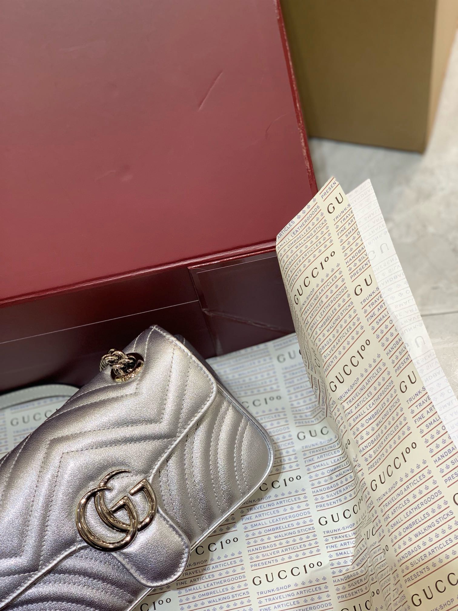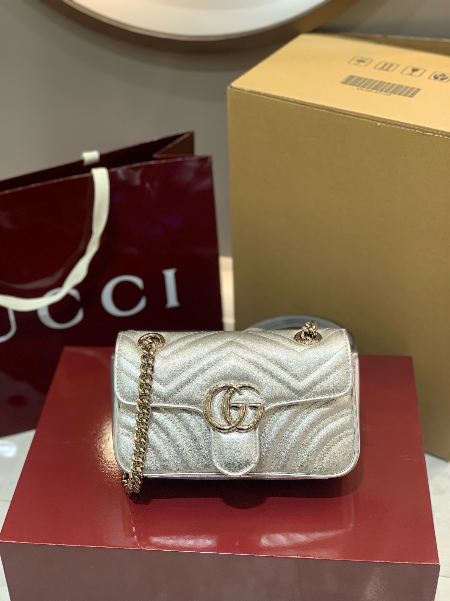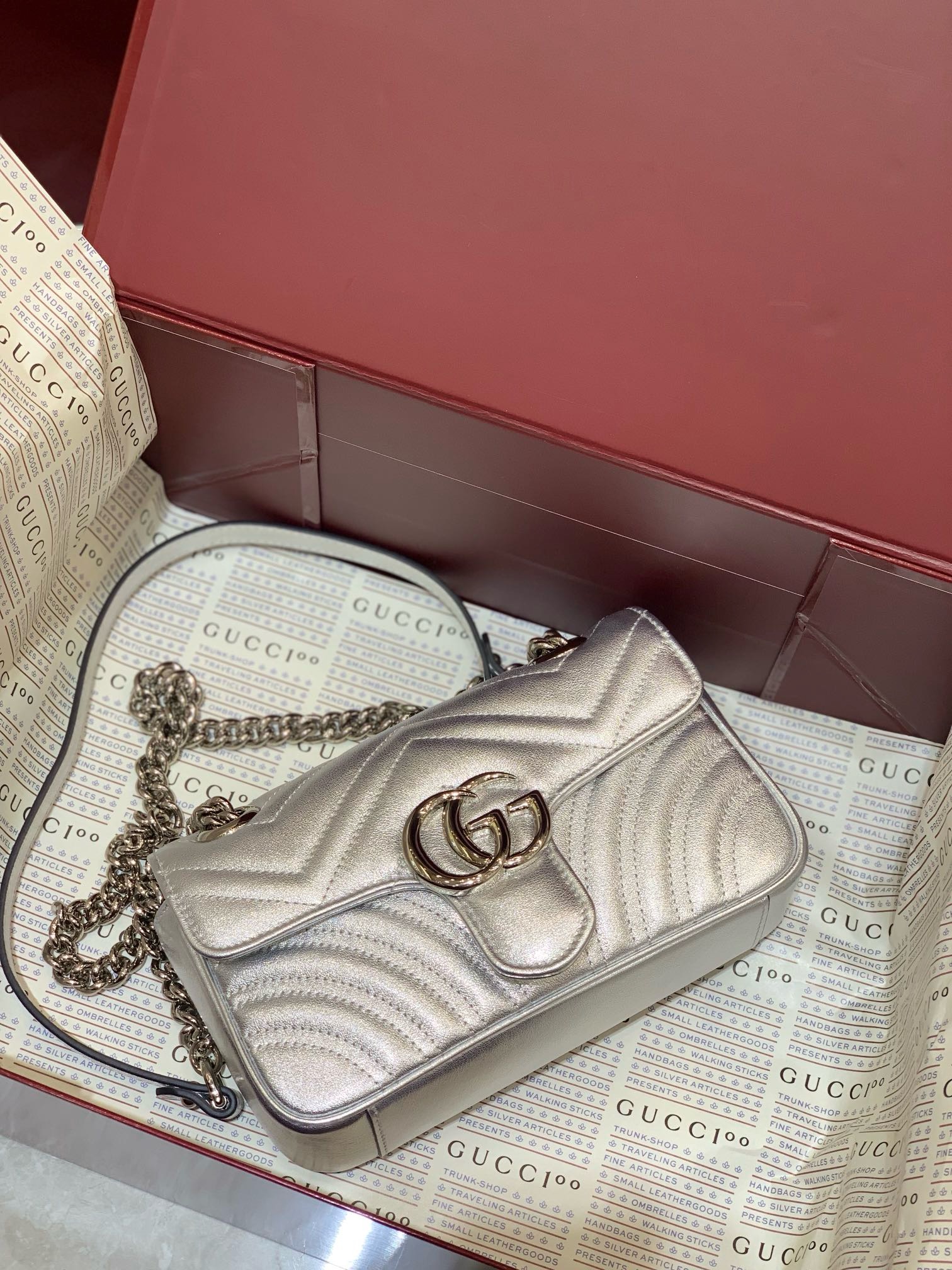 Order your stunning Gucci Silver GG Marmont Mini Bag today and embrace timeless glamour!