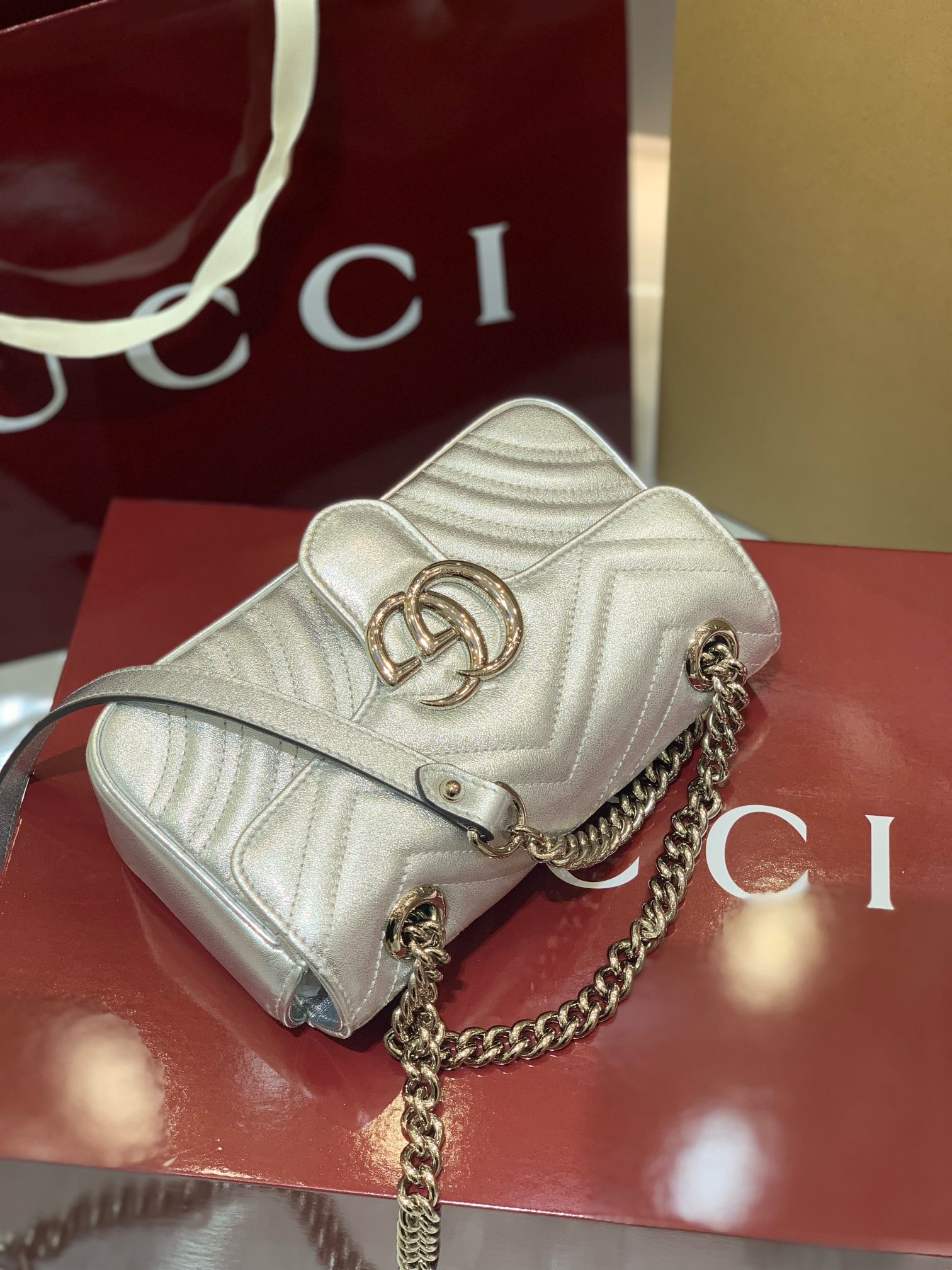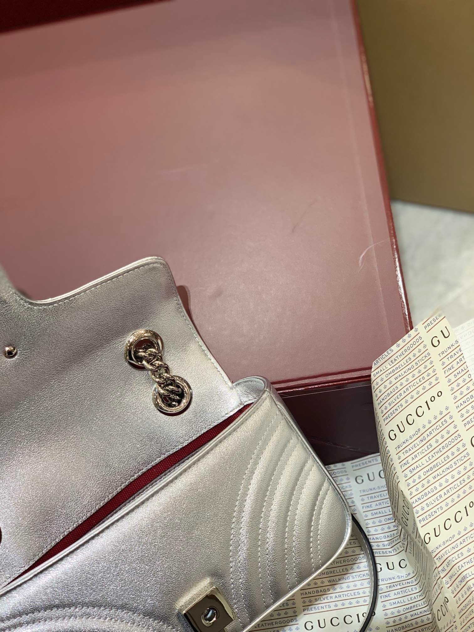 The hardware is a crucial element, featuring antique silver-toned metal for the iconic Double G emblem and the versatile chain strap. This finish provides a sophisticated contrast to the metallic silver leather, ensuring the bag remains a focal point.