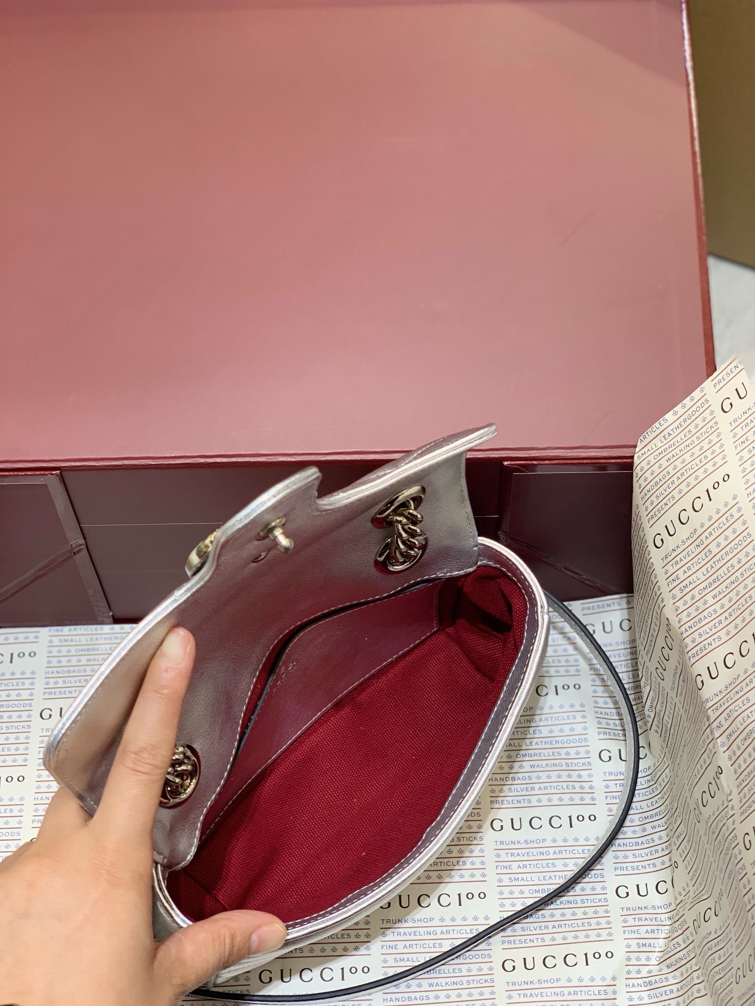 To ensure your Gucci Silver GG Marmont Mini Bag maintains its pristine condition and radiant metallic finish for years to come, proper care is essential. Handle your bag with gentle hands, avoiding contact with abrasive surfaces that could scratch the delicate metallic leather.