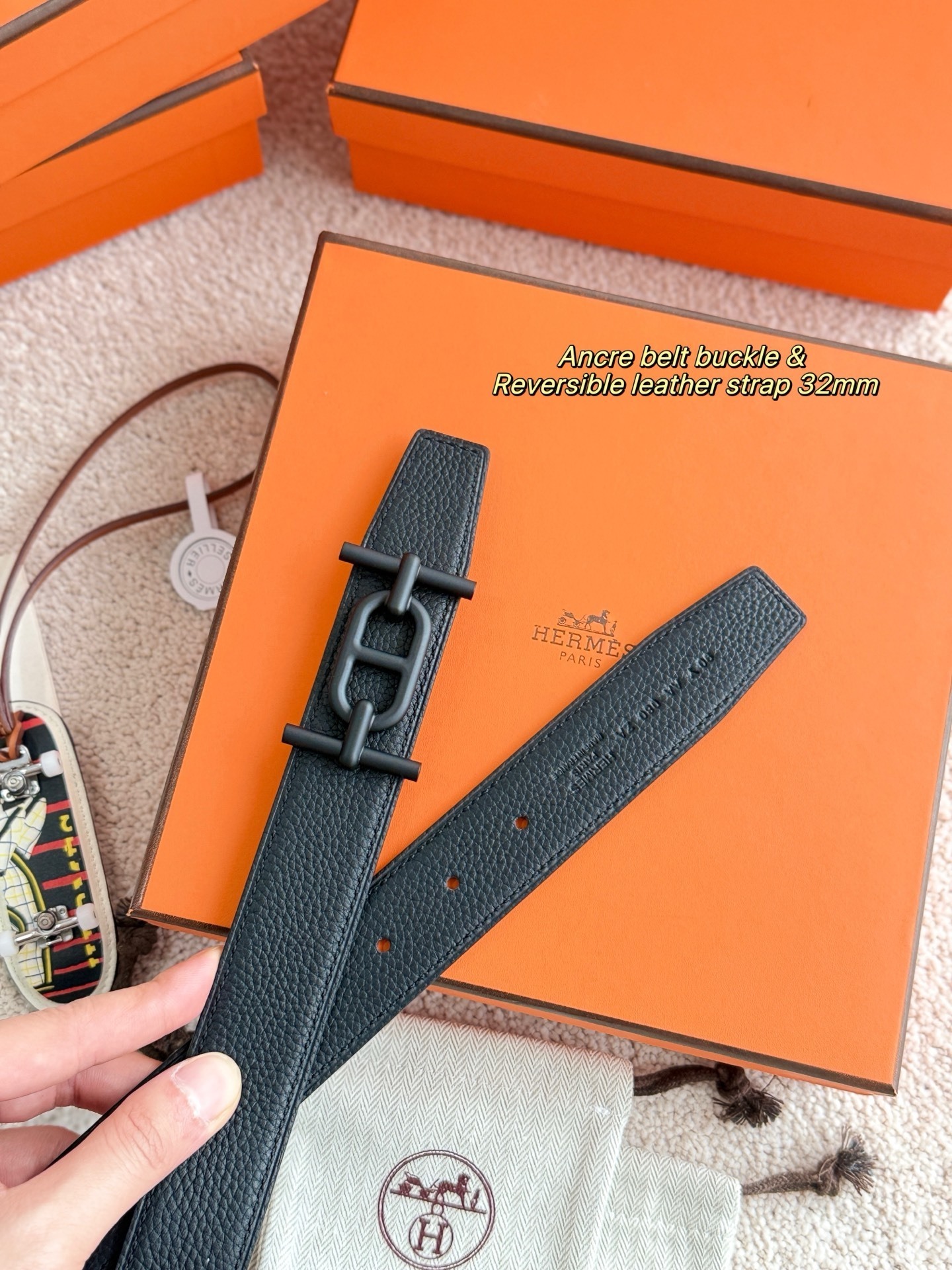 Elevate your wardrobe with the sophisticated Hermes Ancre Belt. This exquisite accessory features the iconic Ancre (Anchor) buckle in a modern matte black finish, paired with a high-quality 32mm reversible leather strap. Designed for the modern individual, it seamlessly blends timeless elegance with contemporary style.