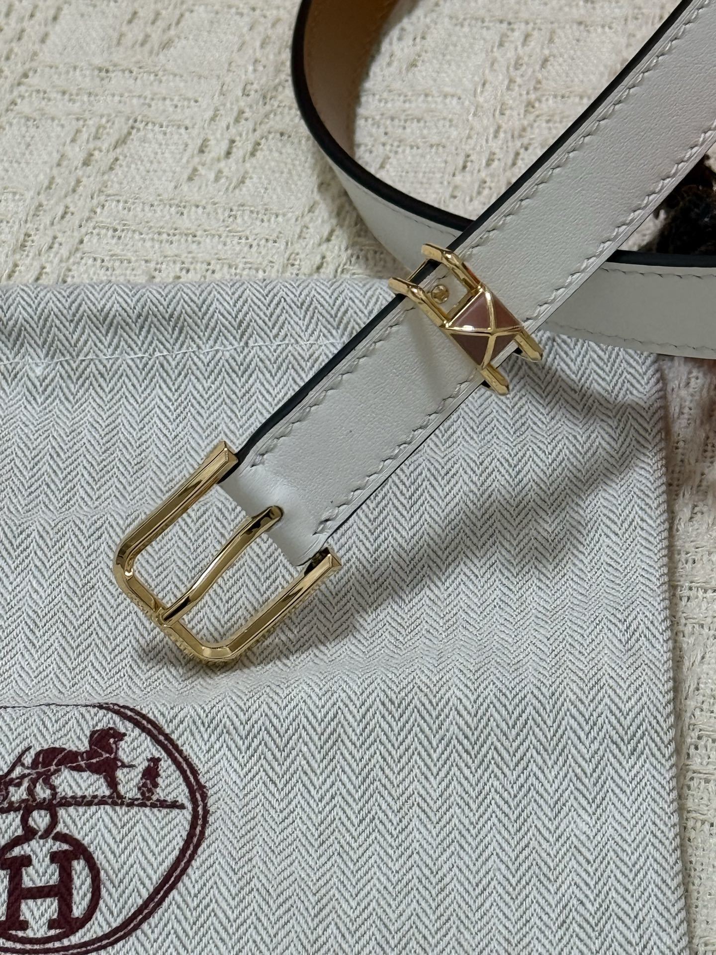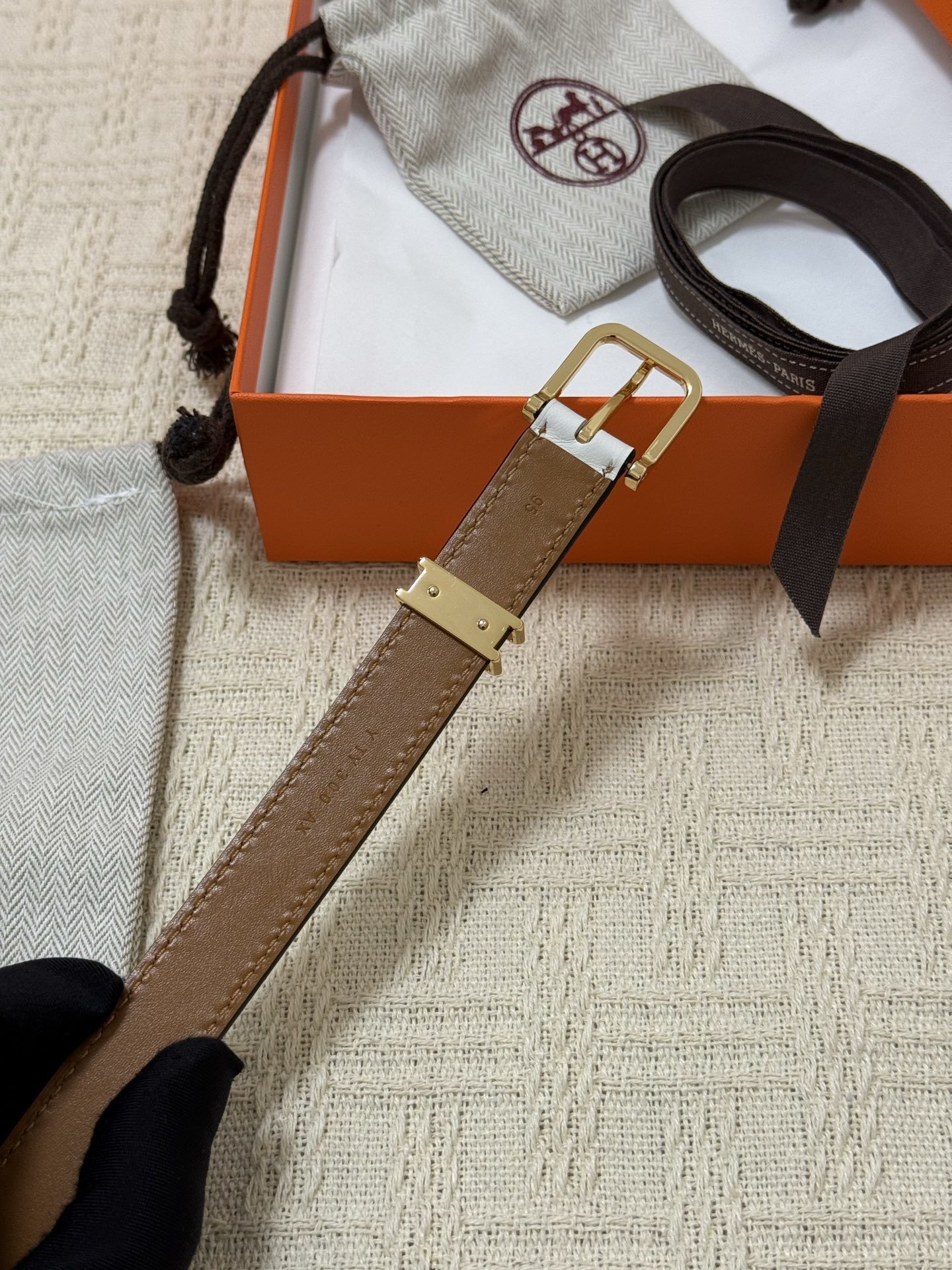 Brown leather belt with gold metal buckle engraved with Miu Miu