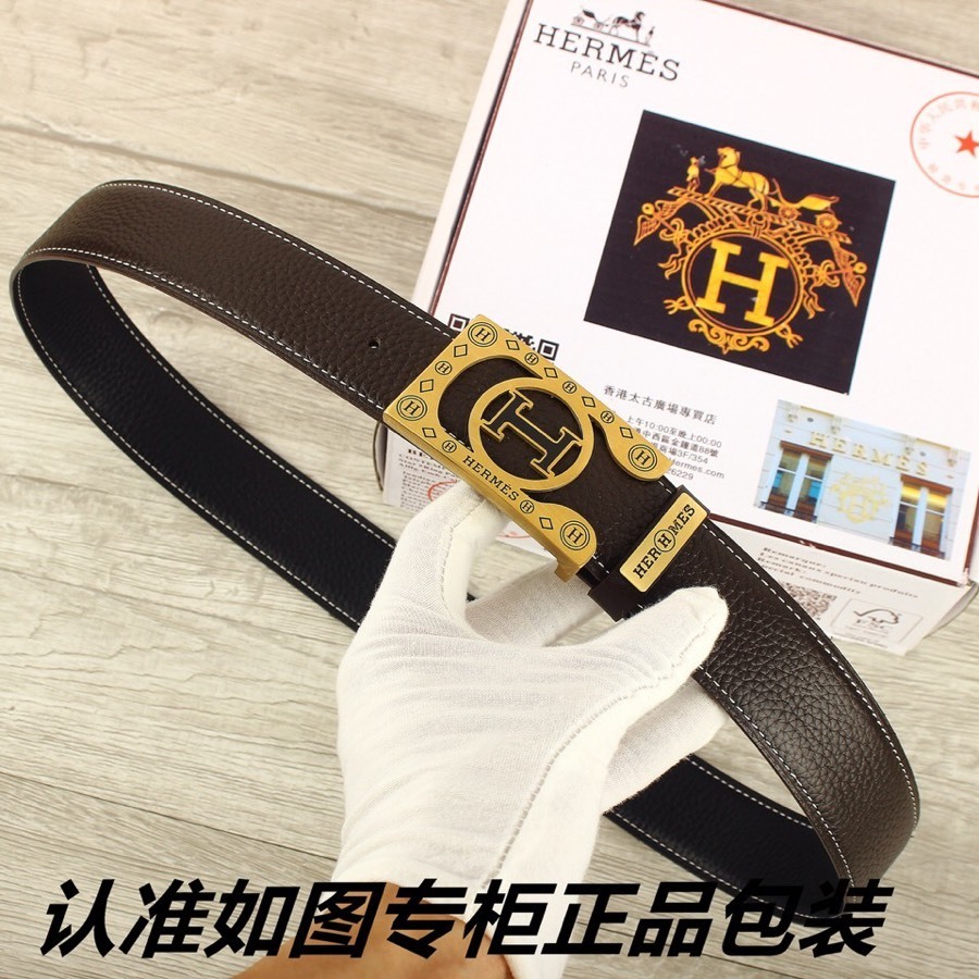 Hermes Men's Premium Pebbled Leather Belt with Gold H Buckle
