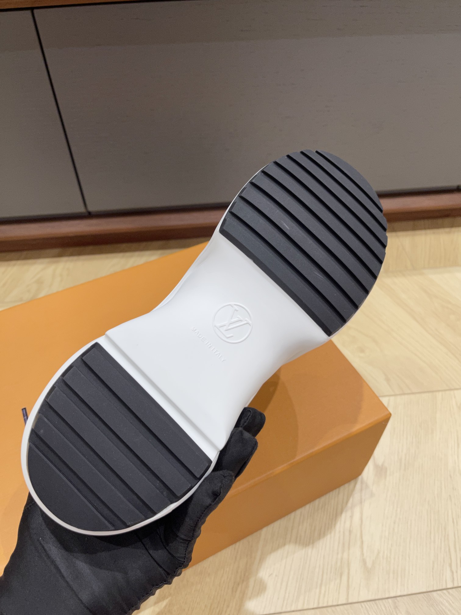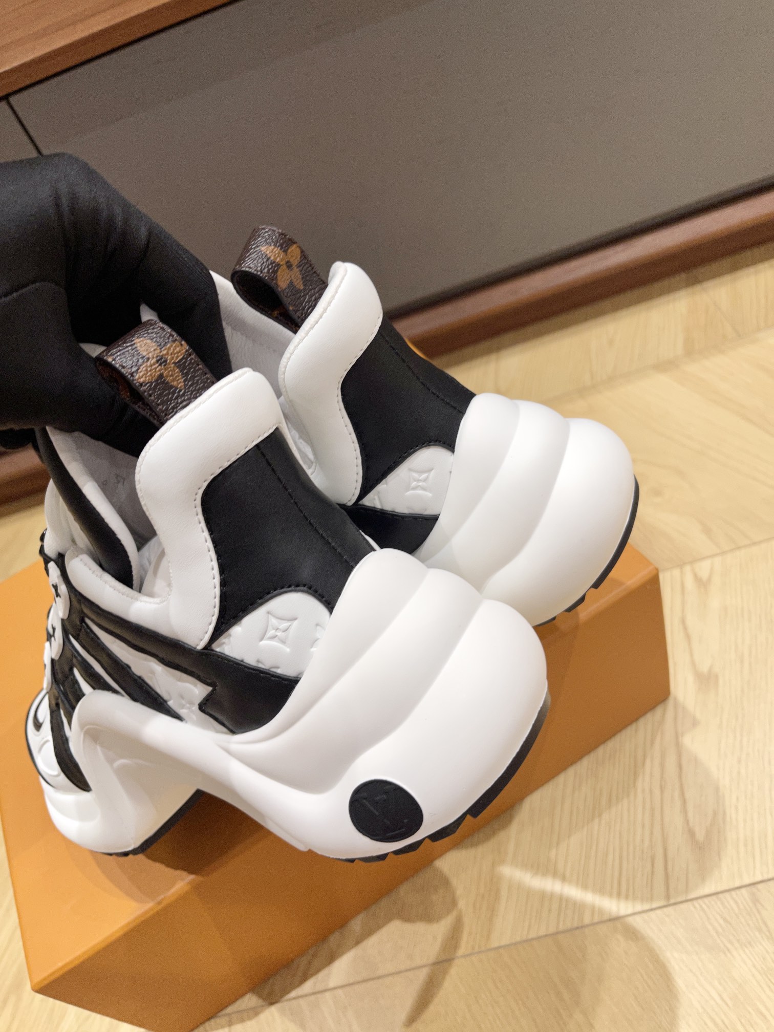 The Louis Vuitton Archlight Sneakers in white and black are an iconic statement piece that perfectly combines futuristic design with signature LV craftsmanship. Made from premium calfskin leather and technical fabric, these sneakers feature the brand’s signature oversized tongue, wave-shaped outsole, and contrasting black monogram details. The lightweight rubber sole offers exceptional comfort and height, while the elastic laces ensure an easy slip-on fit.