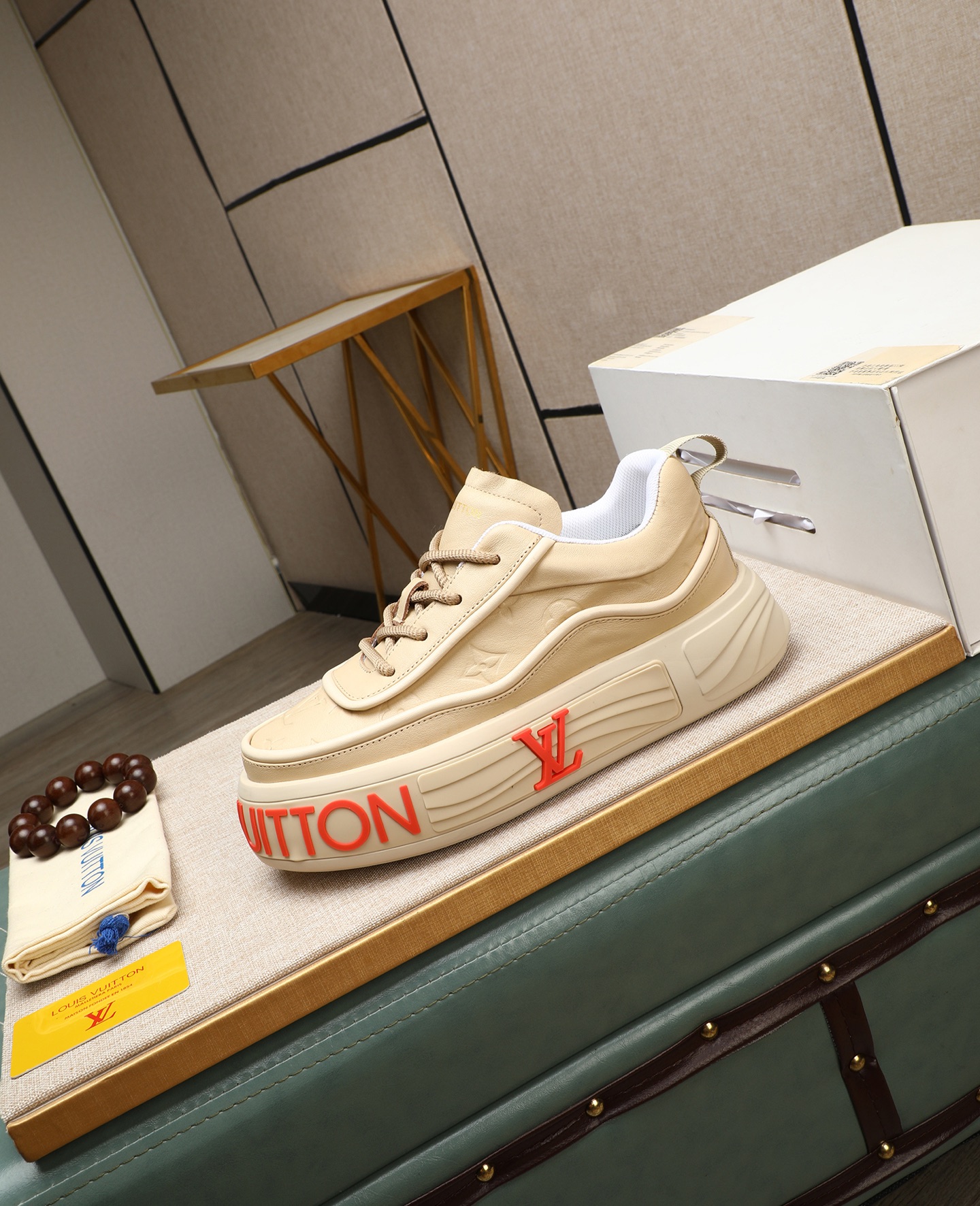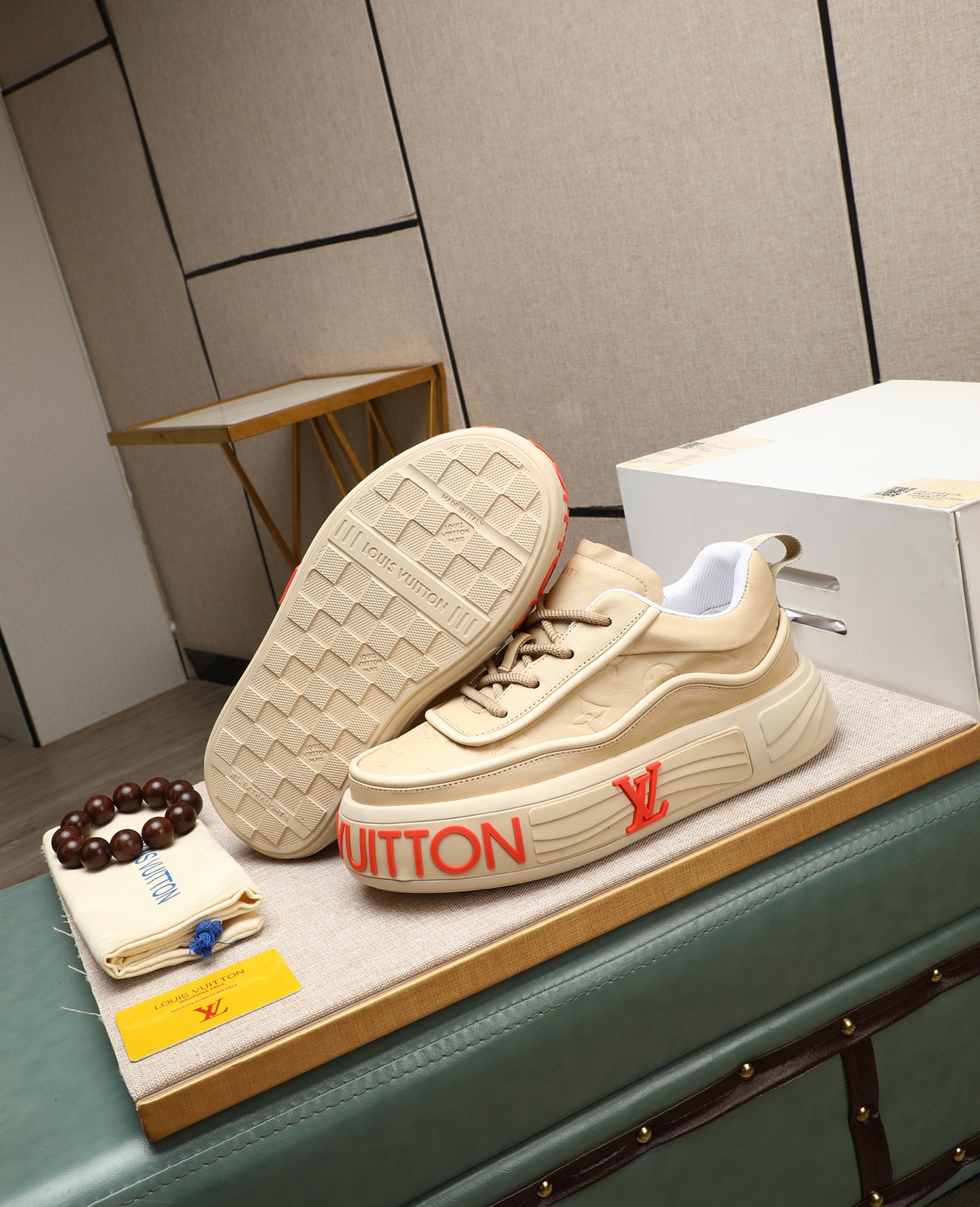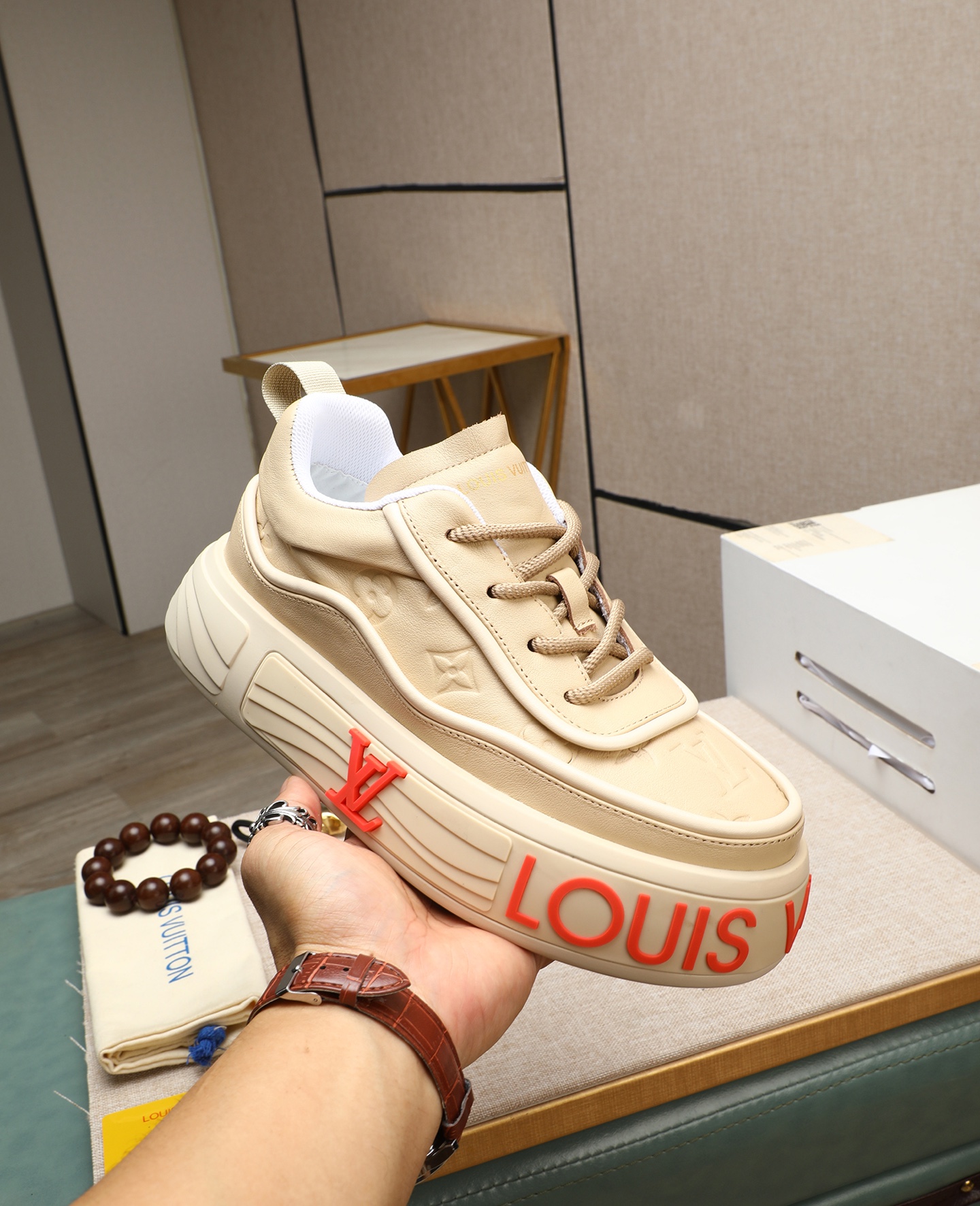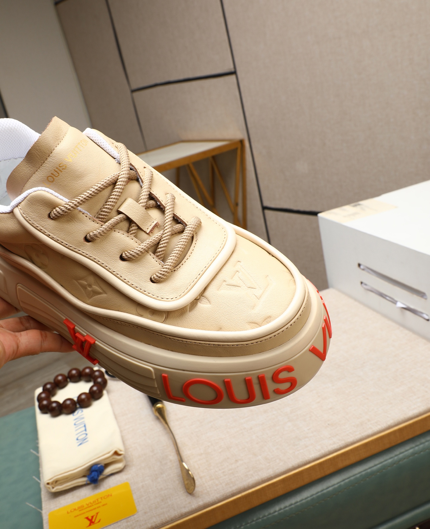 The Louis Vuitton Beige Monogram Leather Sneakers combine modern streetwear appeal with refined luxury. Crafted from supple beige leather embossed with the signature Monogram pattern, these men’s sneakers stand out with bold orange LV branding on the sole and side. The chunky white rubber outsole provides lightweight cushioning and durability, while the padded collar and tongue ensure all-day comfort. With a versatile design that pairs easily with casual or upscale outfits, these sneakers are a must-have statement piece for the contemporary gentleman.