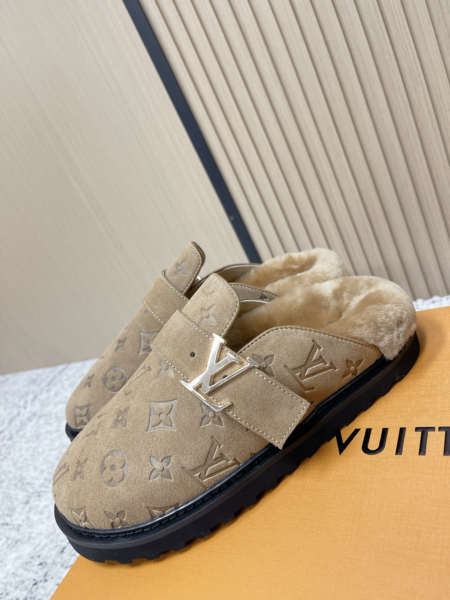 Louis Vuitton Beige Monogram Suede Shearling Comfort Mules