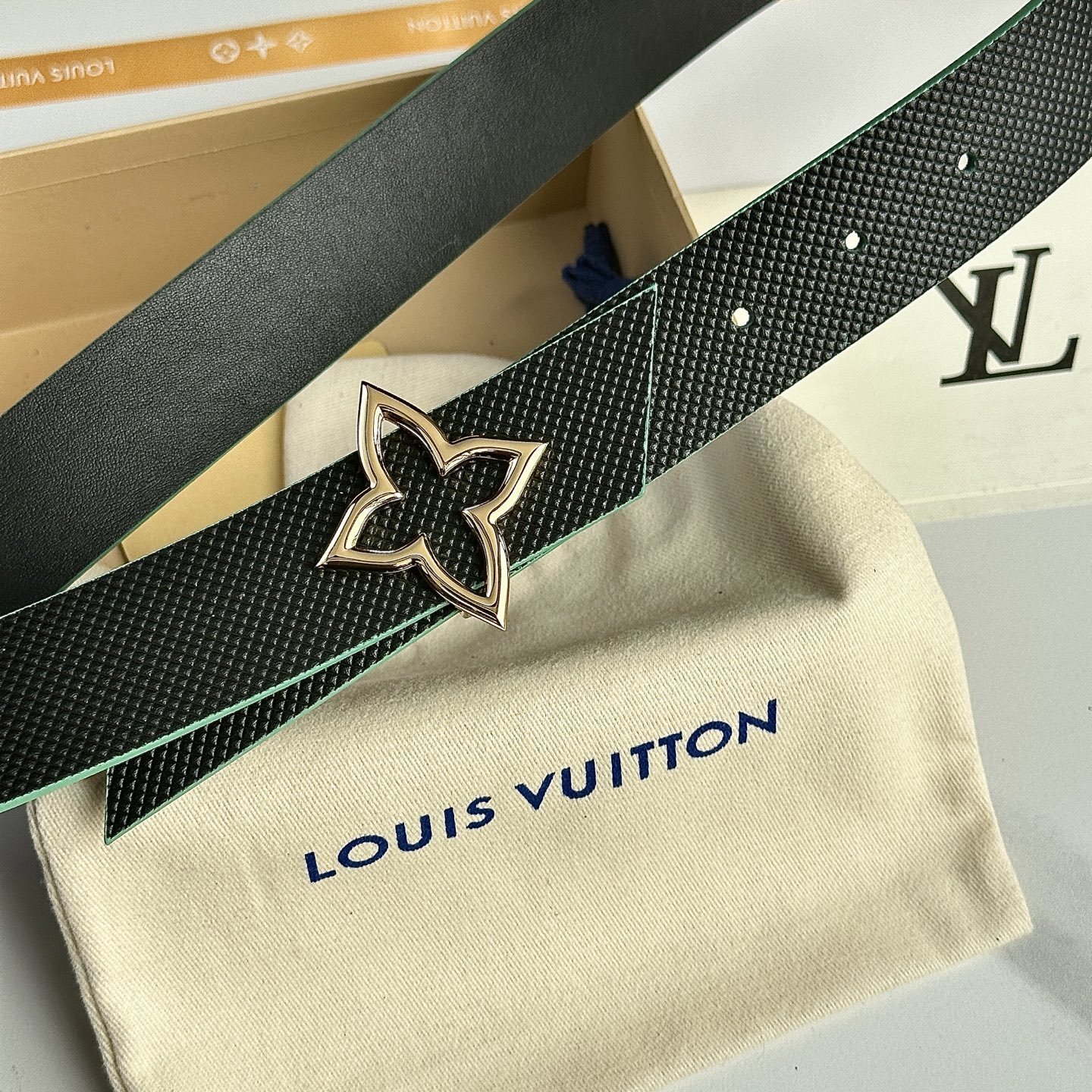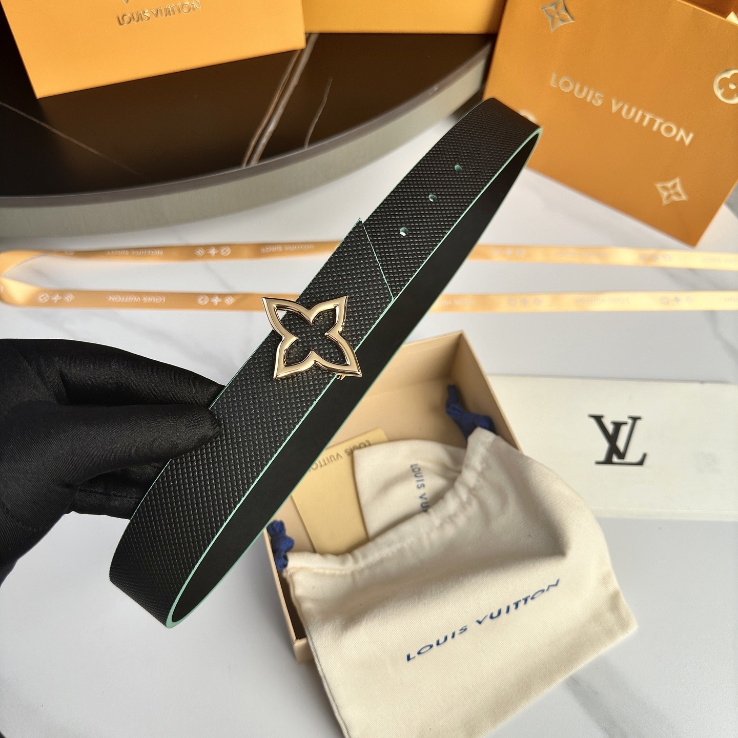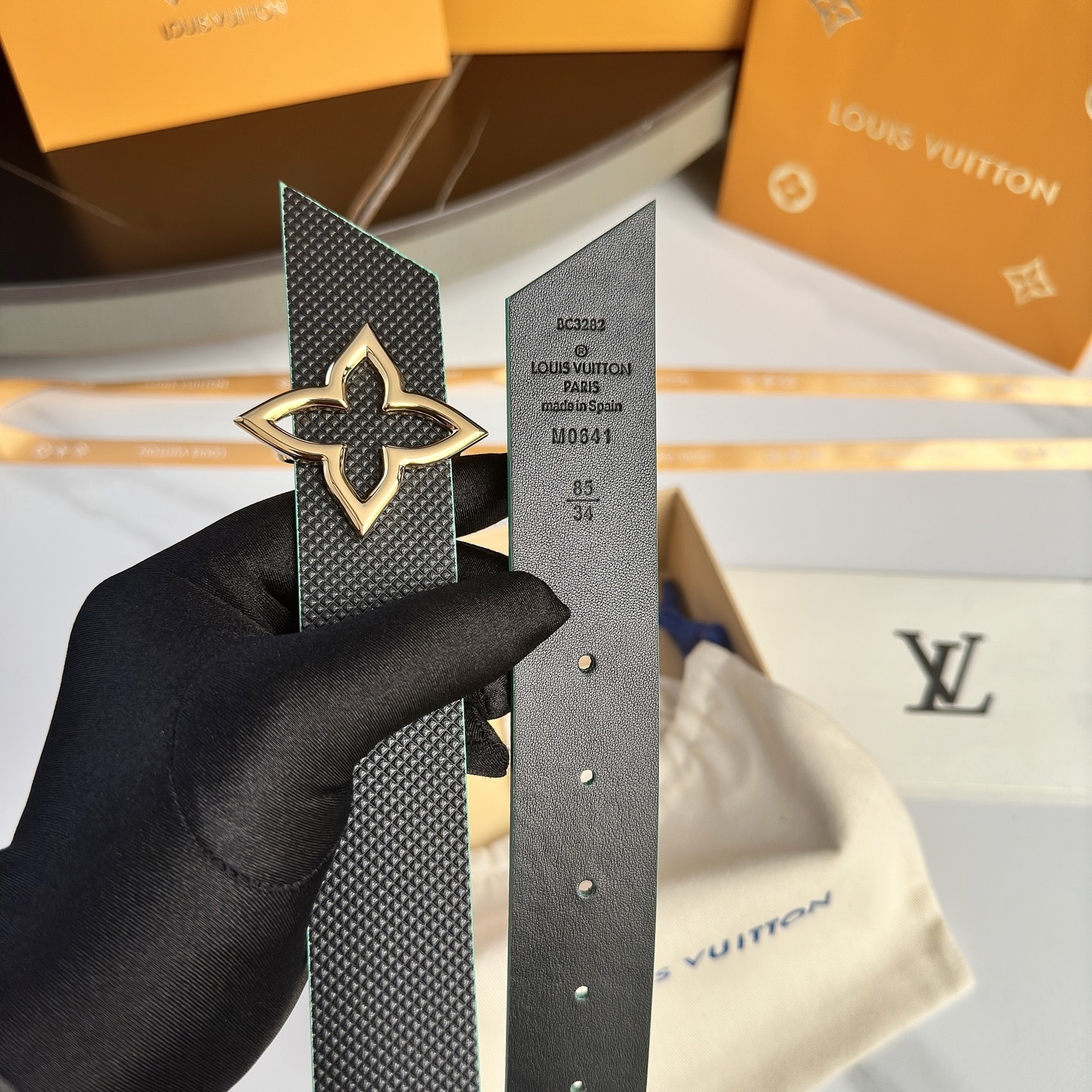 Crafted from premium textured leather, this belt features a subtle yet striking contrast with its vibrant turquoise-colored inner edge. The centerpiece is the iconic Gold-finish Monogram Flower buckle, meticulously designed to showcase the heritage of the Louis Vuitton maison.