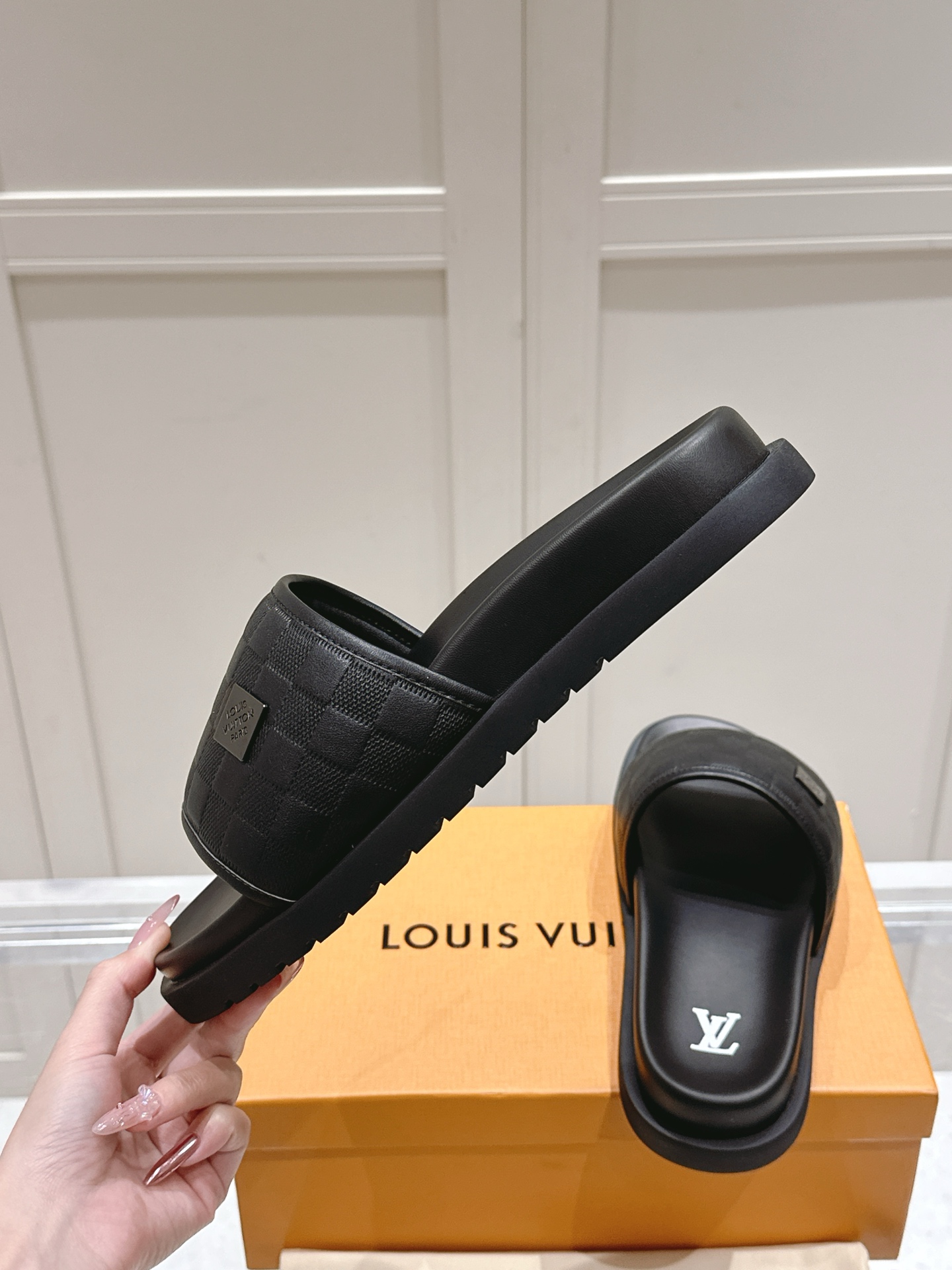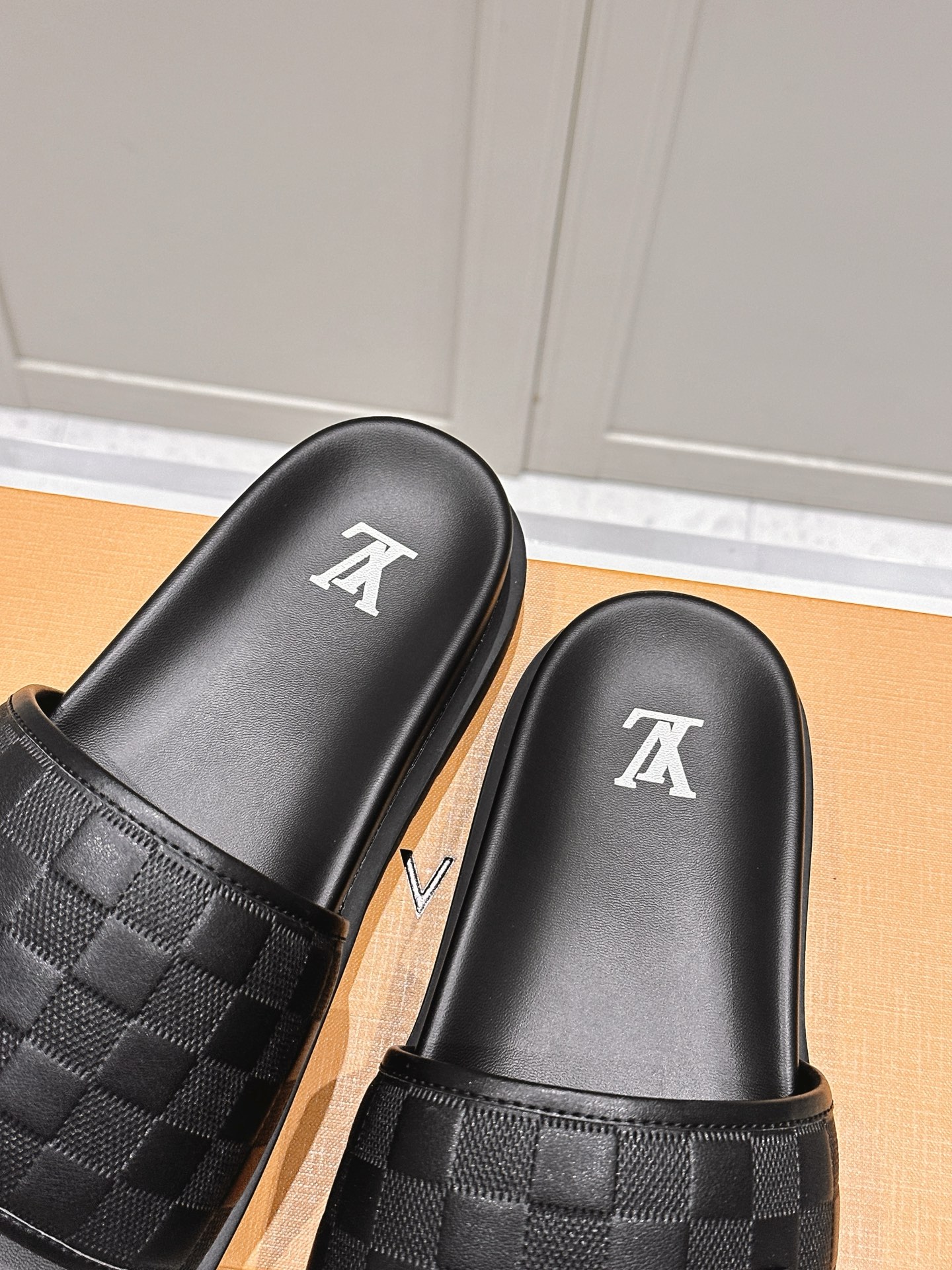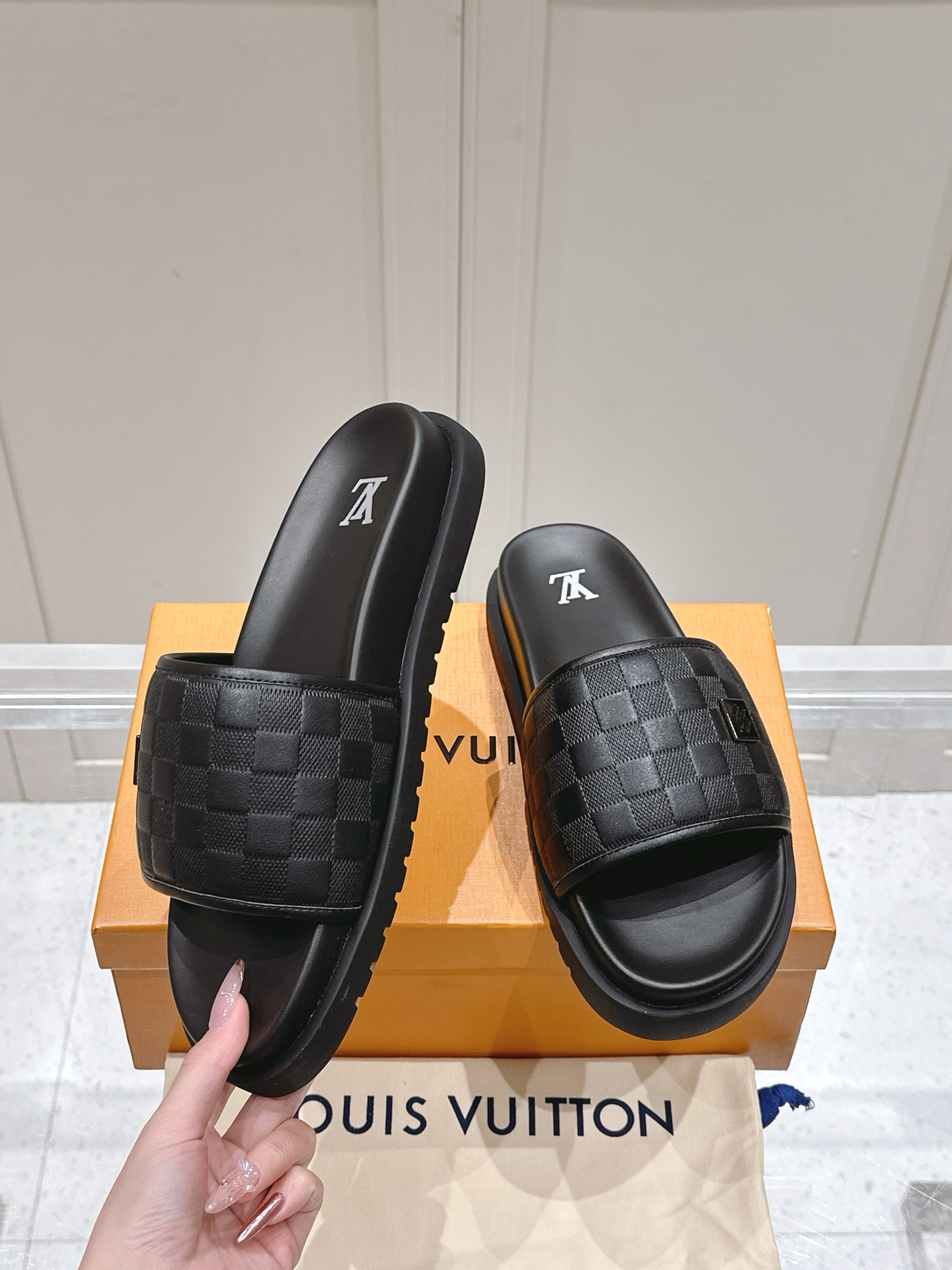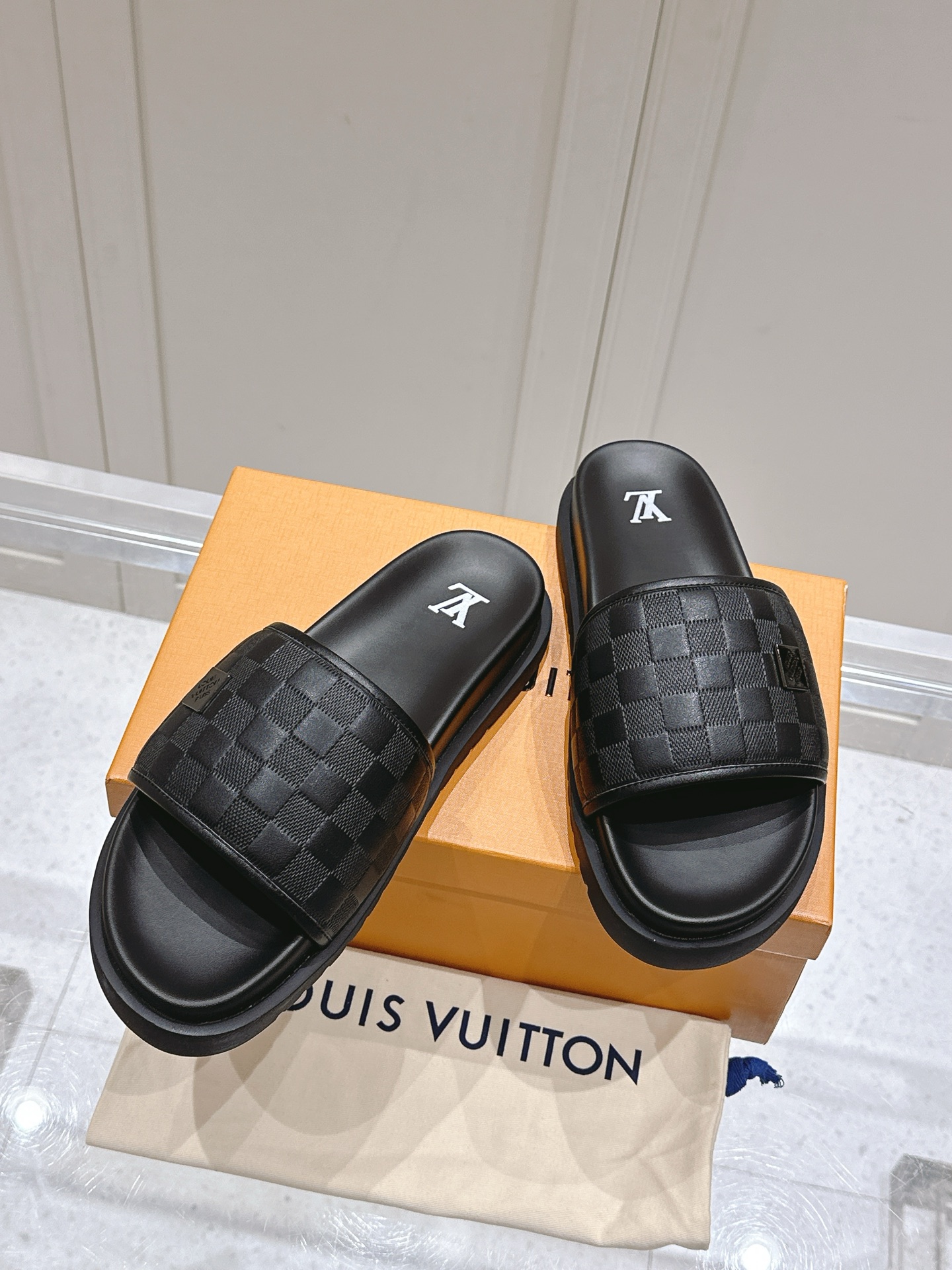 Louis Vuitton Men’s Brown Slide Sandals Damier Pattern Rubber Sole Slip On