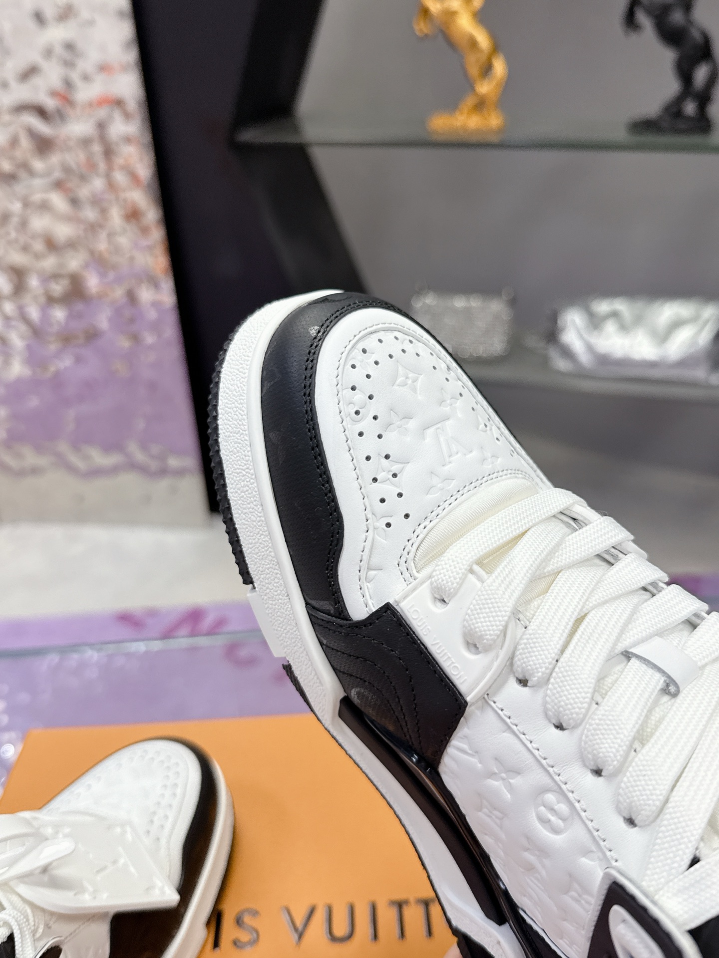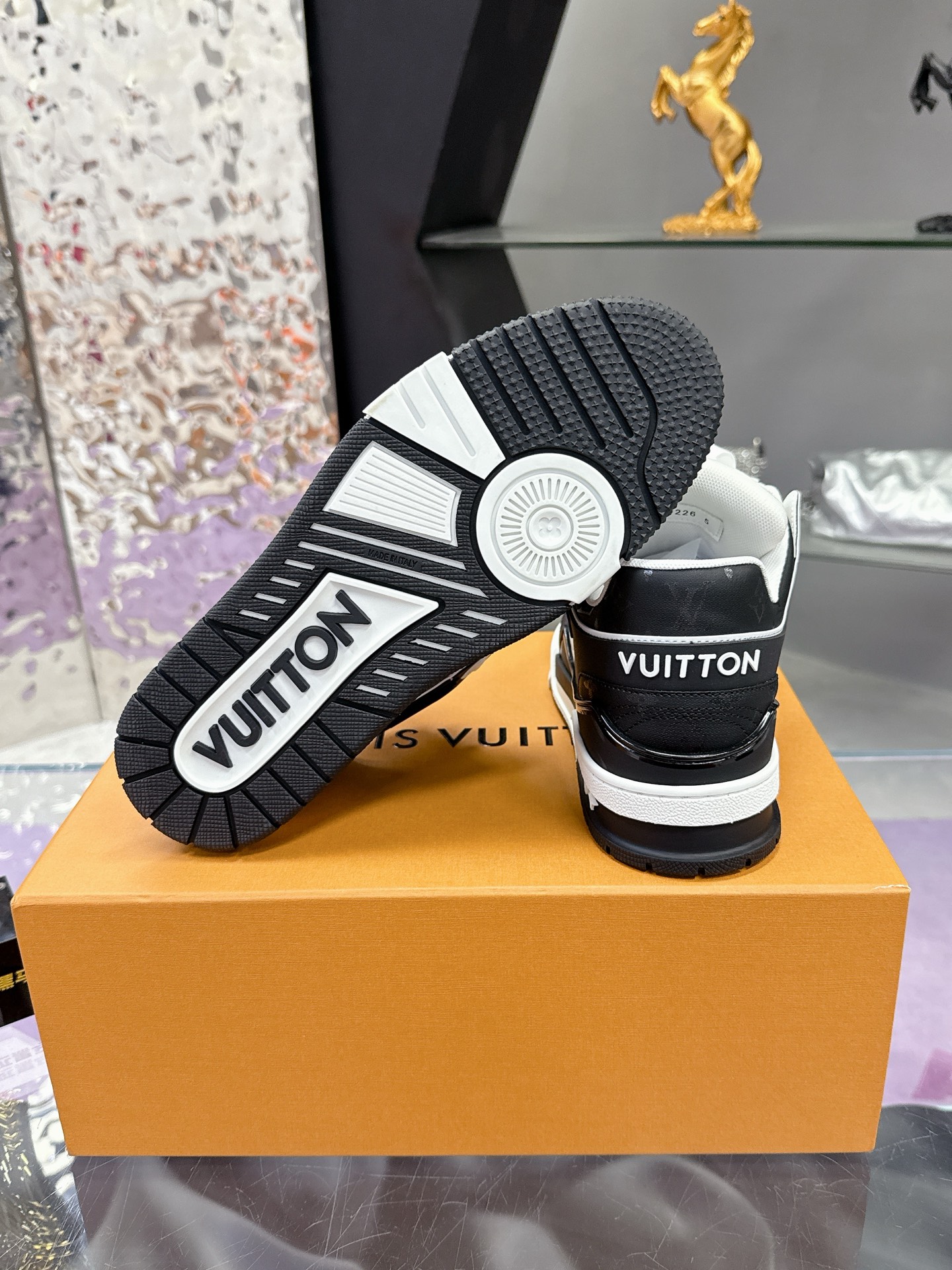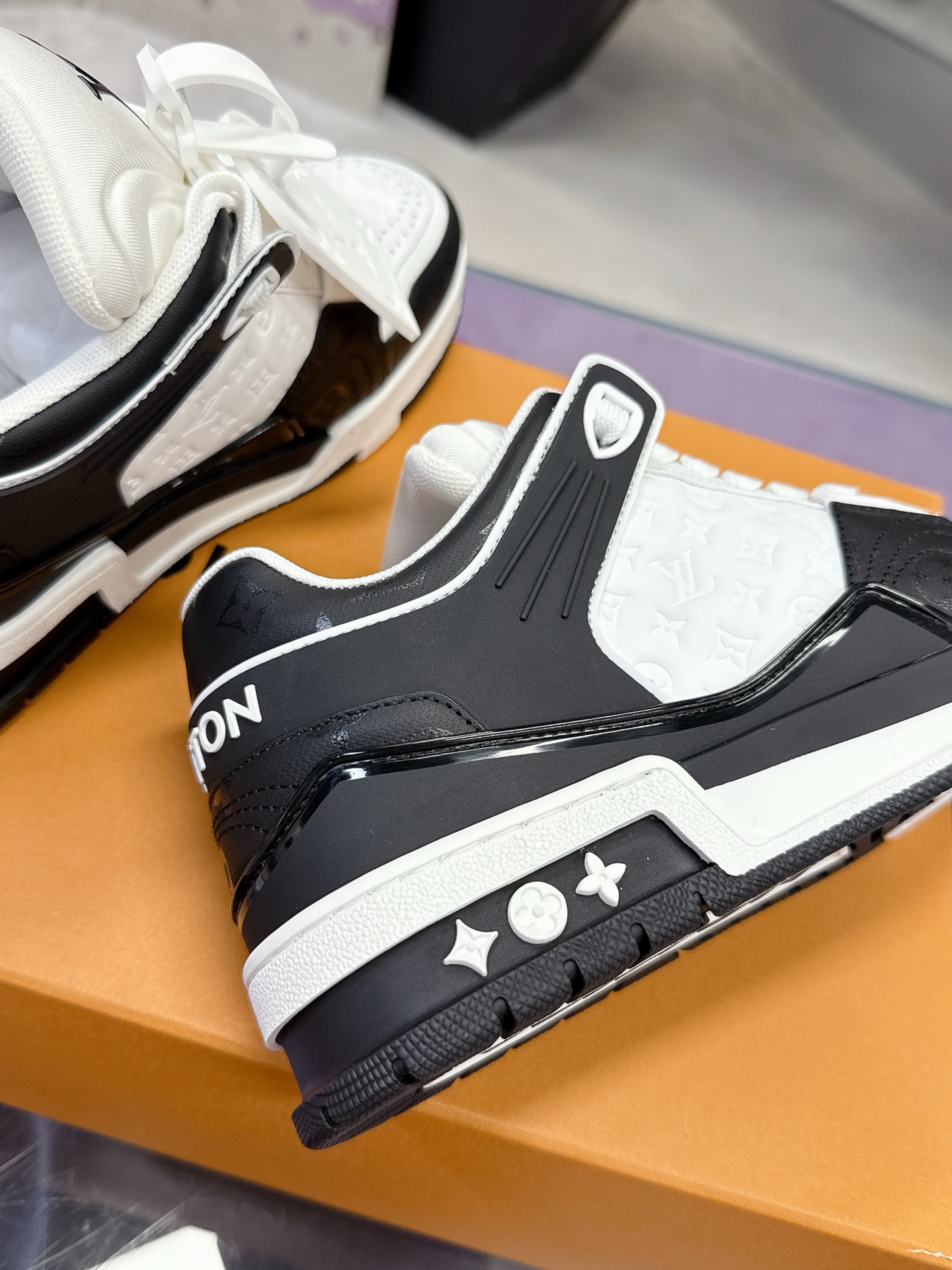 Iconic Louis Vuitton logo details on the tongue and heel