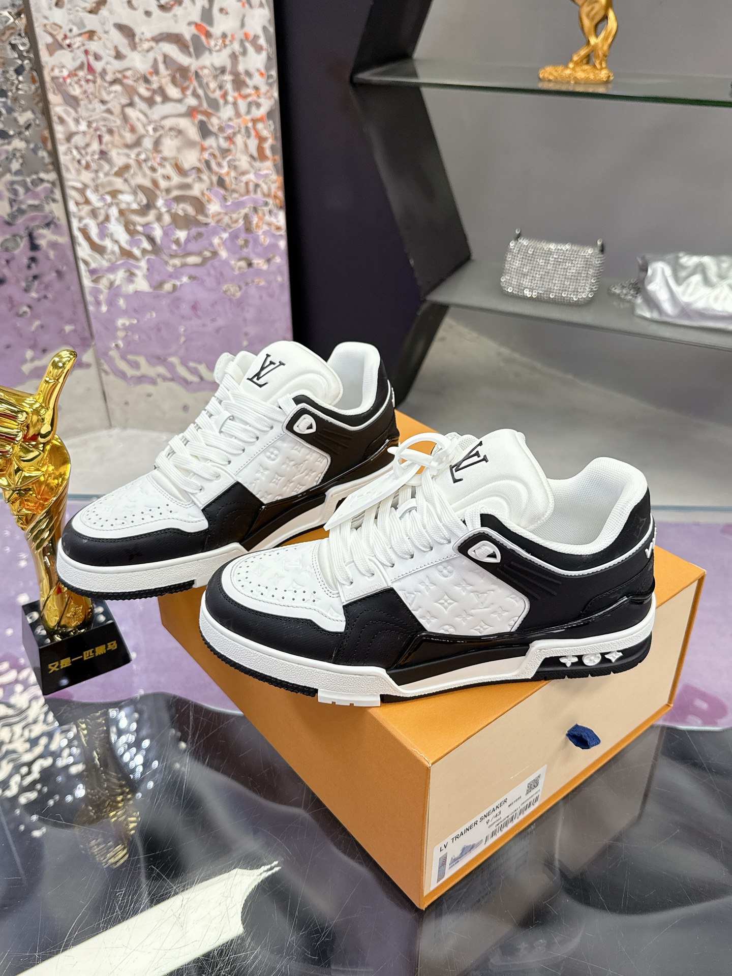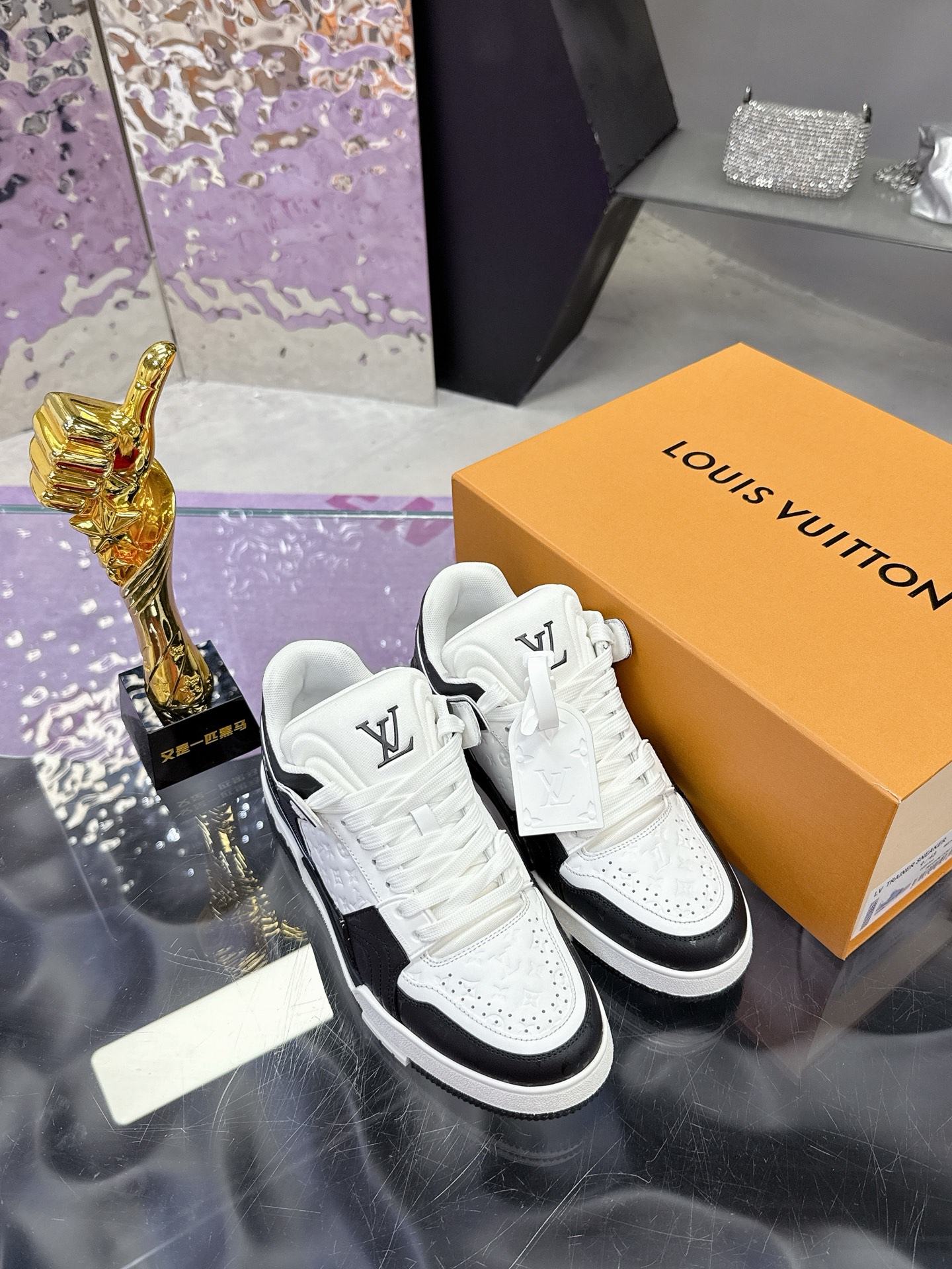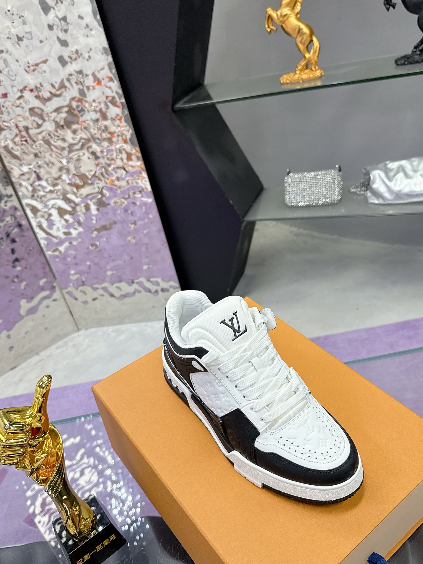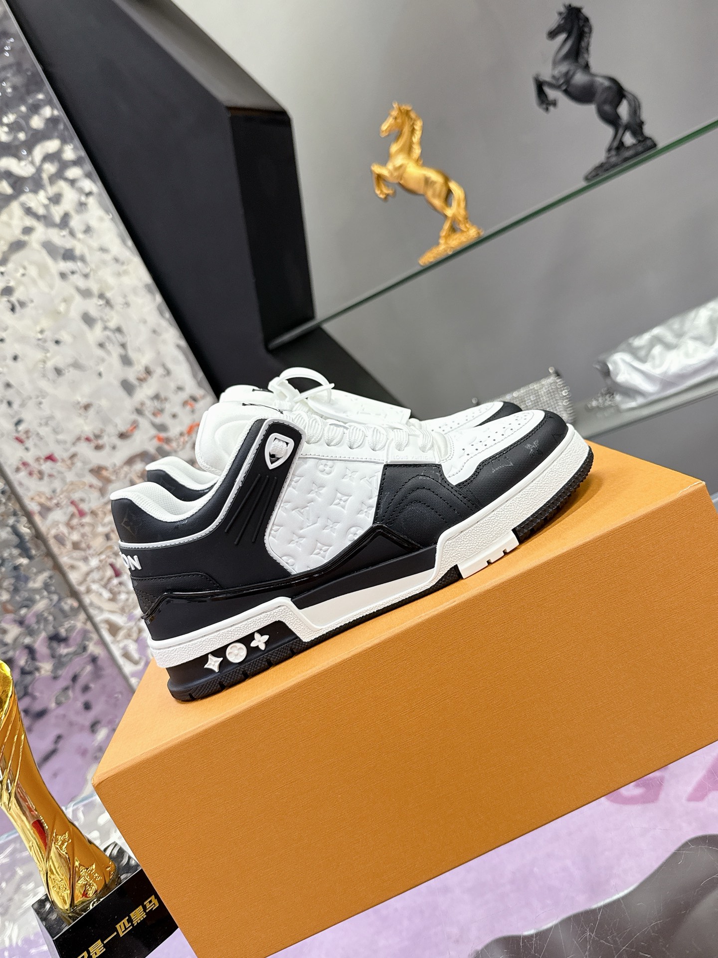 Iconic Louis Vuitton logo details on the tongue and heel