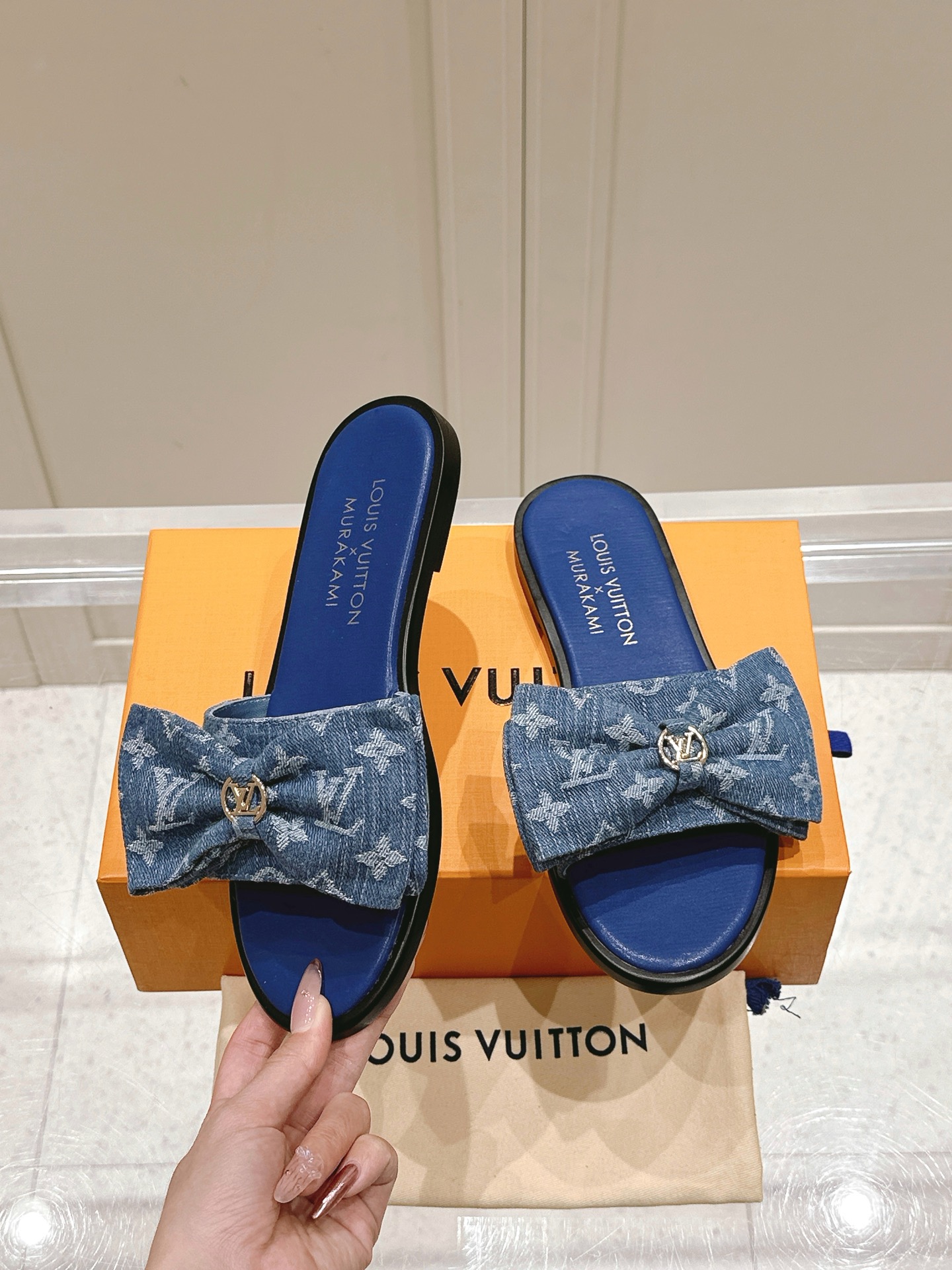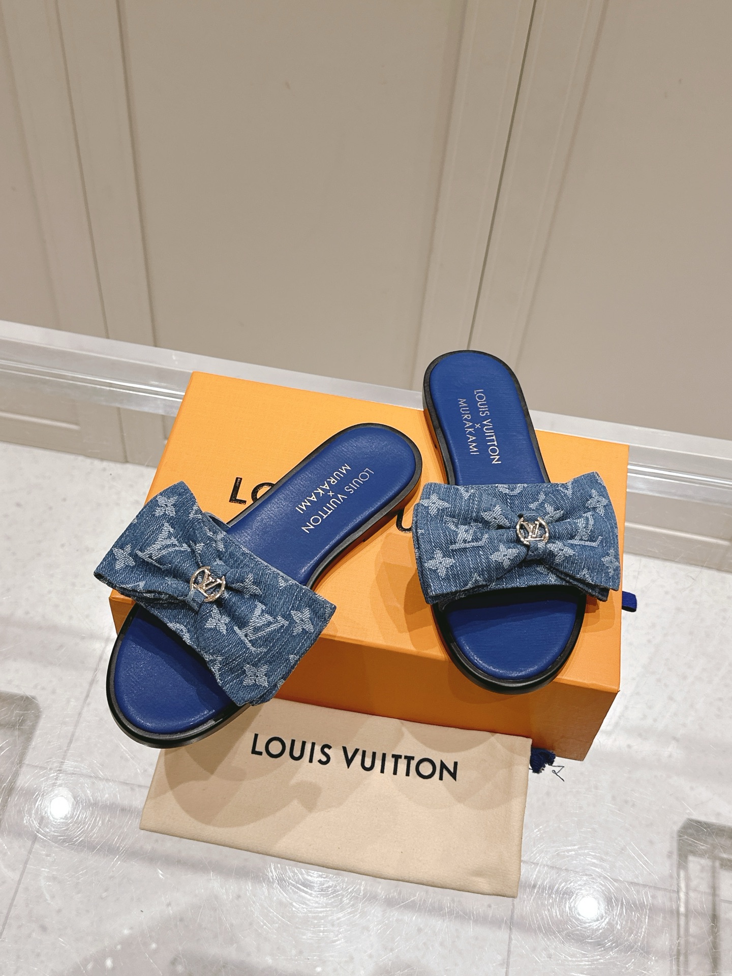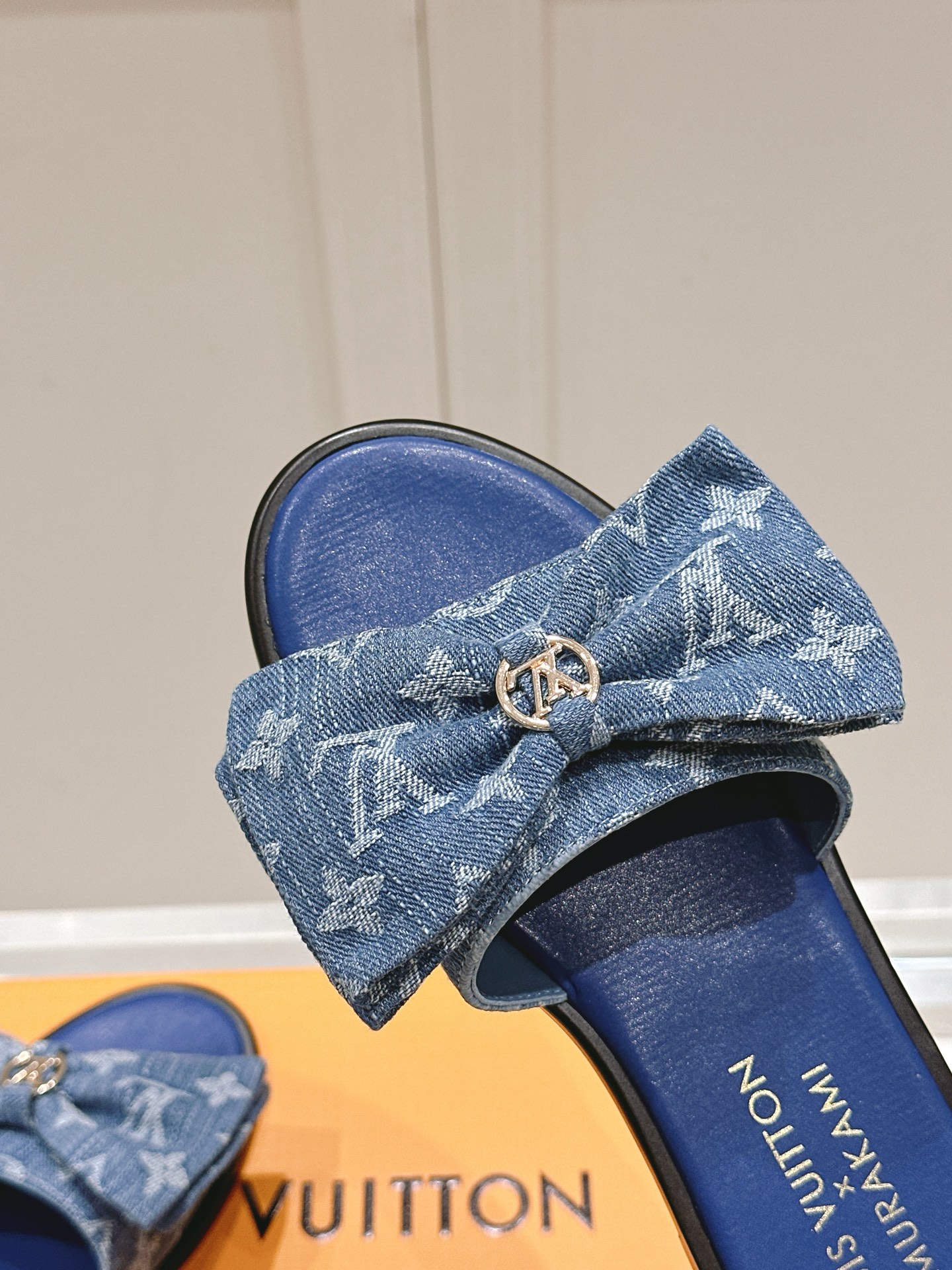 • Design: Open-toe slide sandals featuring a large denim bow and LV emblem