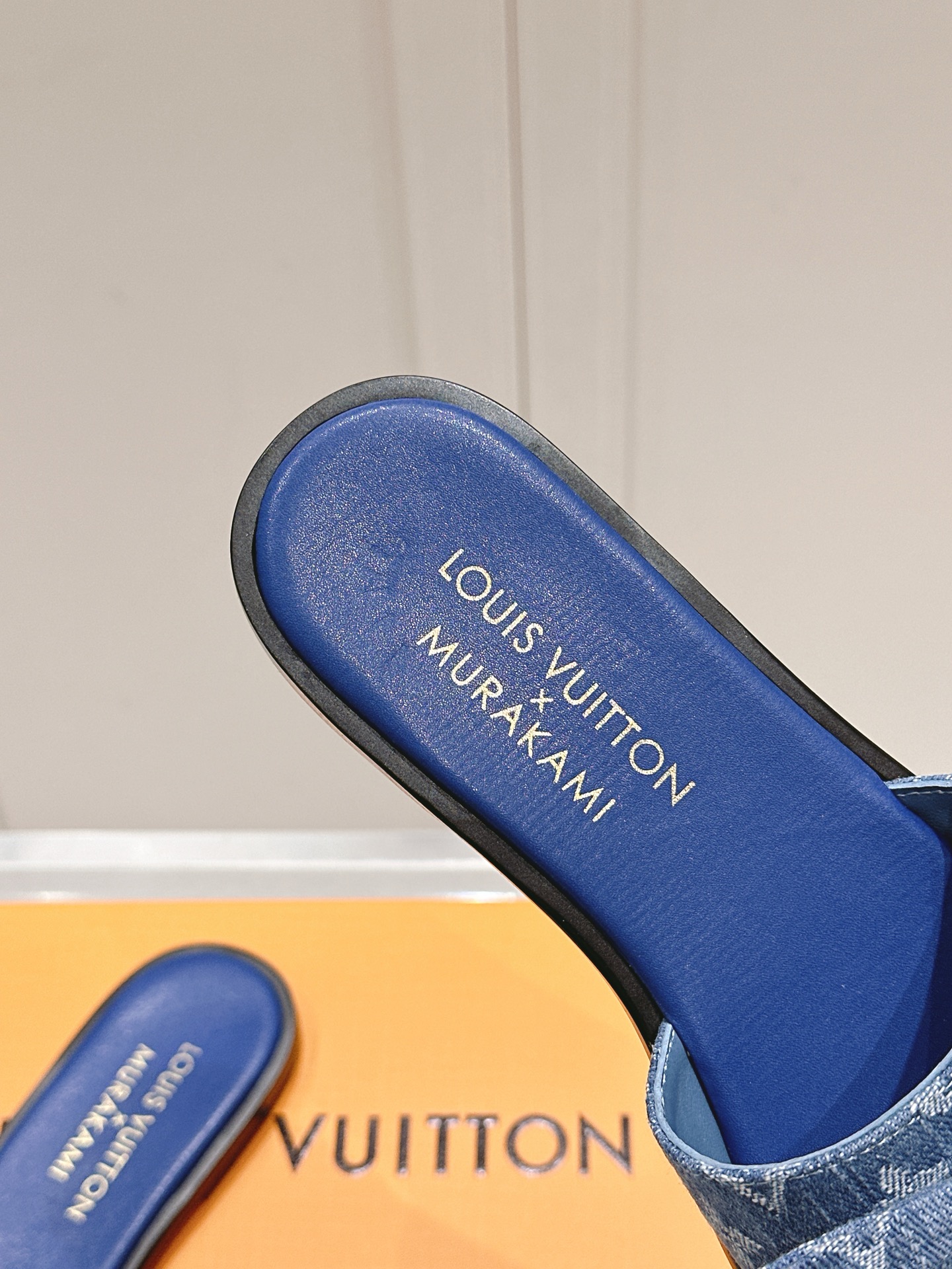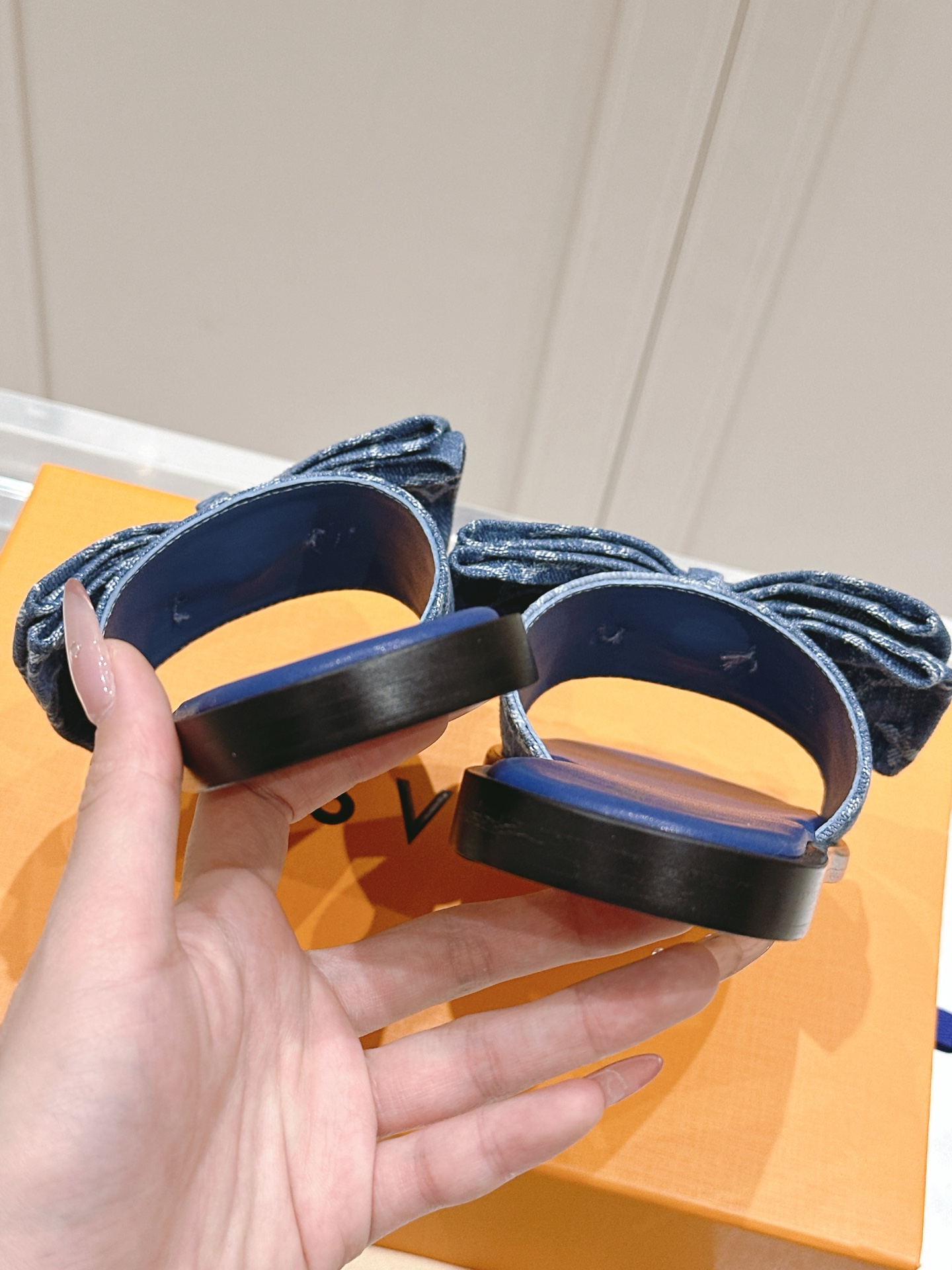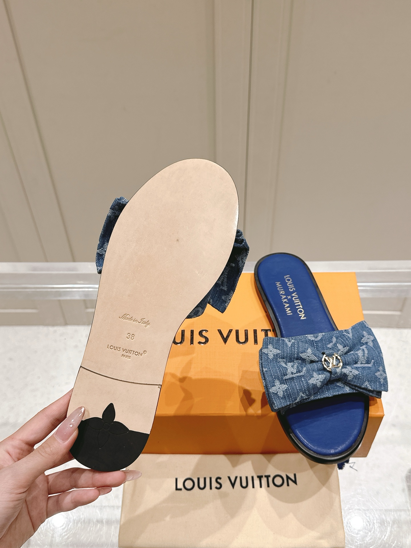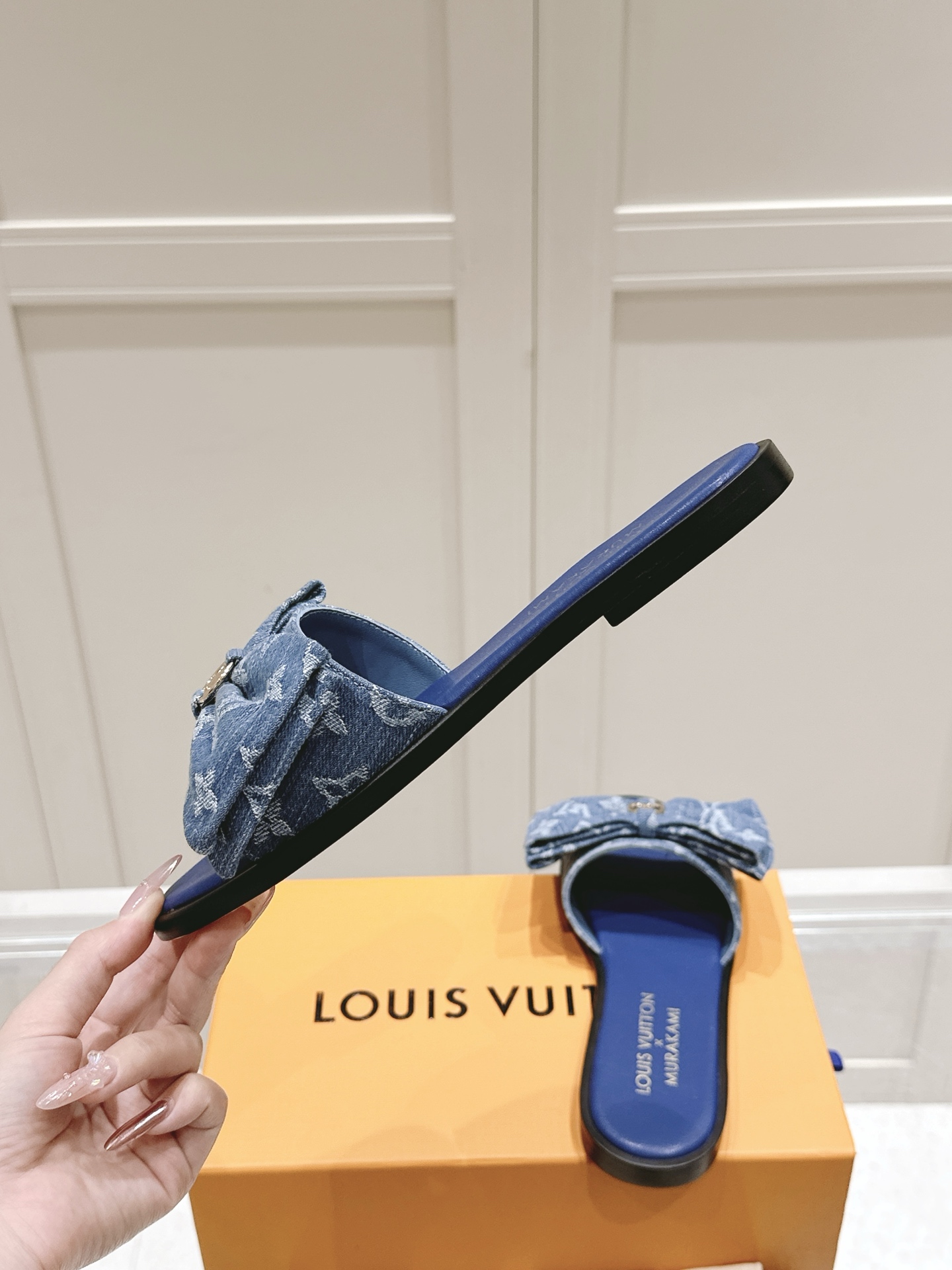 • Design: Open-toe slide sandals featuring a large denim bow and LV emblem