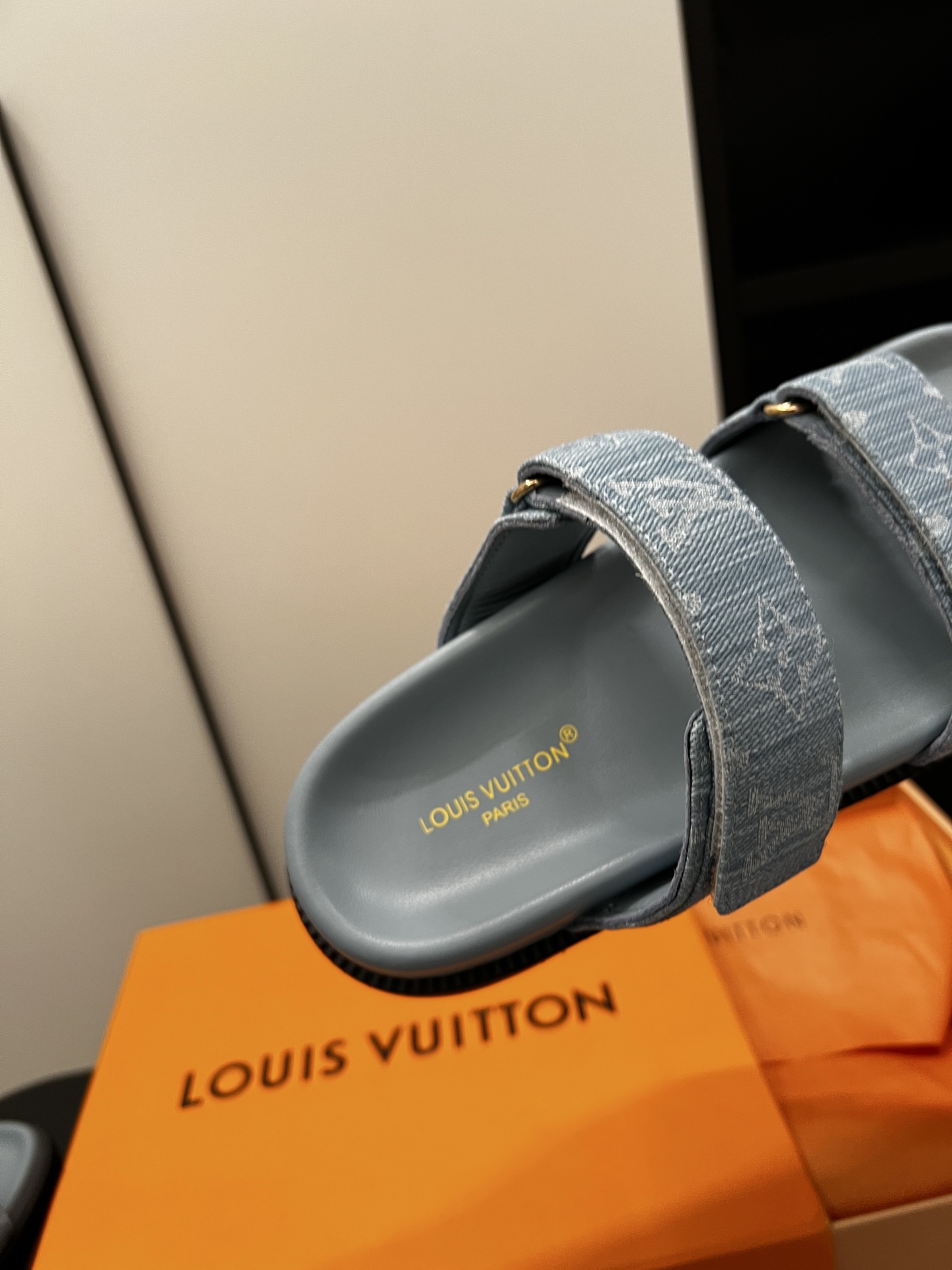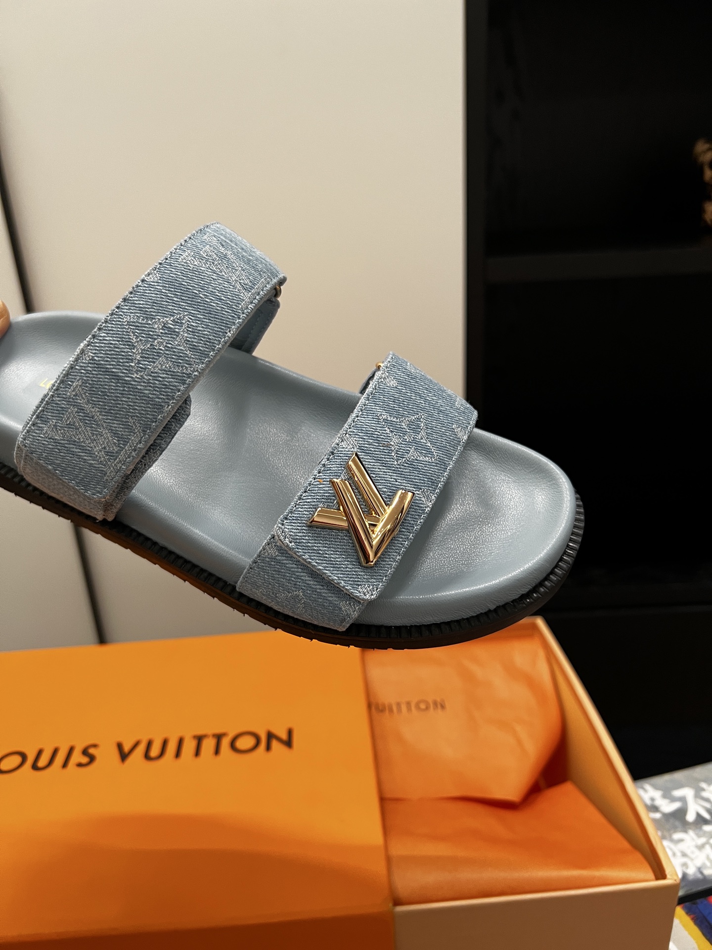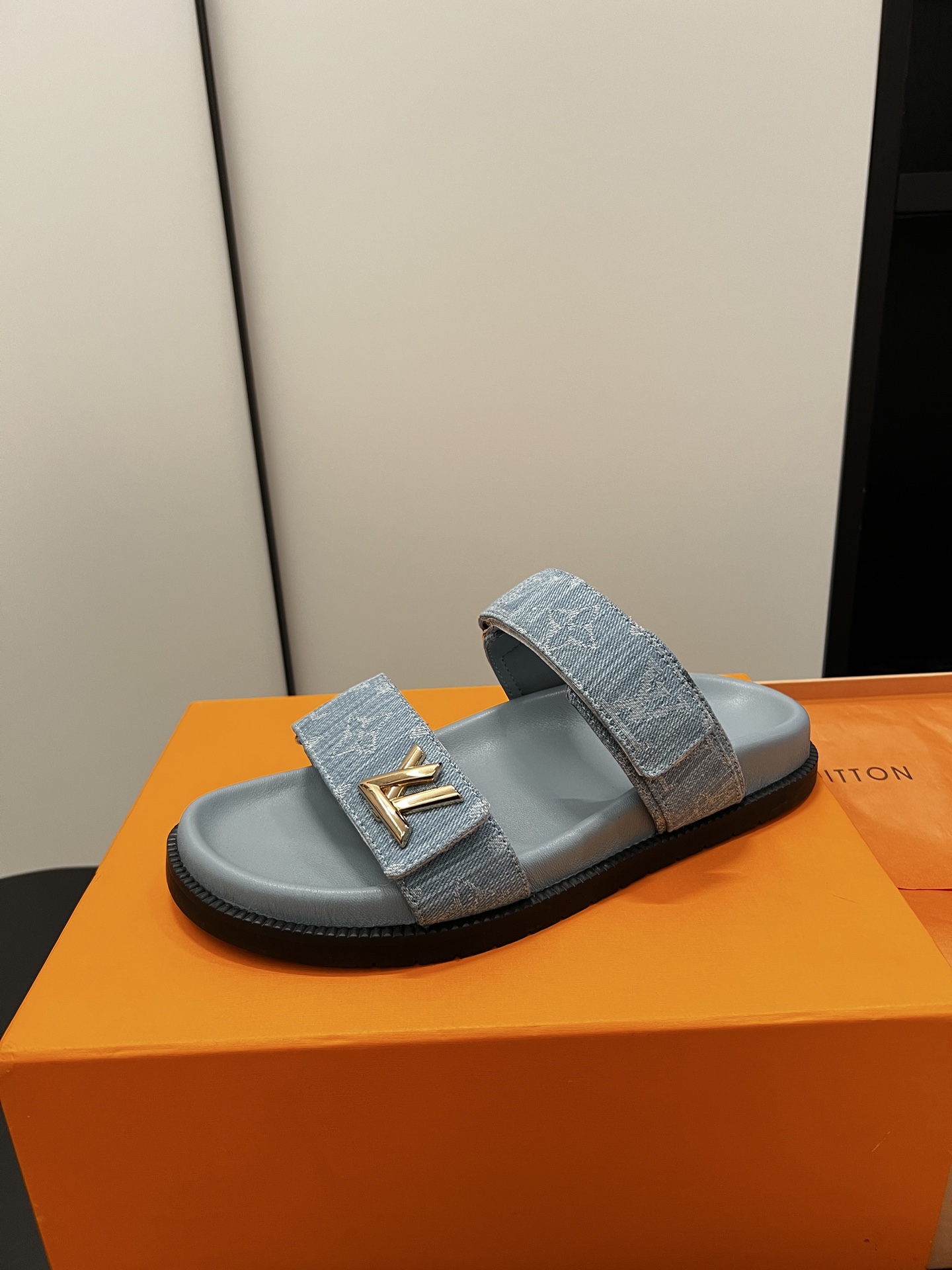 Stylish Louis Vuitton sandals crafted in soft blue denim fabric